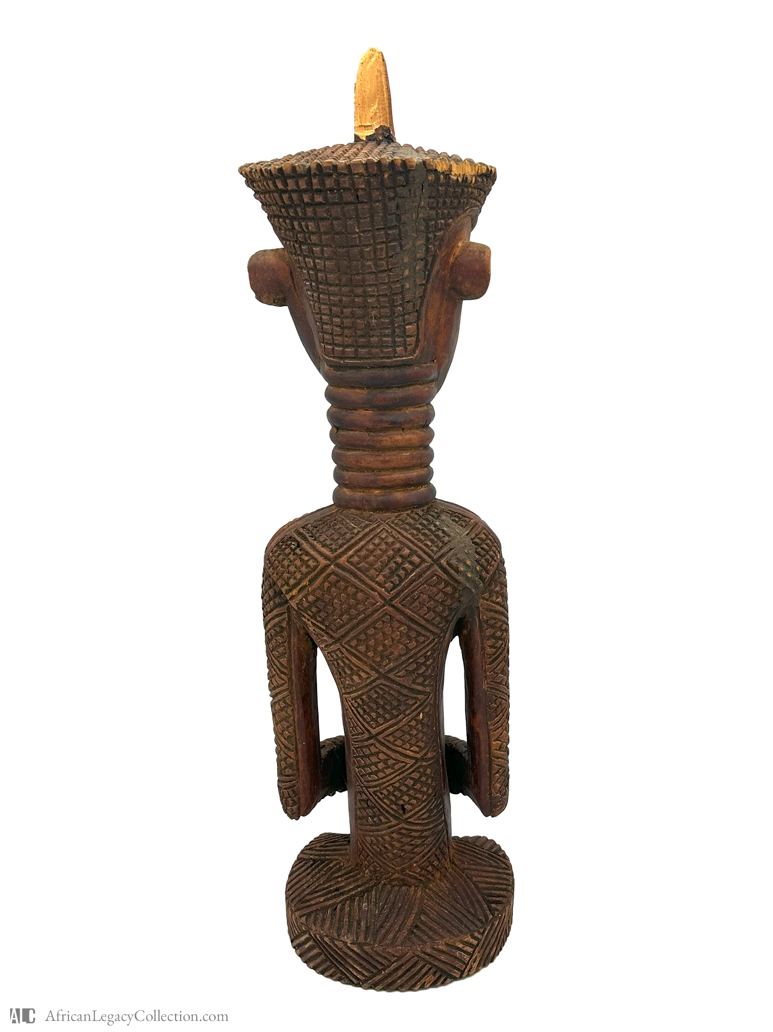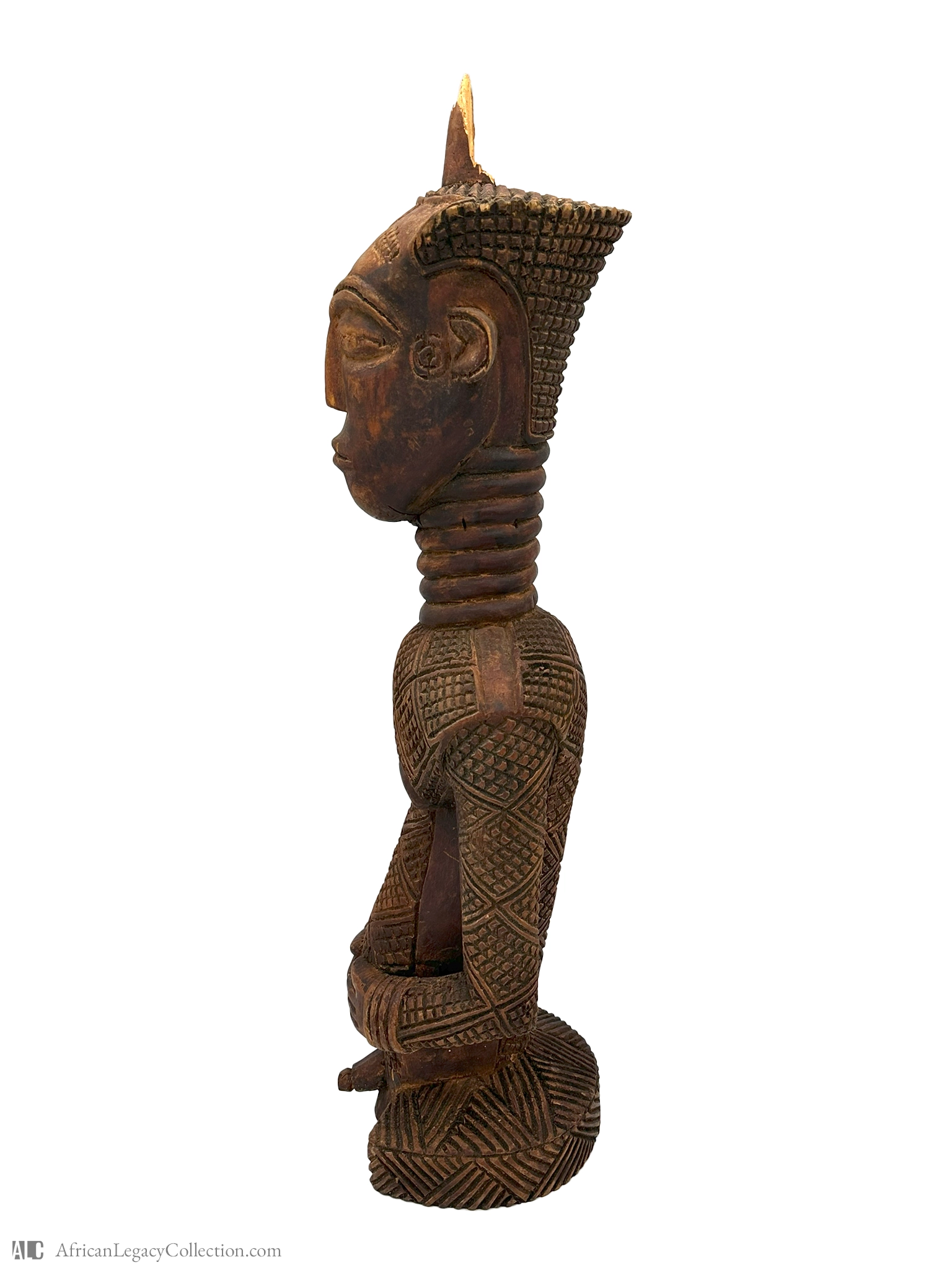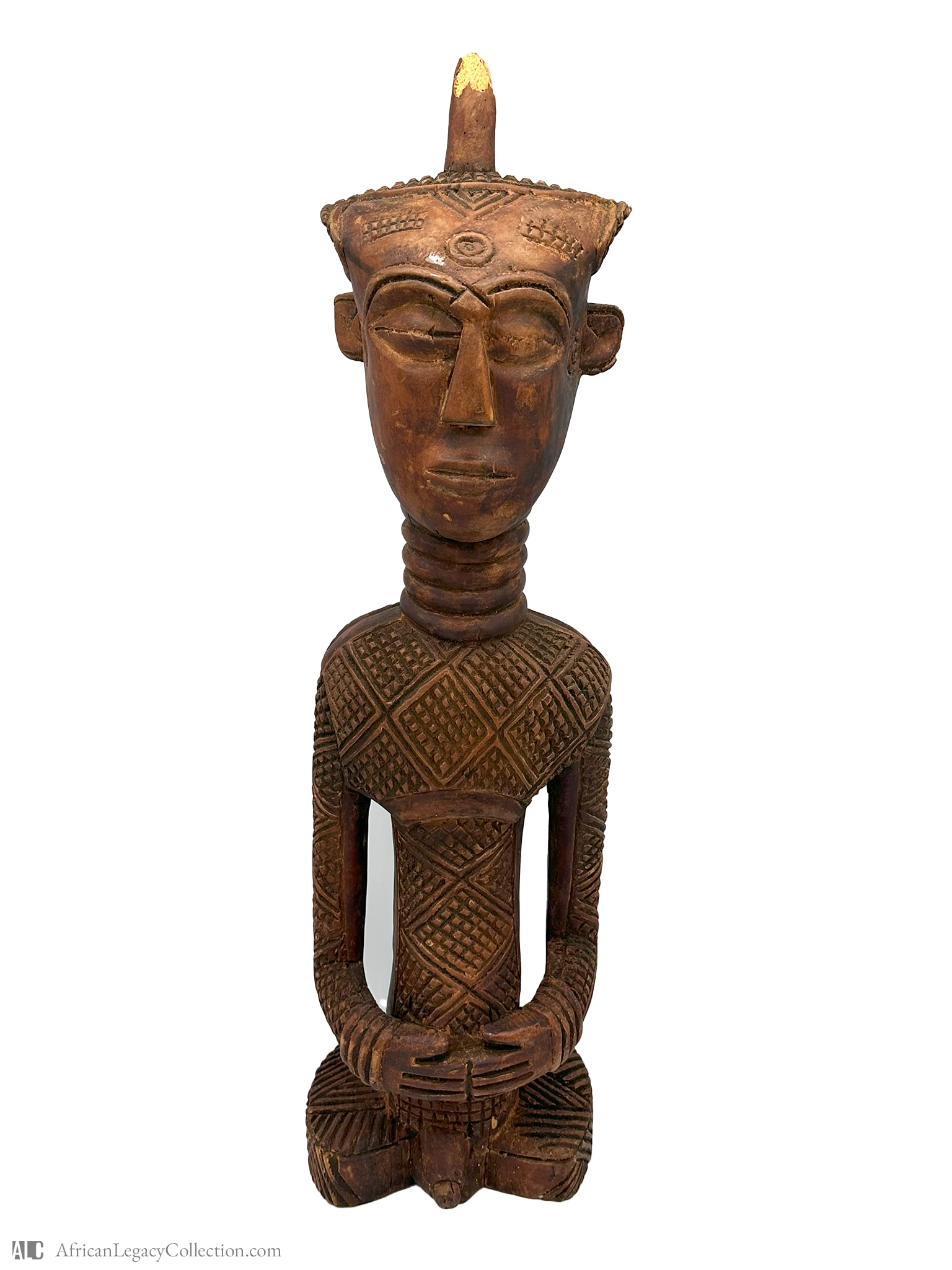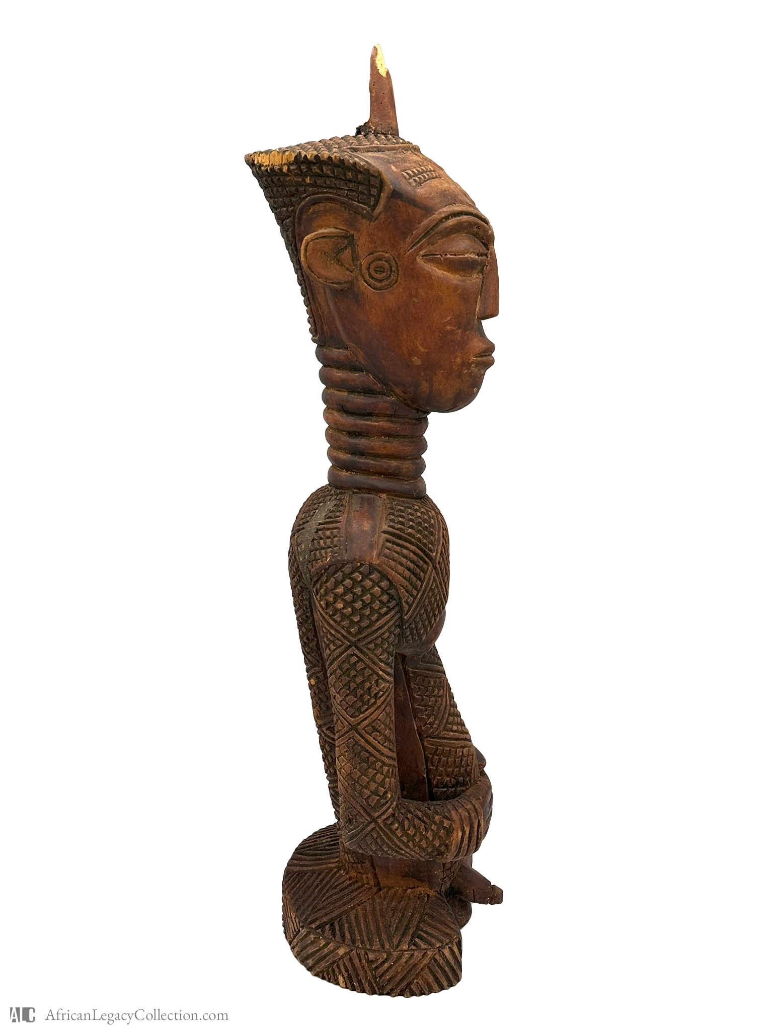 This artifact is a wooden sculpture representing an ancestor or tribal figure, likely originating from the Baule people of West Africa. Its purpose is to serve as a spiritual intermediary, possibly used in rituals or as a protective figure within a household or shrine.