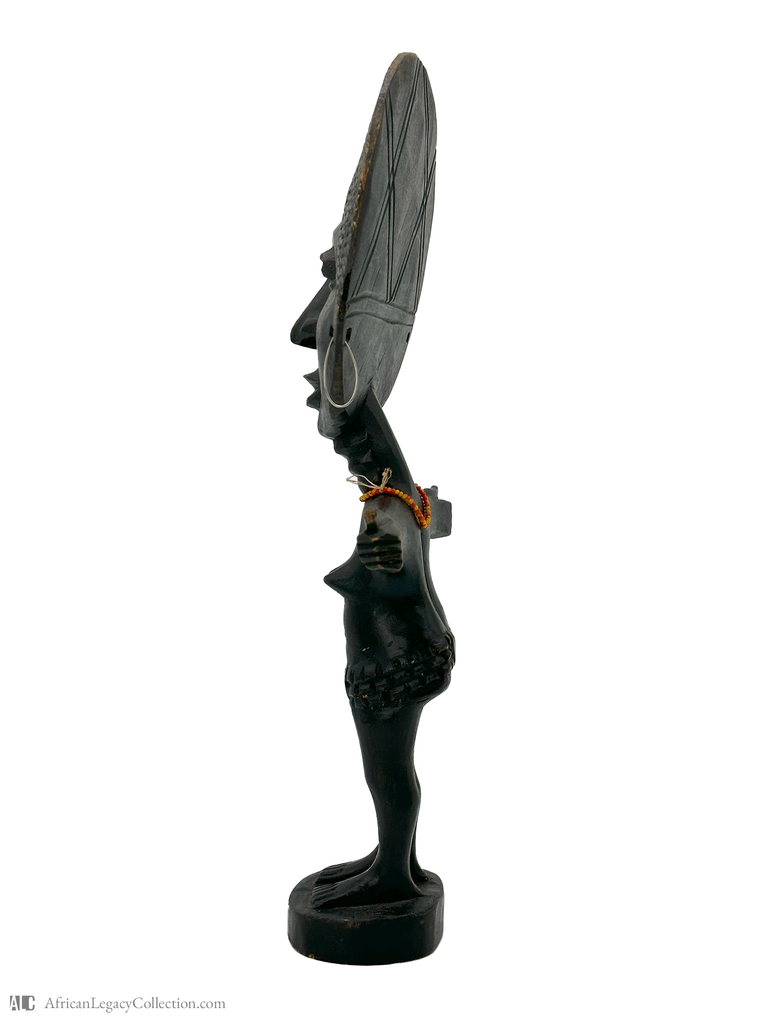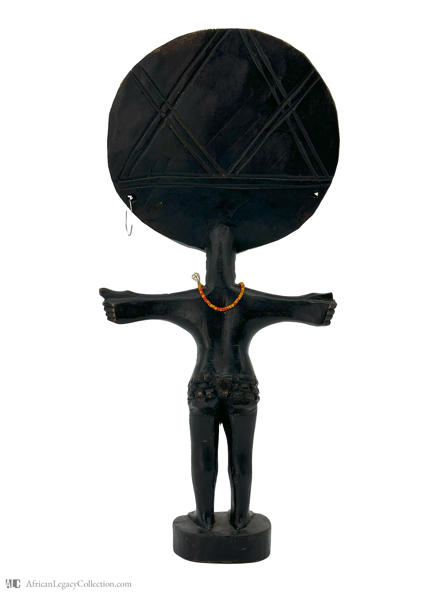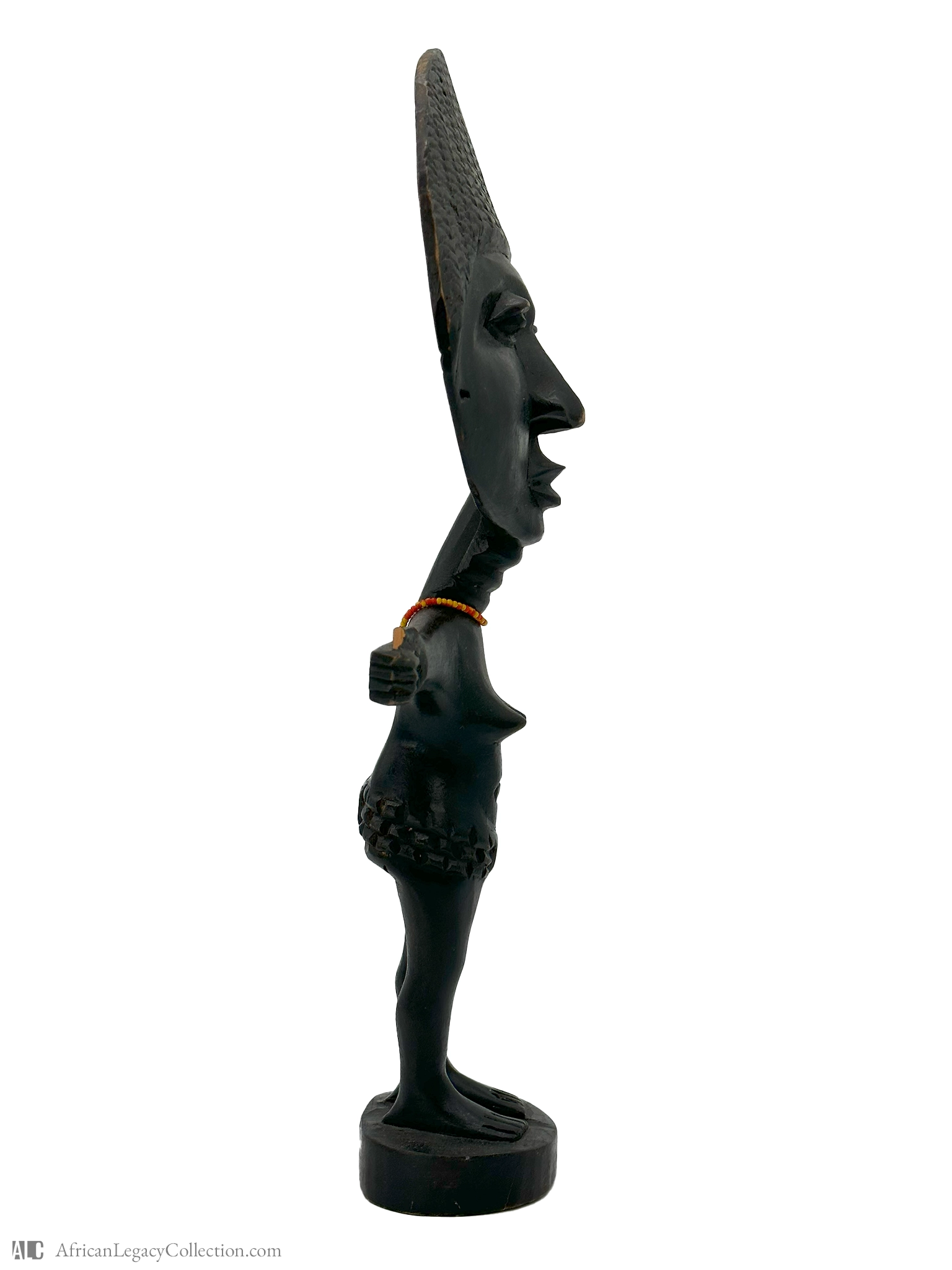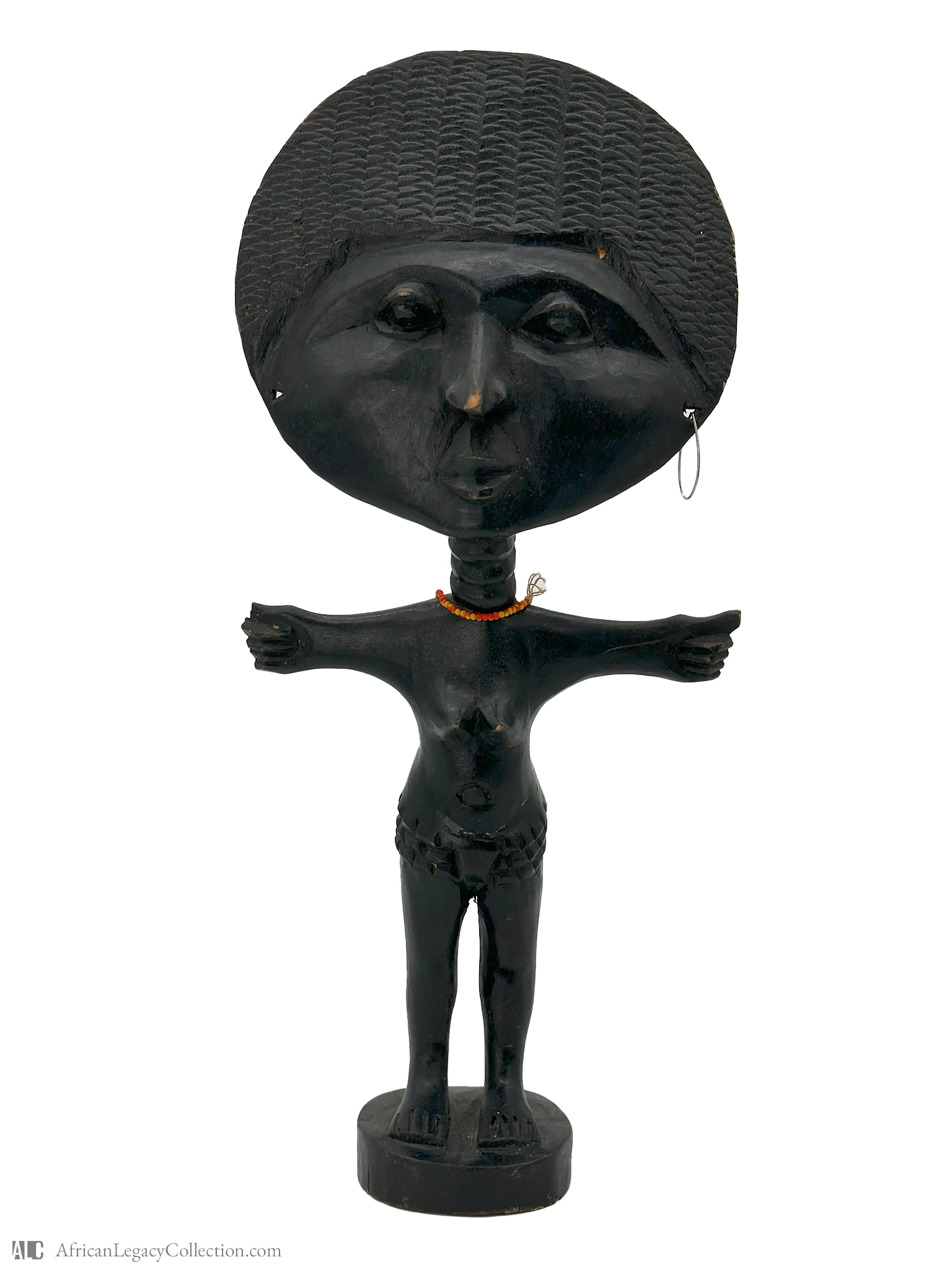 The figure is intricately crafted from wood, displaying expert carving techniques. The historical context places it as a significant piece within the Ashanti culture, highlighting their artistic skill and cultural practices around fertility. Its anthropomorphic design reflects the spiritual beliefs and social values of the community.