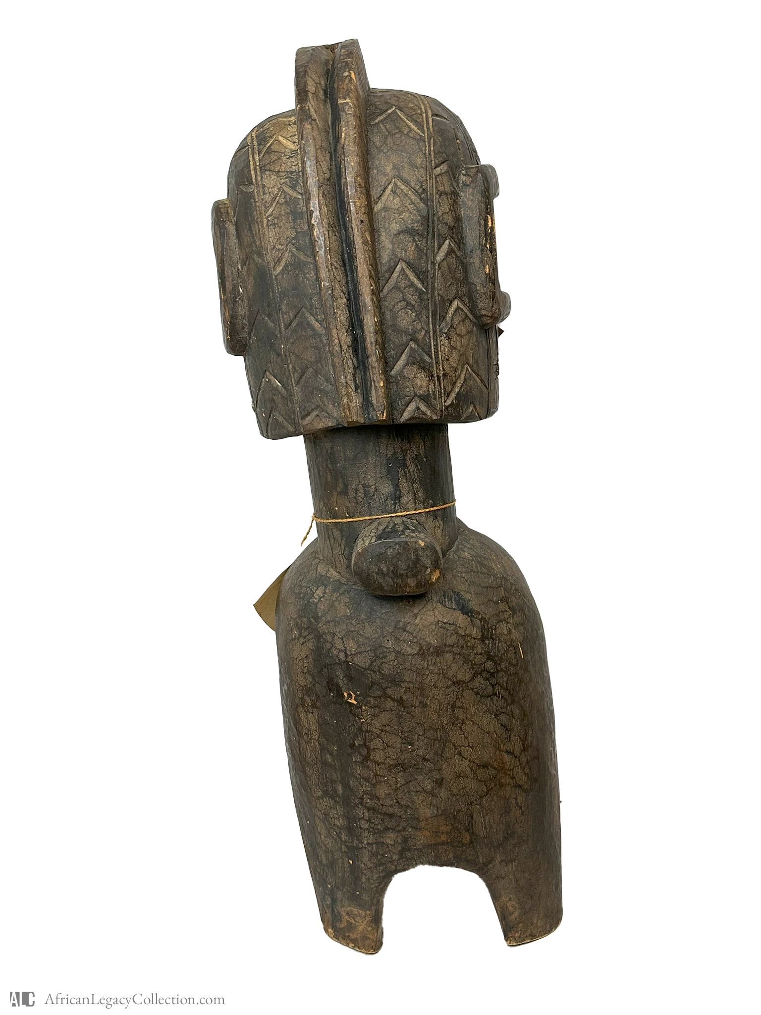 Crafted primarily from wood, the sculpture exhibits intricate incised striations and scarification motifs, emphasizing its cultural significance. Historically, such figures are linked to social rituals that celebrate and invoke fertility. They also exemplify the rich artistic heritage and spiritual beliefs of the region.