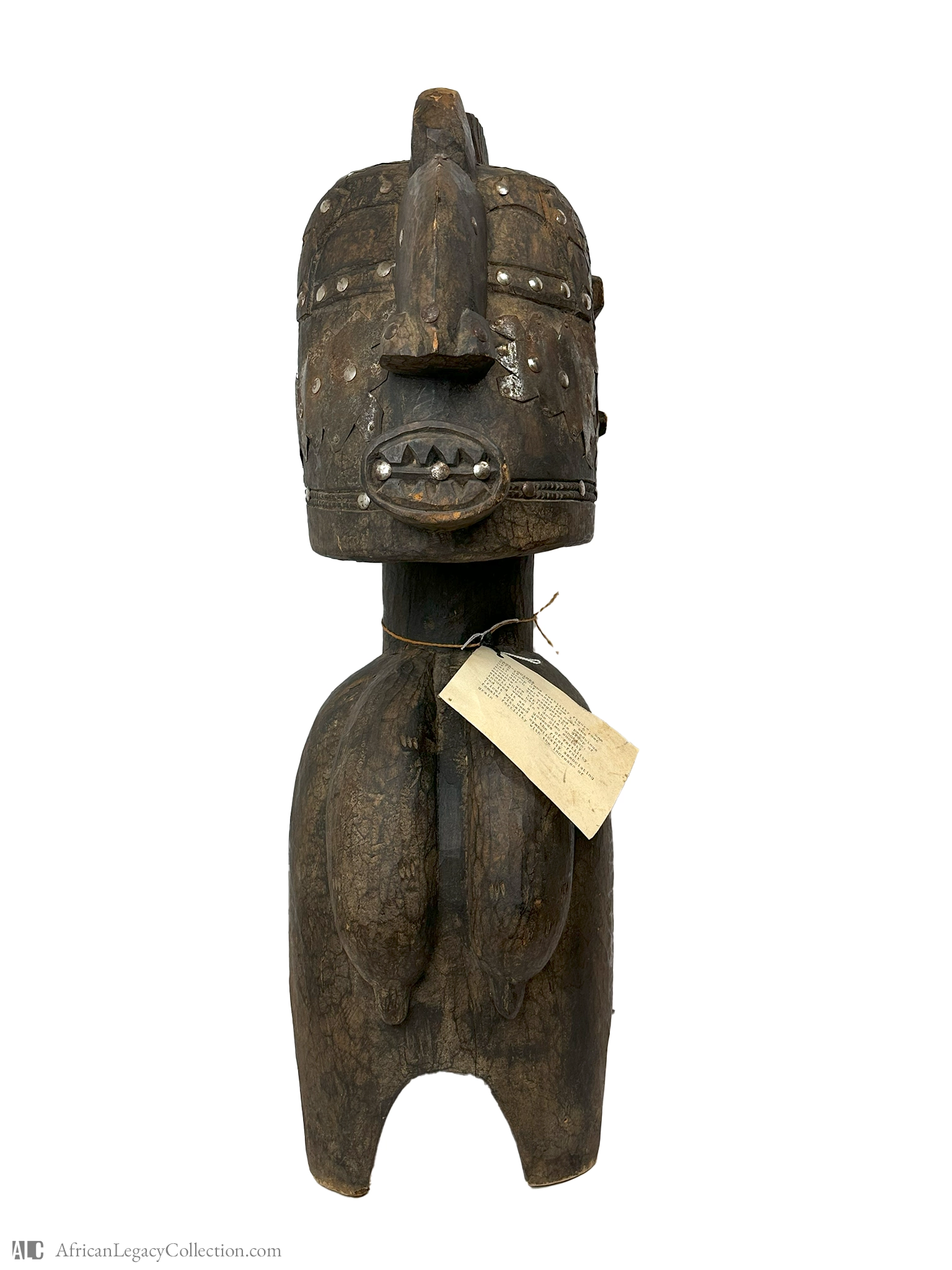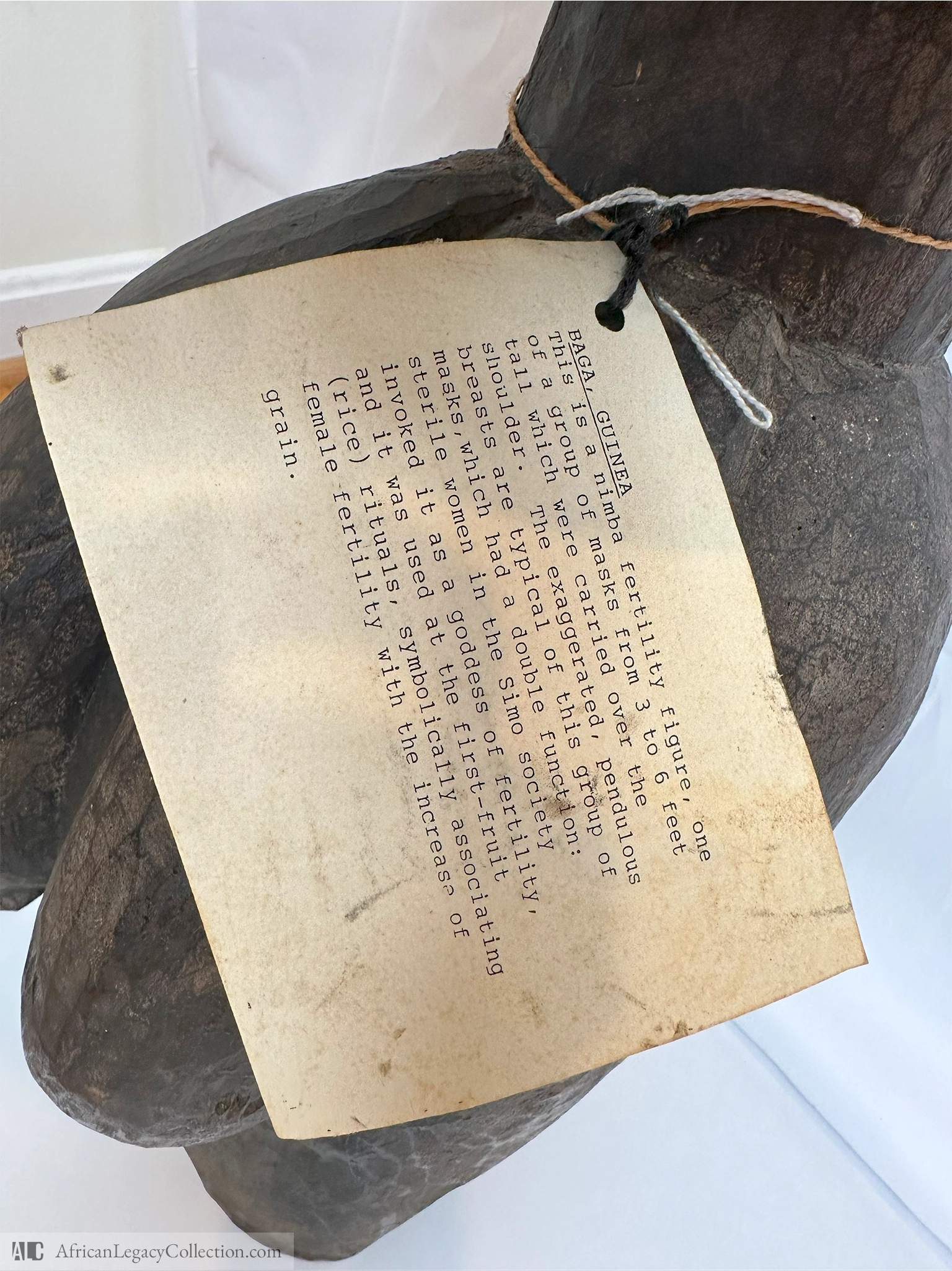 This artifact is a fertility figure likely from the Baga people of West Africa. The piece serves a significant role in traditional fertility practices and rituals, embodying themes of growth and prosperity. It features distinctive stylistic choices associated with ceremonial and symbolic purposes.