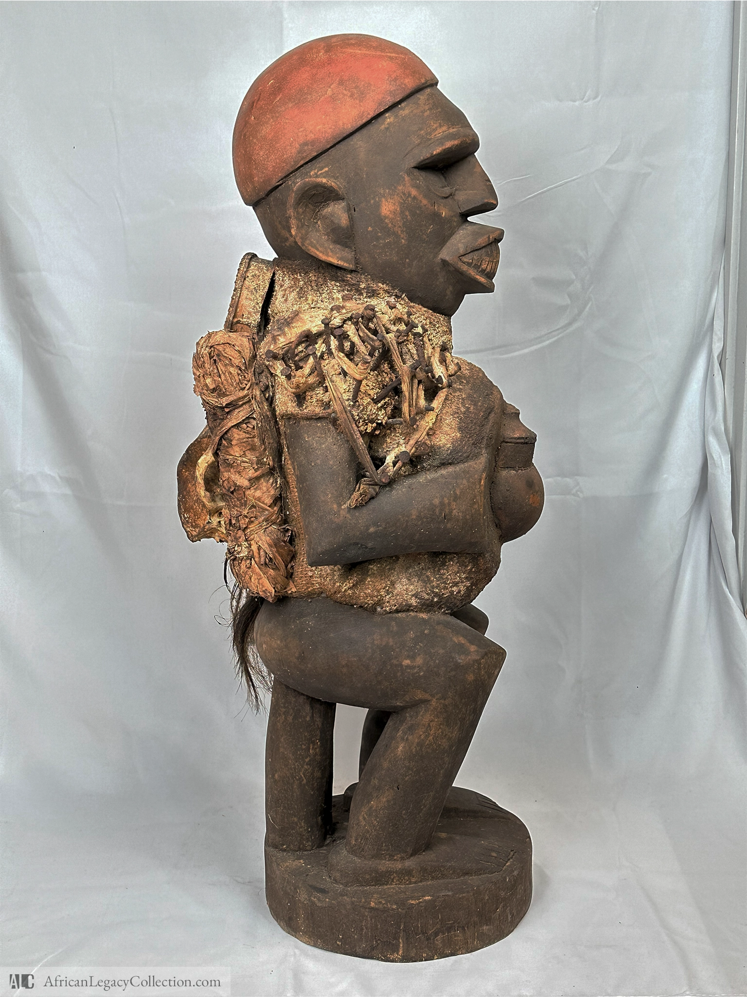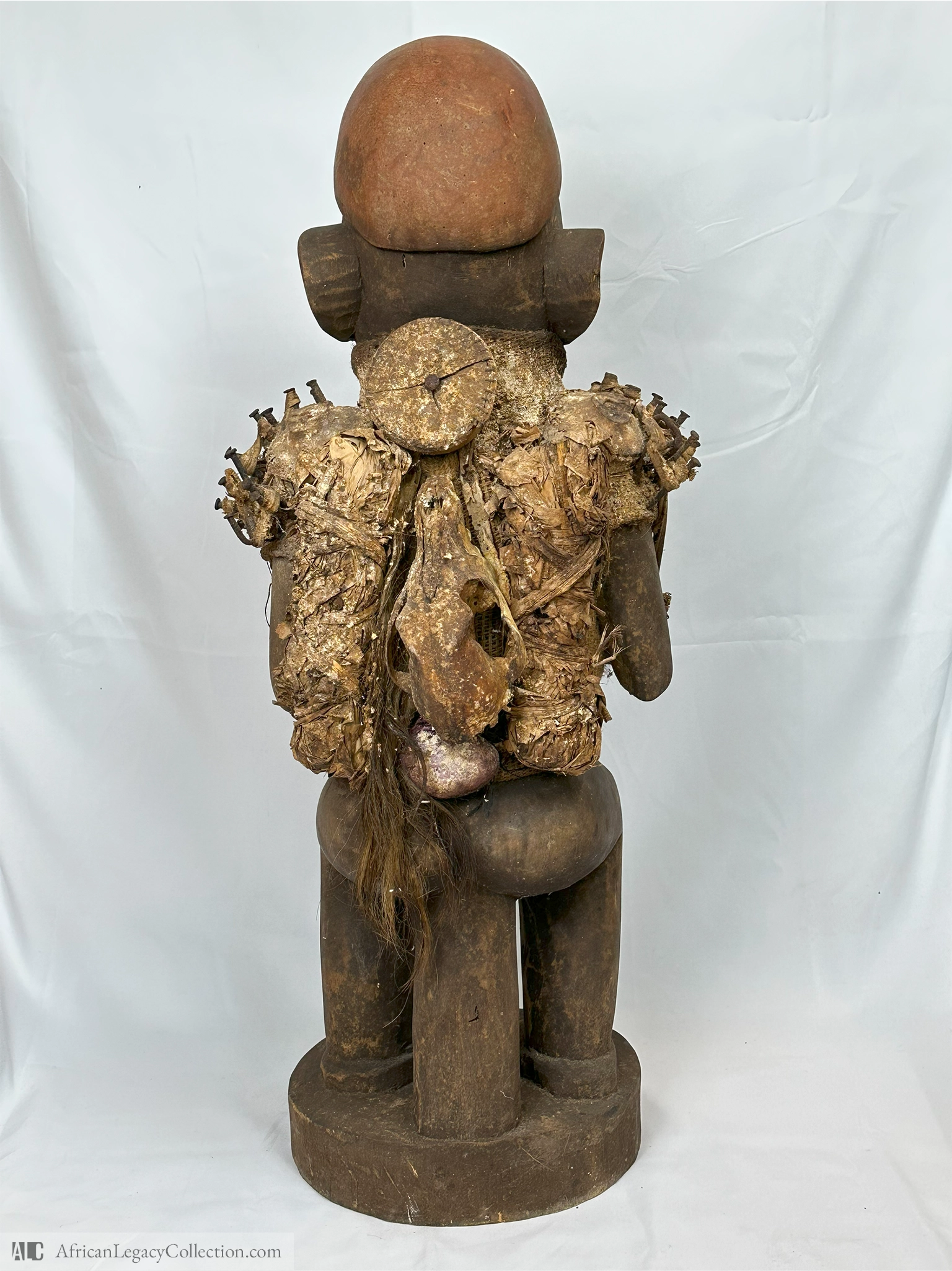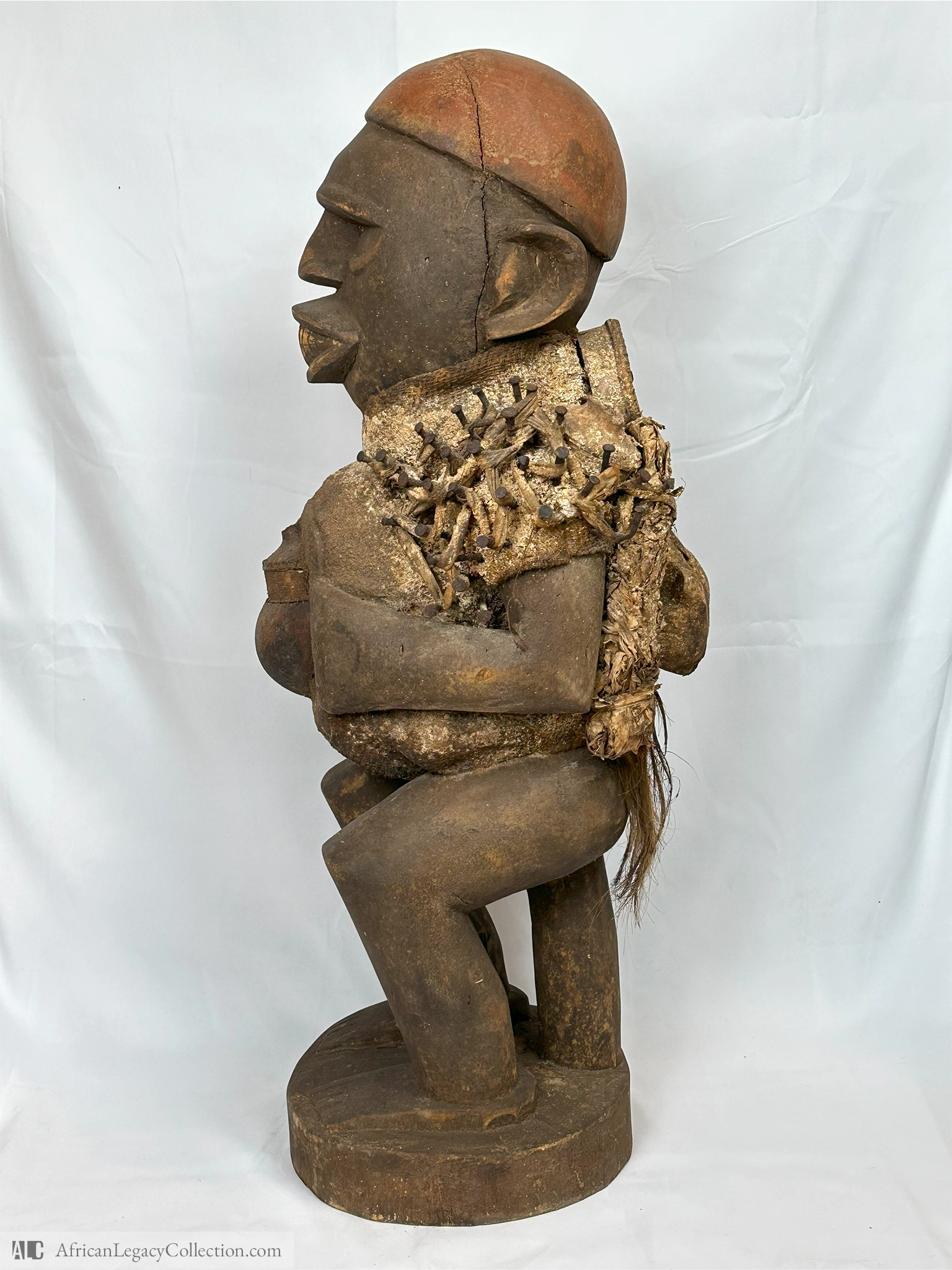 Crafted primarily from wood, the figure incorporates organic materials as well. It represents the rich artistic tradition of the late 19th to early 20th century in Central Africa. The nails and embedded elements reflect its historical use in rituals, conferring social and spiritual significance to its role within the community.