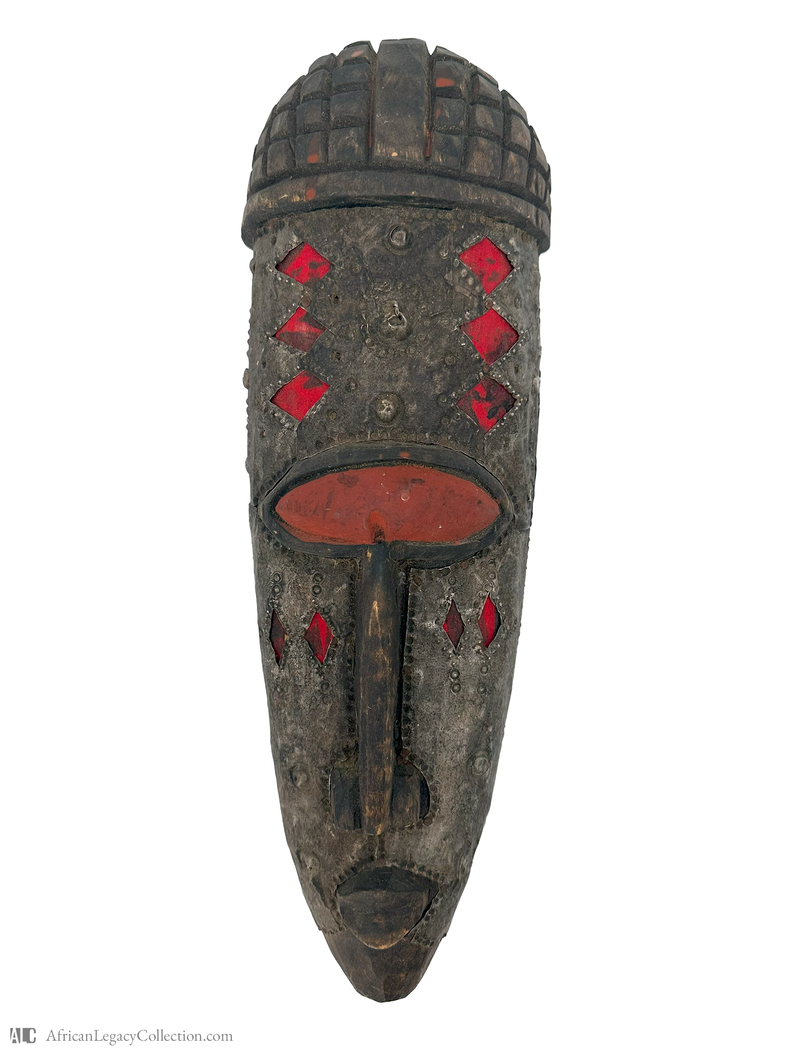 This African mask is likely representative of ceremonial purposes, possibly originating from West Africa. The mask’s stylized features and intricate design suggest its use in cultural rituals and storytelling, serving as a spiritual or symbolic object within the community.