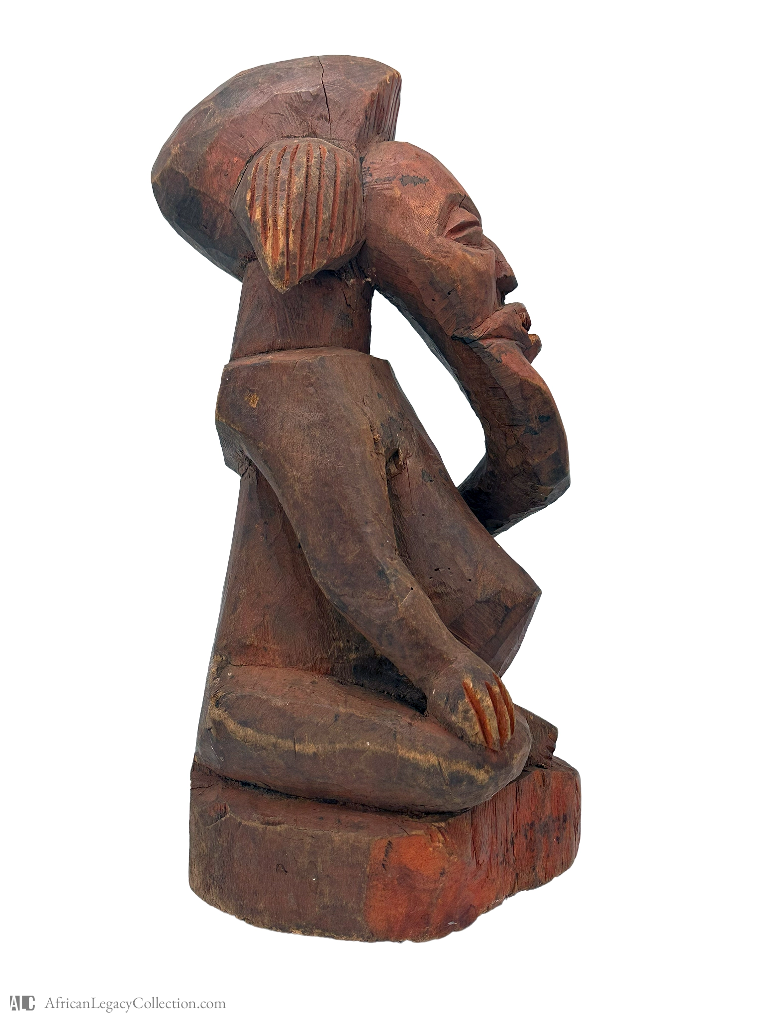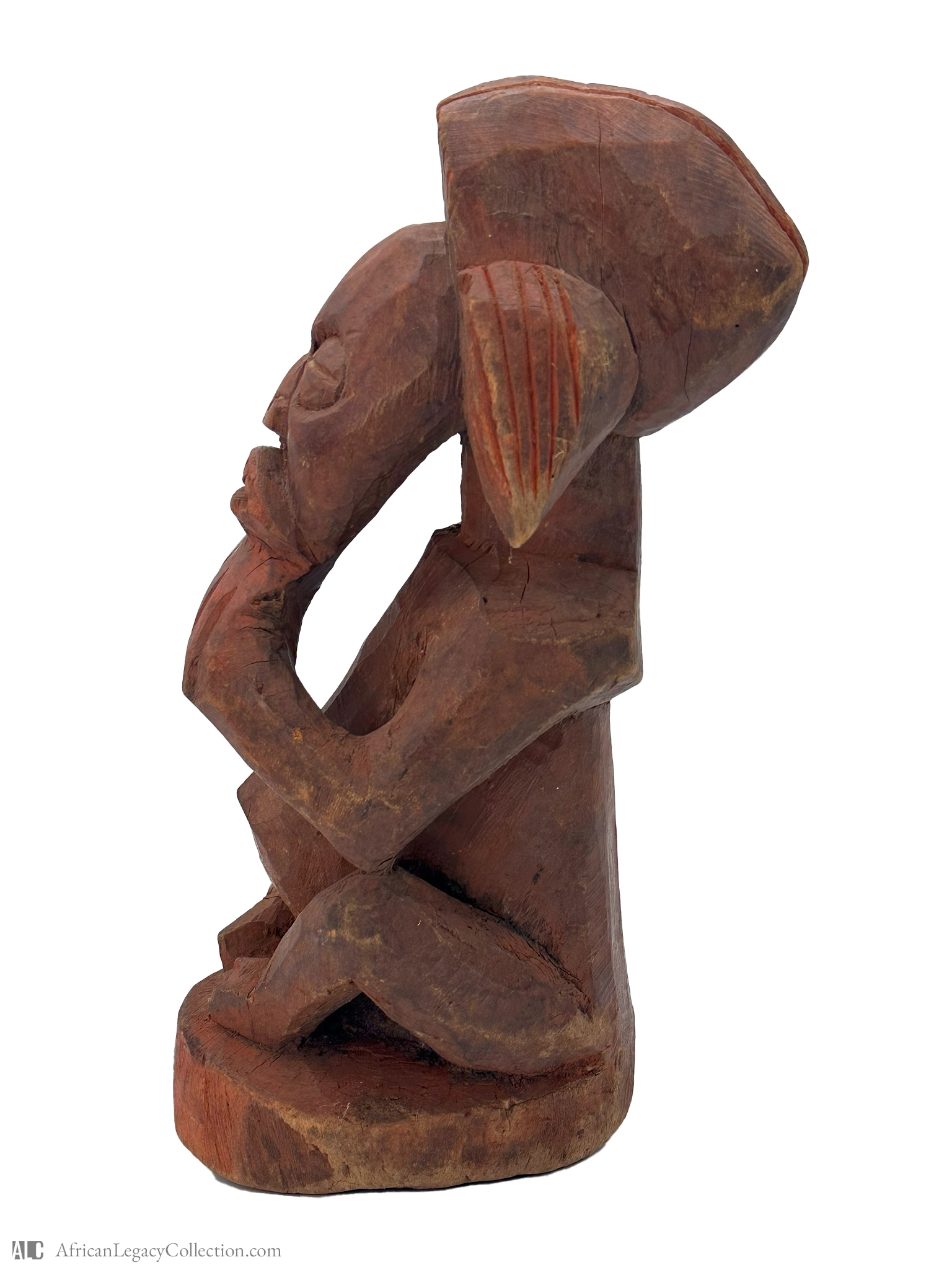 This carved wooden figure likely originates from West Africa and may have been created for ritual or ceremonial purposes. The figure’s seated position and contemplative facial expression suggest it could represent a revered ancestor or a spiritual figure within the community.