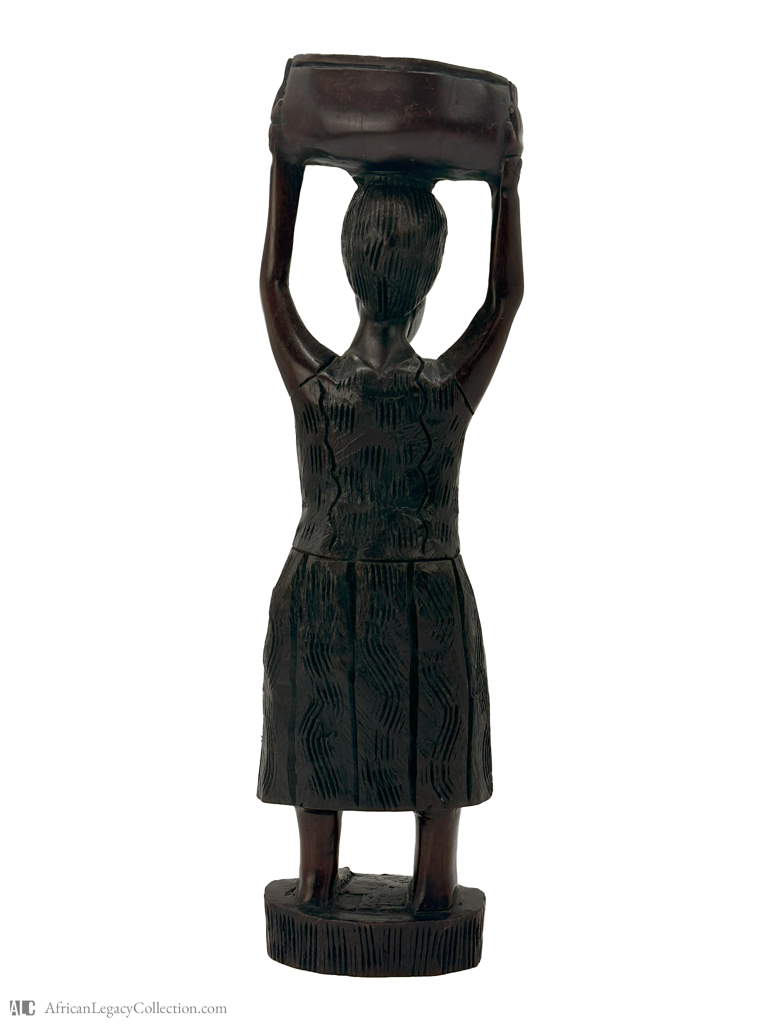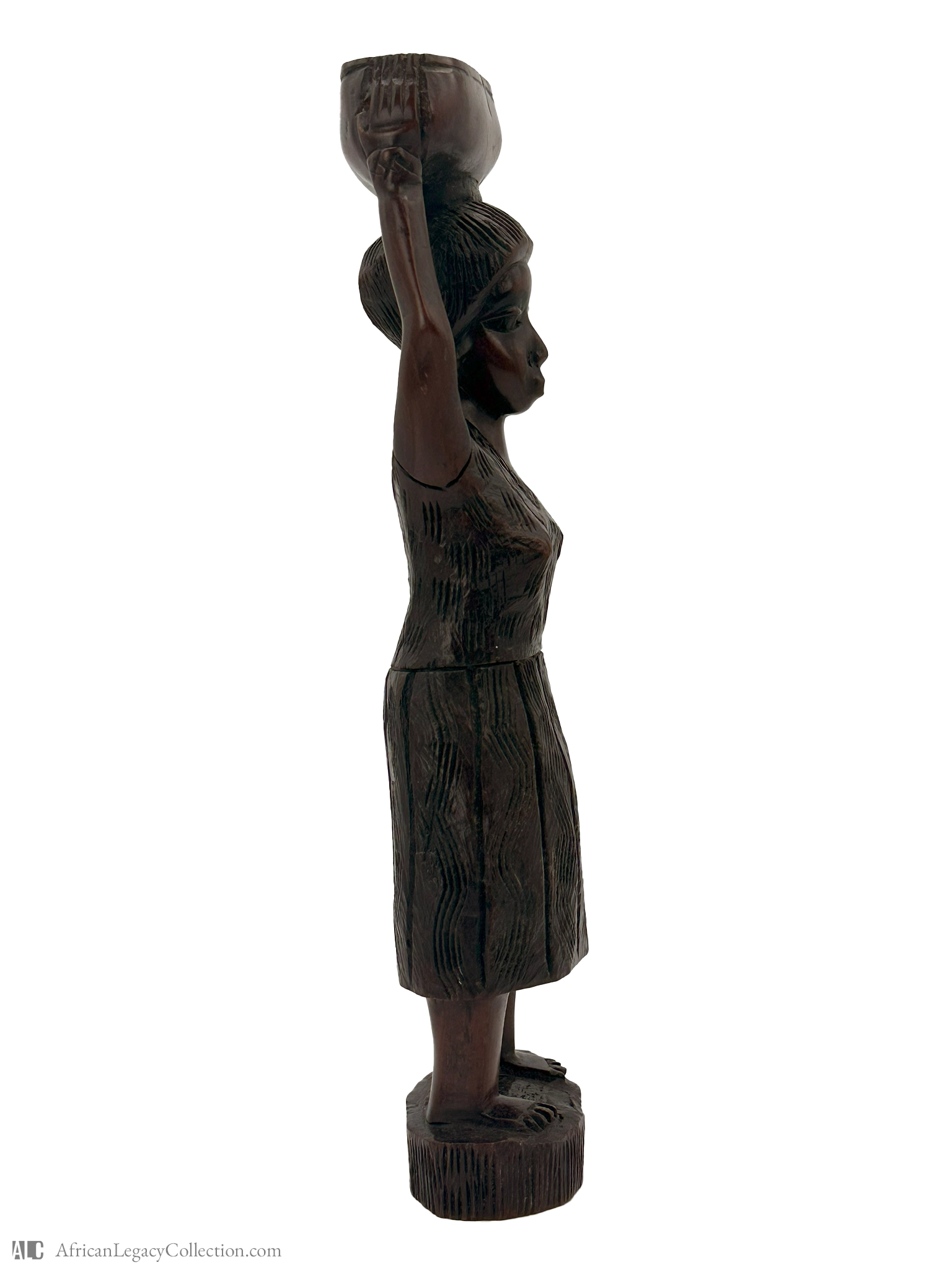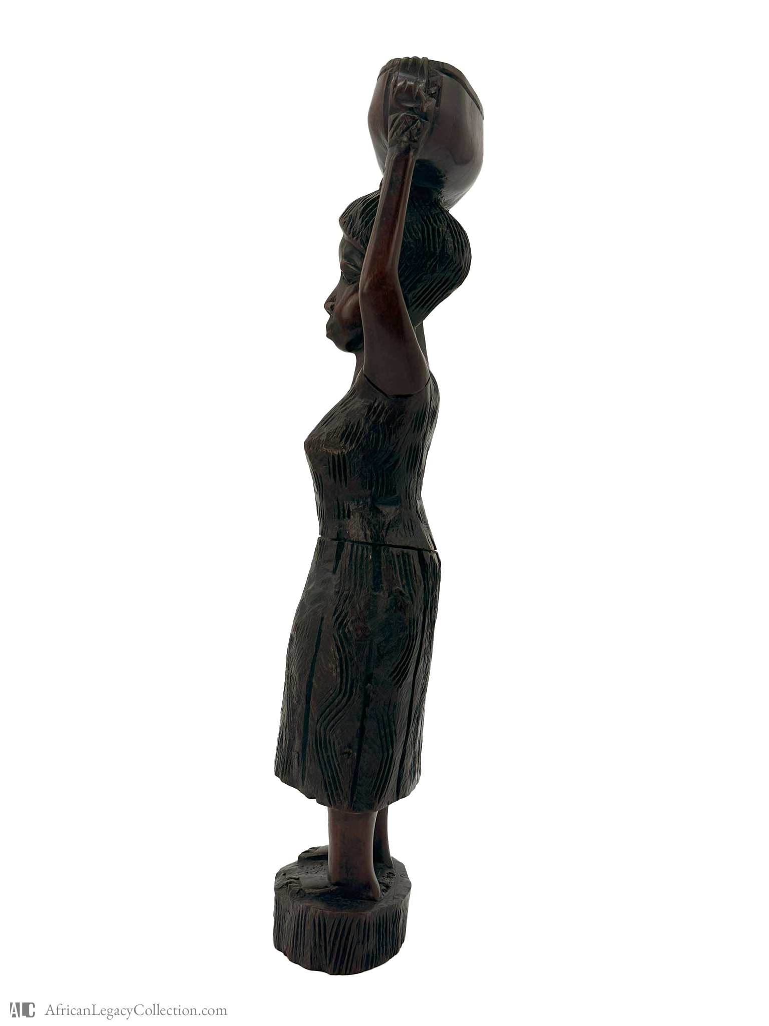 This wooden sculpture depicts a woman carrying a vessel on her head, likely originating from West Africa. The figure serves both an artistic and cultural purpose, representing daily life and the traditional roles within certain communities.