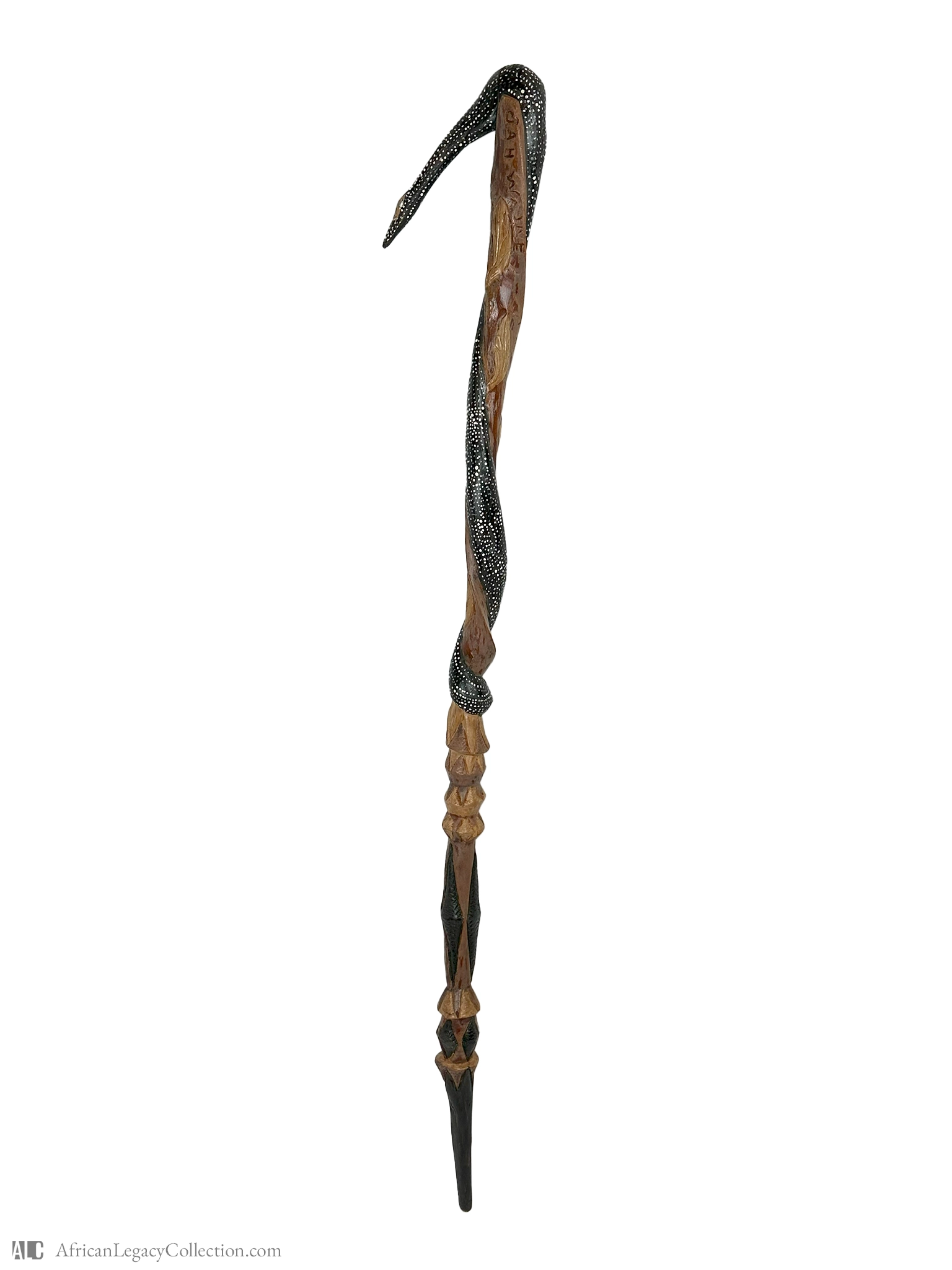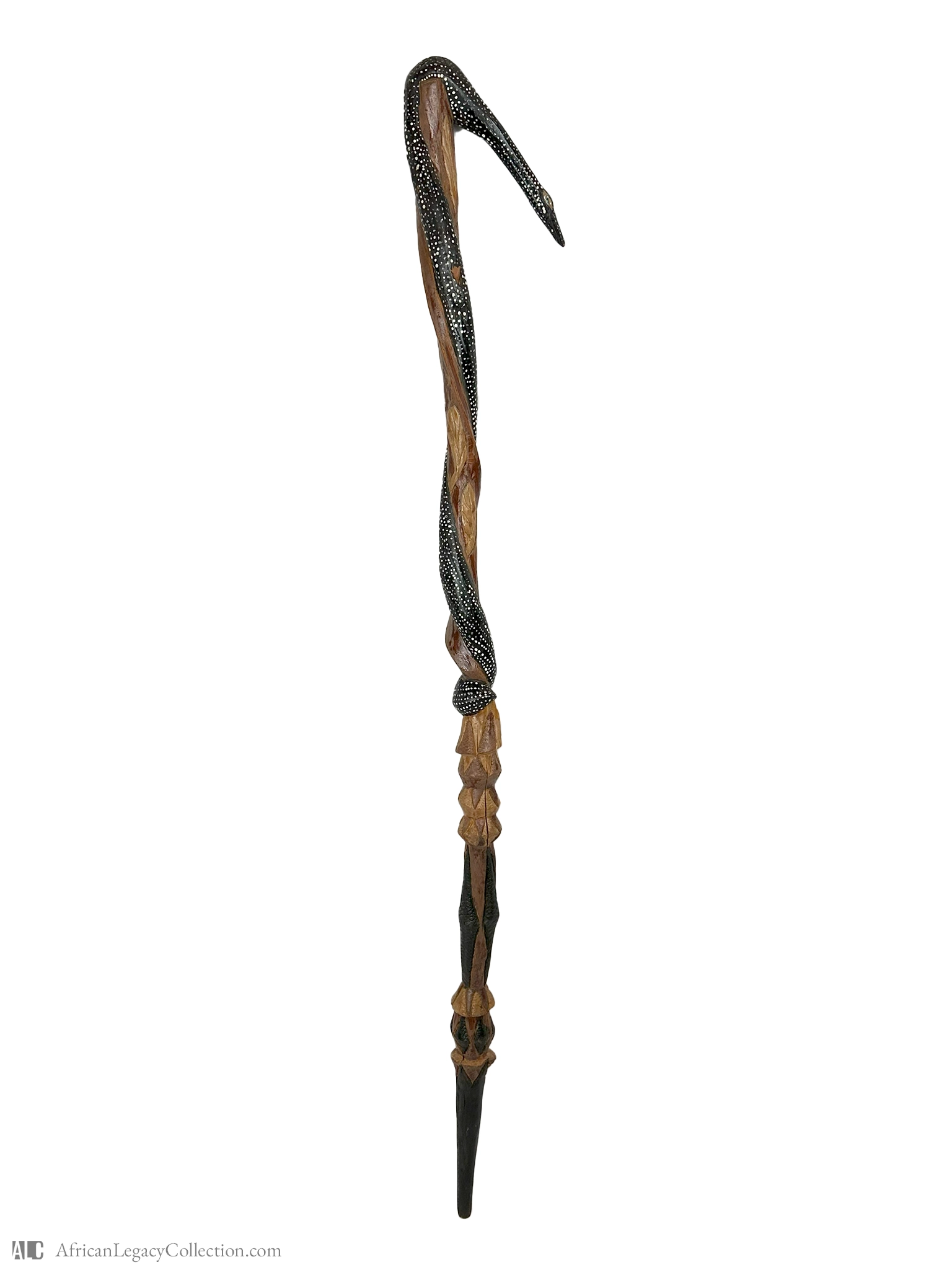 This intricately carved walking stick likely originates from West Africa, where such items often serve not only as supports but also as symbols of prestige and social status. The stick features a detailed snake motif, suggesting it might have been used in ceremonial contexts, embodying cultural symbolism associated with protection and wisdom.