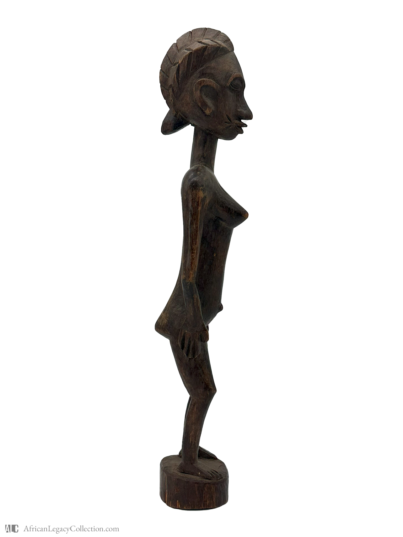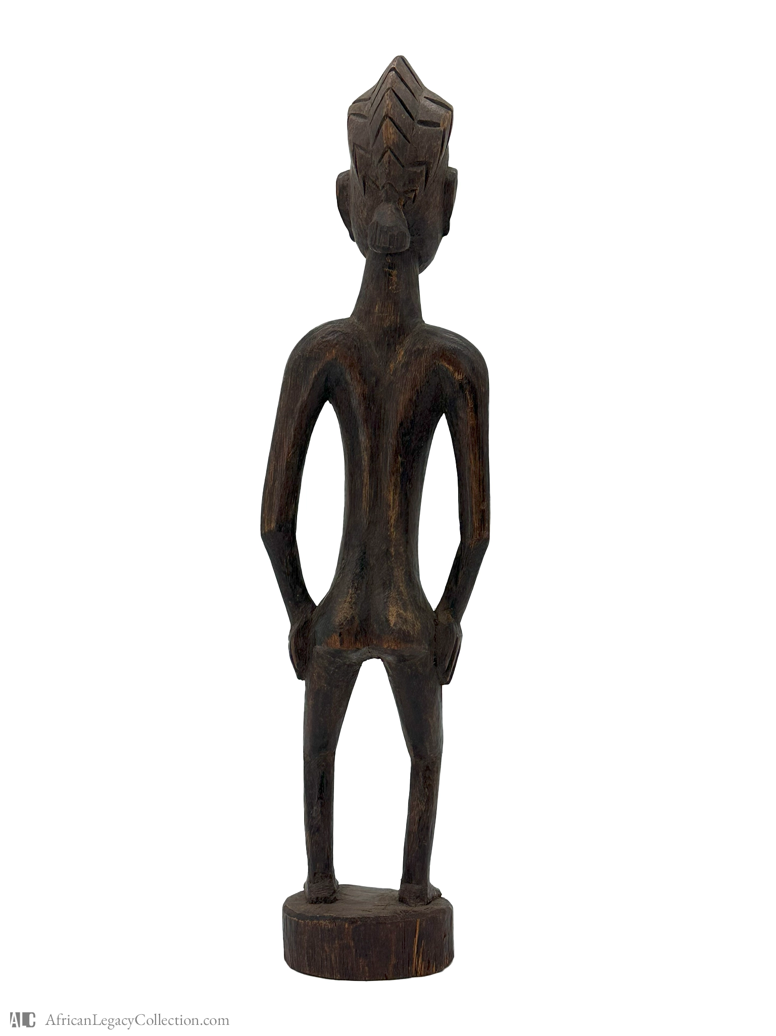 This wooden sculpture likely originates from West Africa and is a representation of an ancestral figure, often used in rituals or as a cultural emblem. Such figures are typically crafted to honor ancestors or convey social and spiritual beliefs within a community.