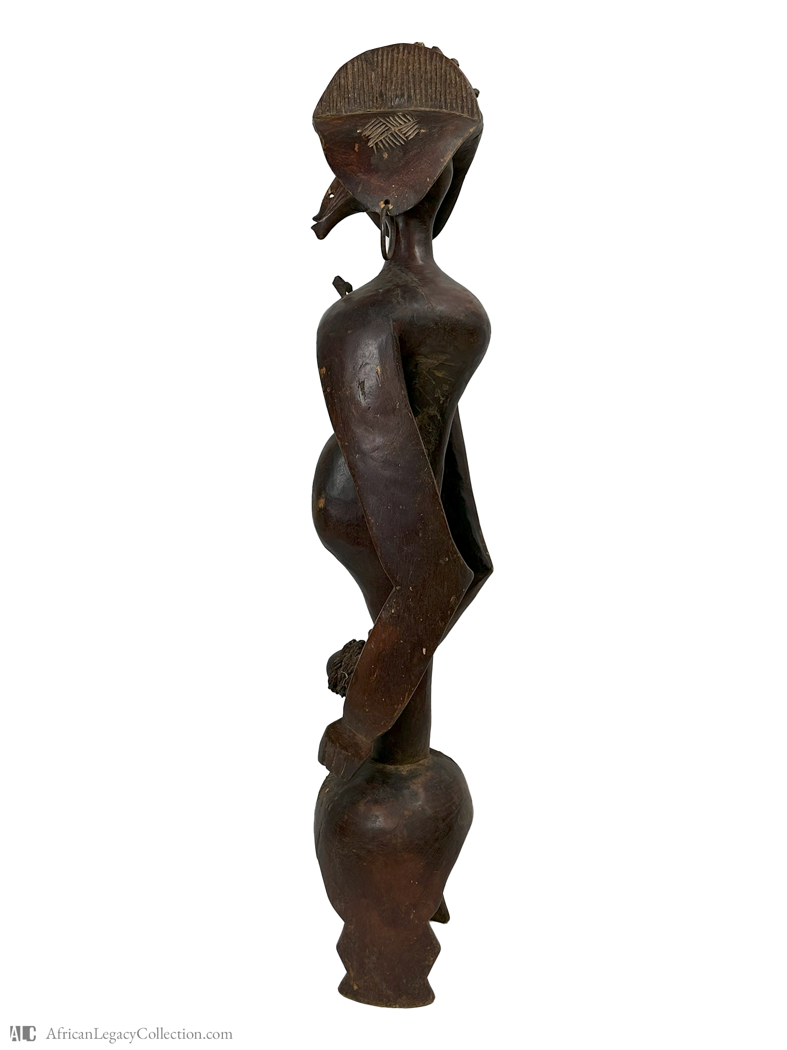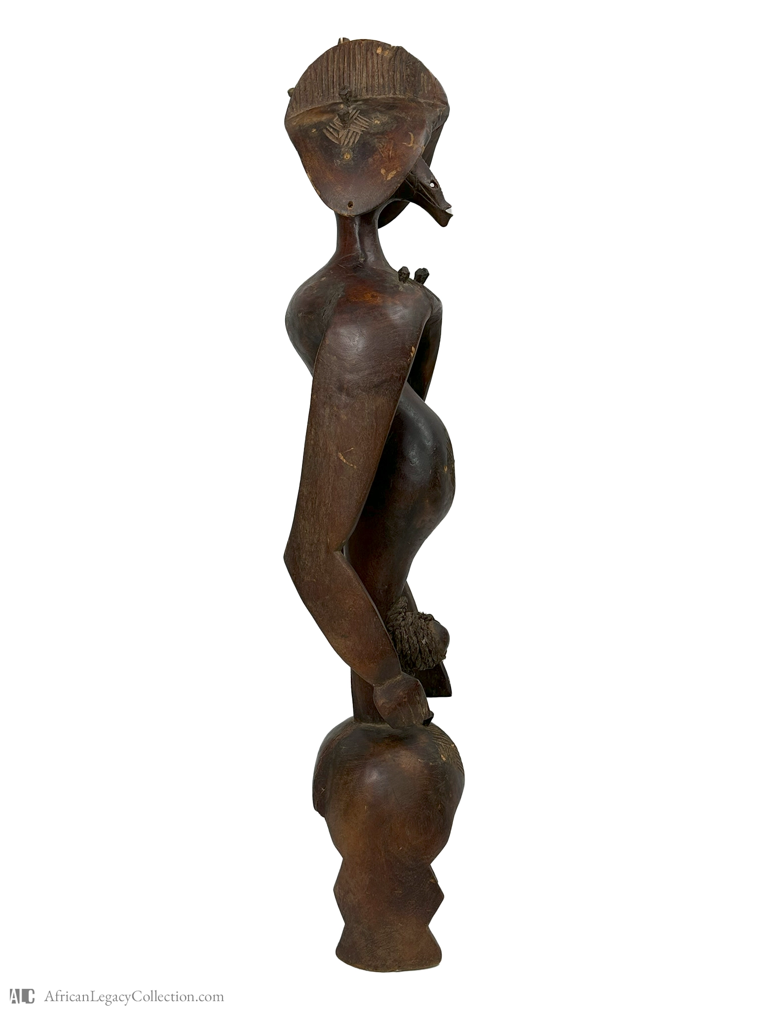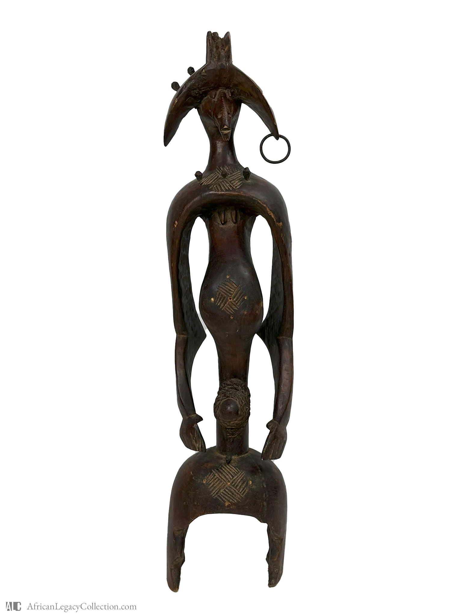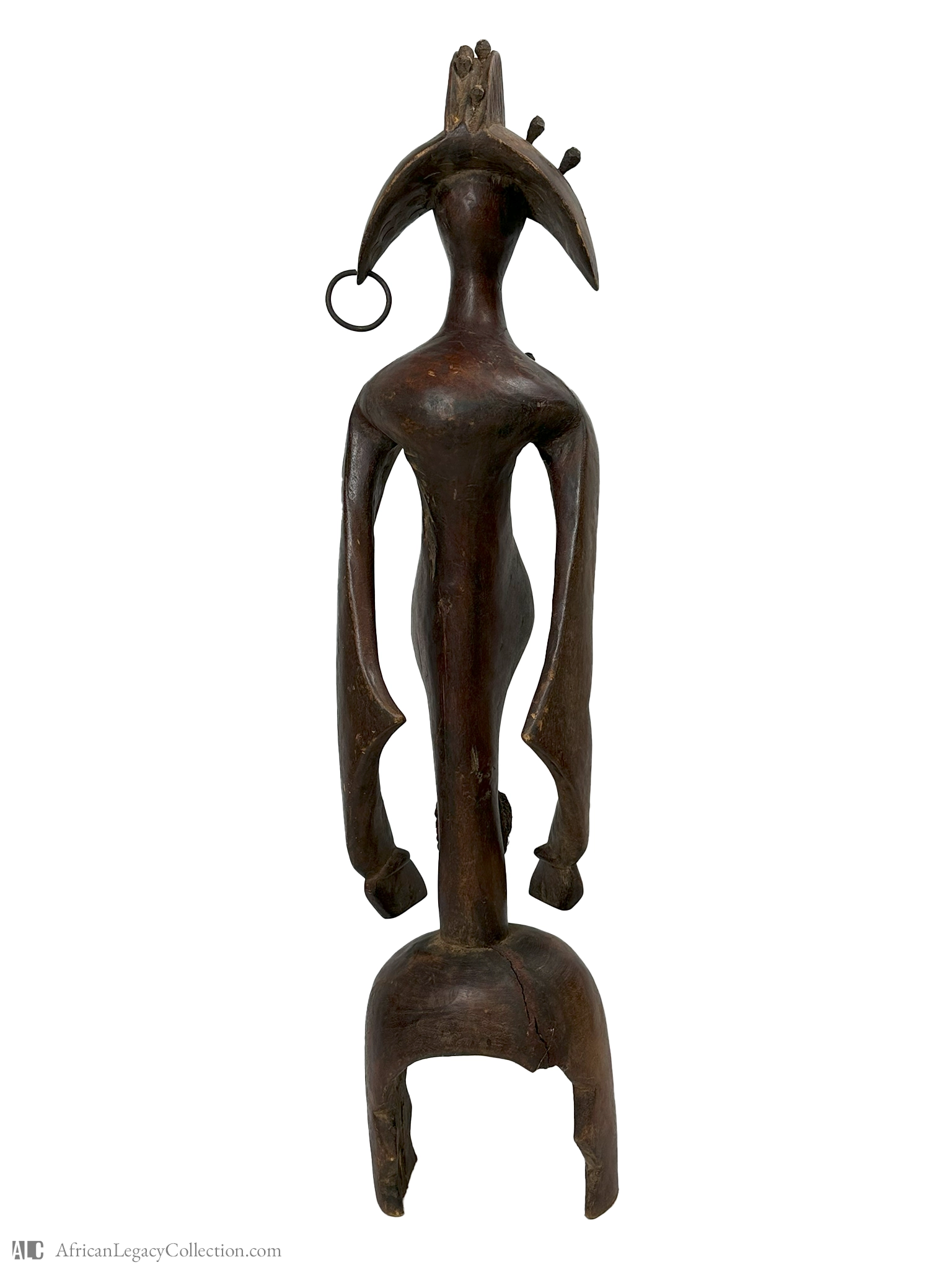 This artifact is a traditional African statue likely originating from the Dogon people of Mali. It is an ancestral figure used in religious rites to connect with spiritual ancestors, reflecting the Dogon’s deep ties to their lineage and cultural heritage.
