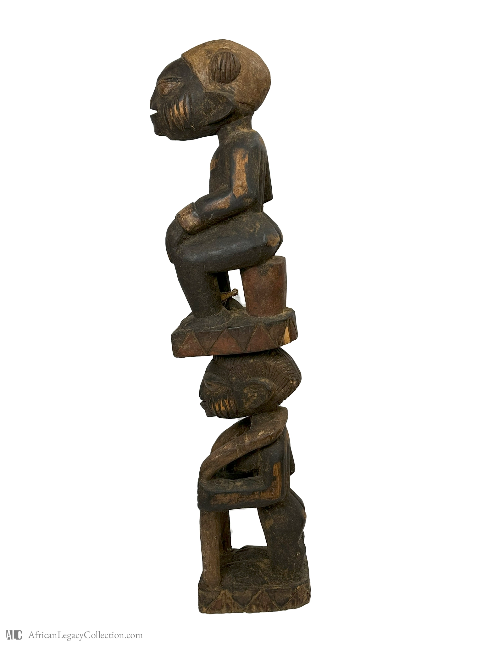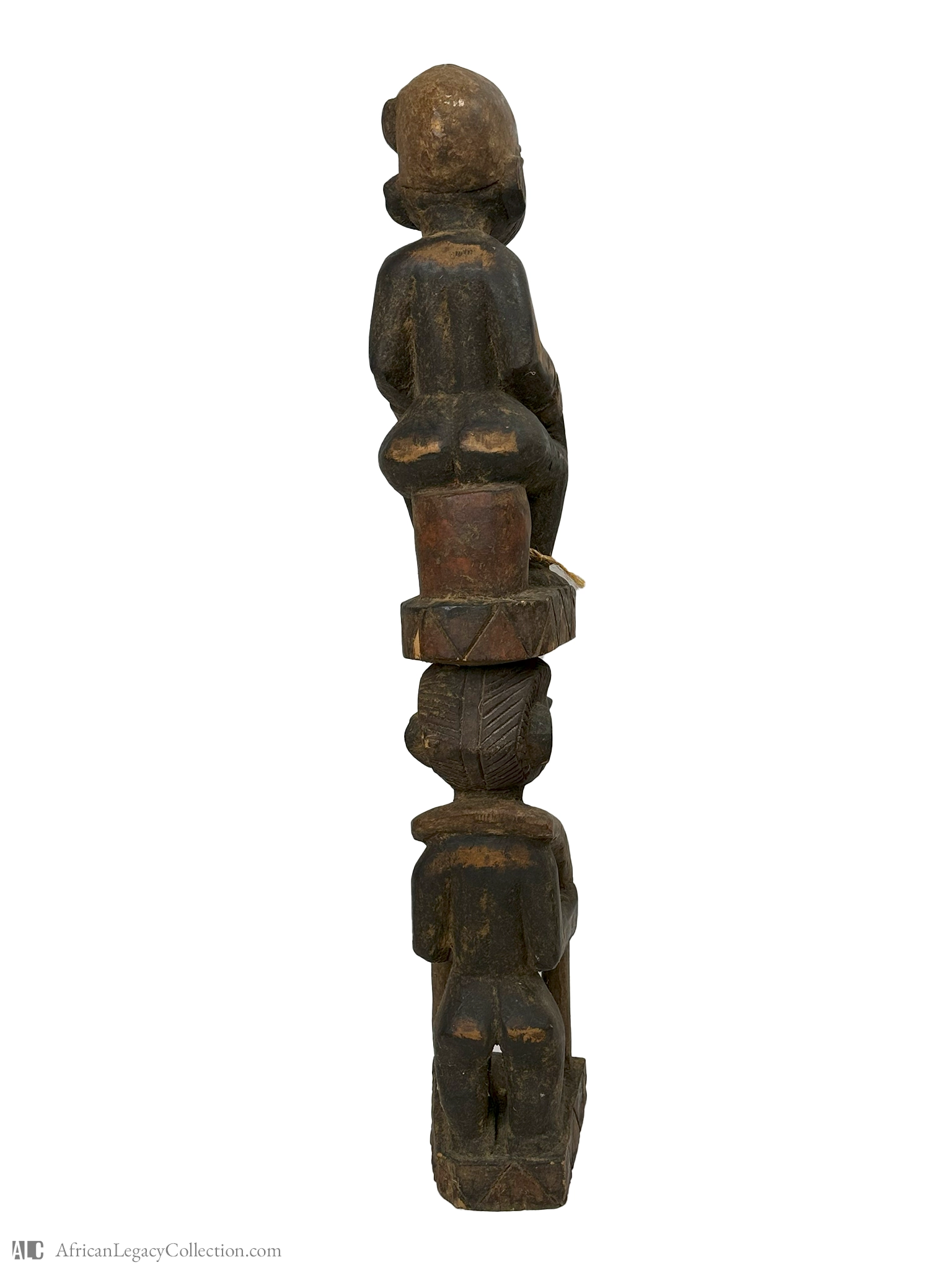 This wooden sculpture likely originates from Central Africa and represents a traditional stool or seat used in cultural ceremonies. The figures depicted in the piece embody a spiritual or communal significance, common in artistic traditions from this region.