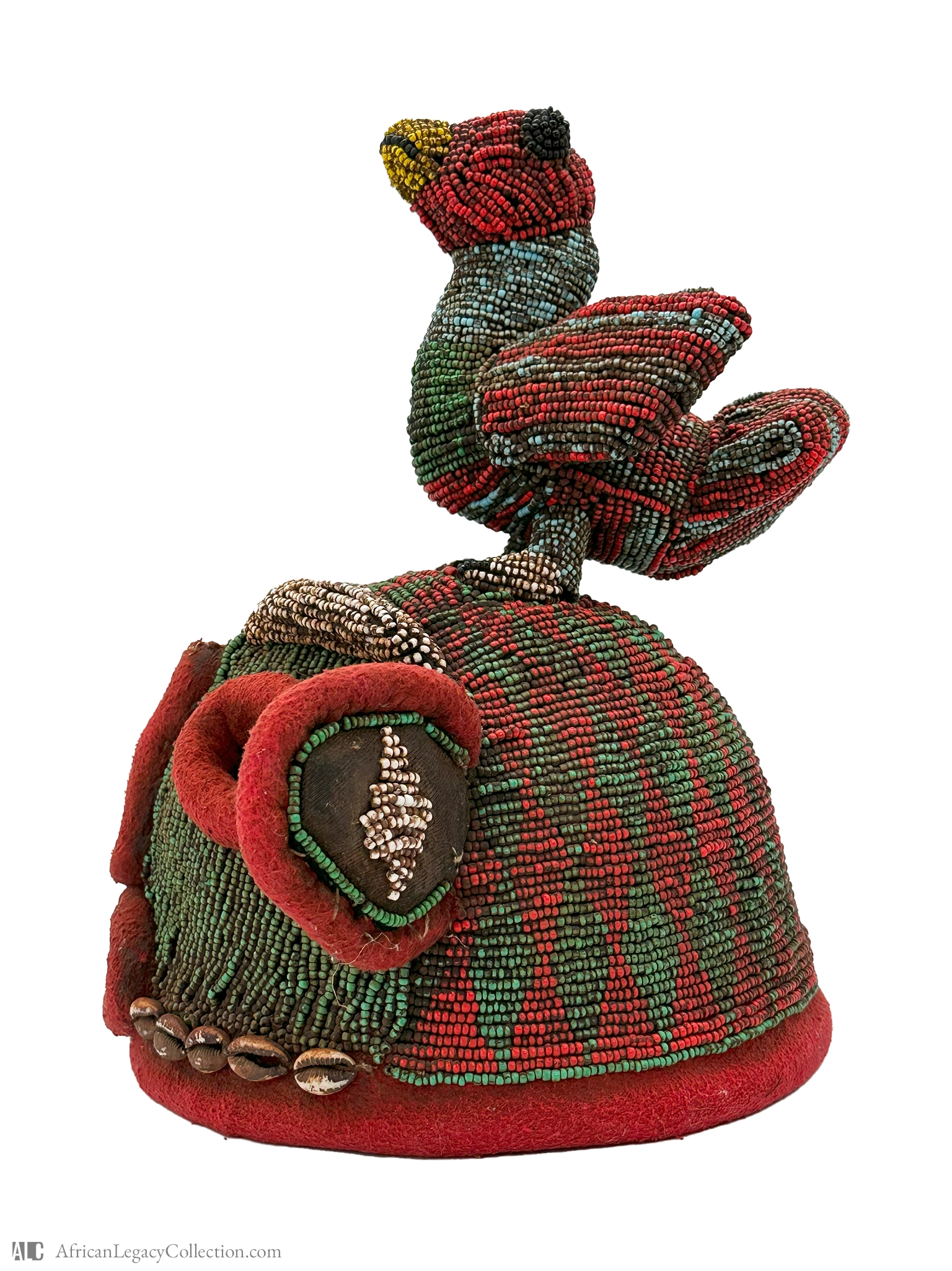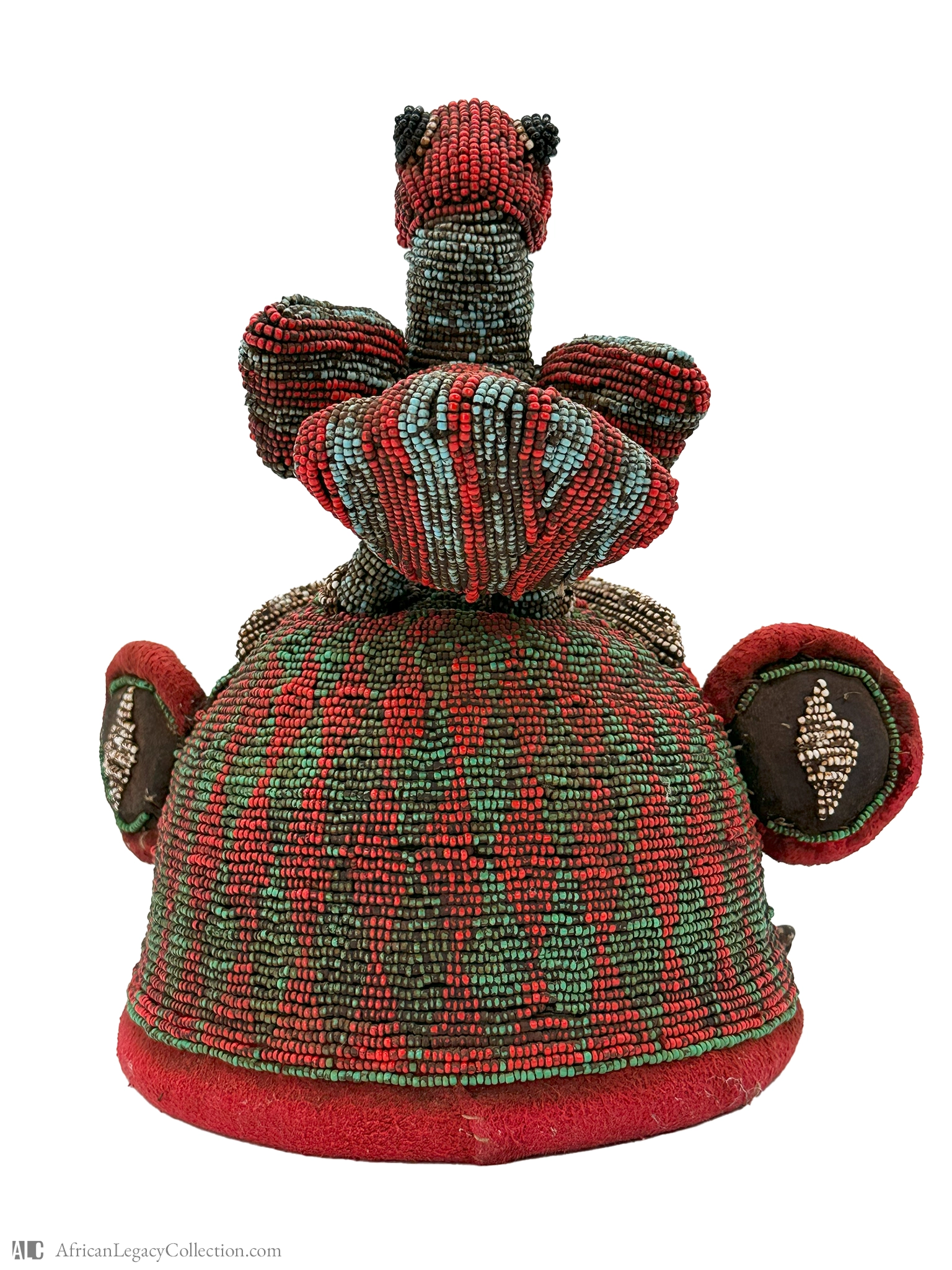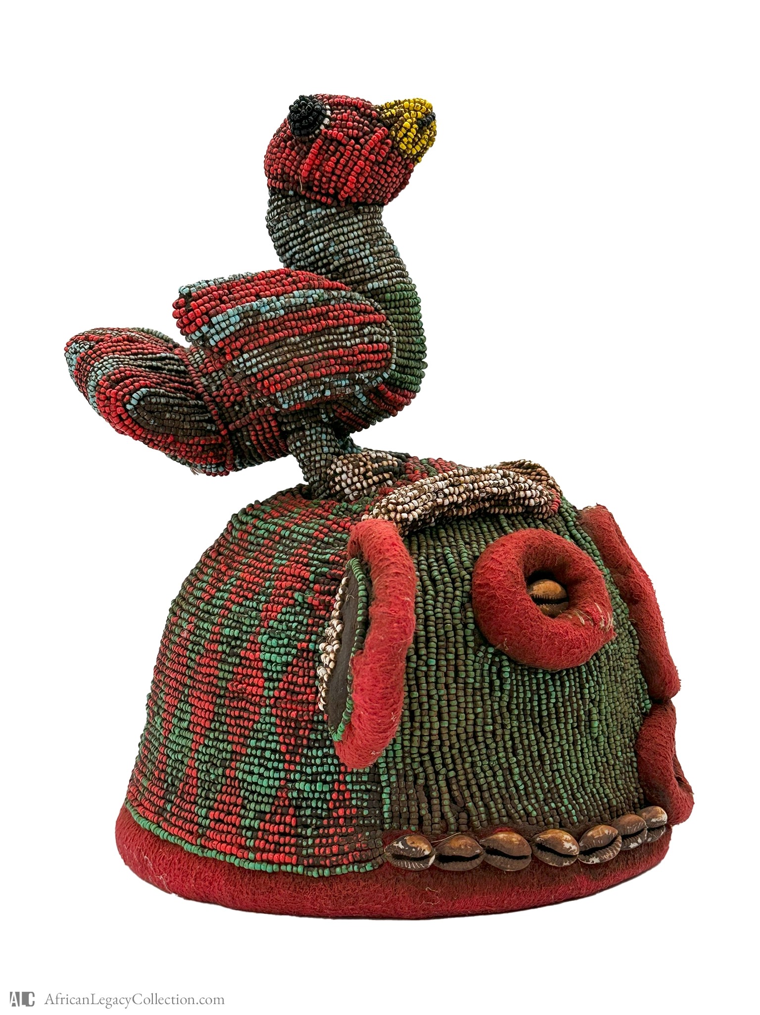 This beaded headdress is likely of Yoruba origin, a people found predominantly in West Africa. It serves a ceremonial purpose, often worn by chiefs or during traditional rituals. The headdress’s elaborate beadwork and motifs suggest its use in significant cultural gatherings, symbolizing status and heritage.