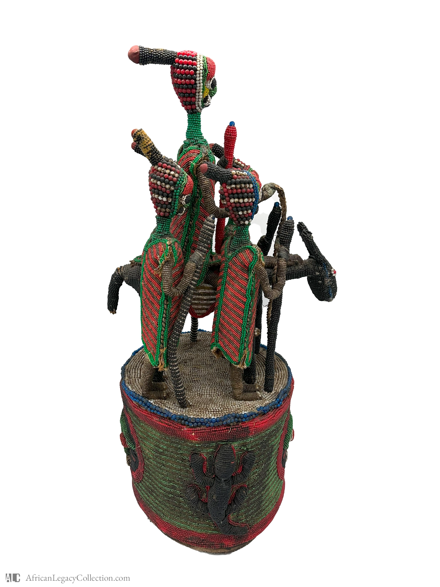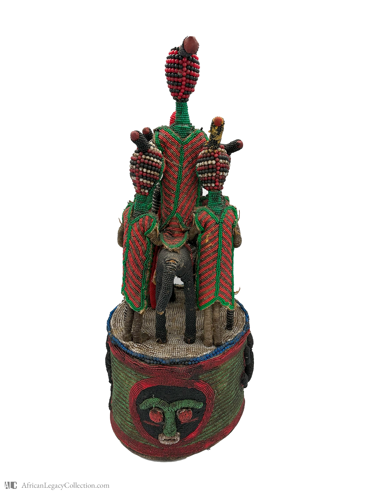 Constructed with thousands of colorful beads and textiles, this piece reflects the Yoruba mastery in beadwork and craftsmanship. The historical context points to its creation during a period when bead artistry was integral to both aesthetic expression and social status. Such artifacts often held significant cultural and spiritual value within the community.