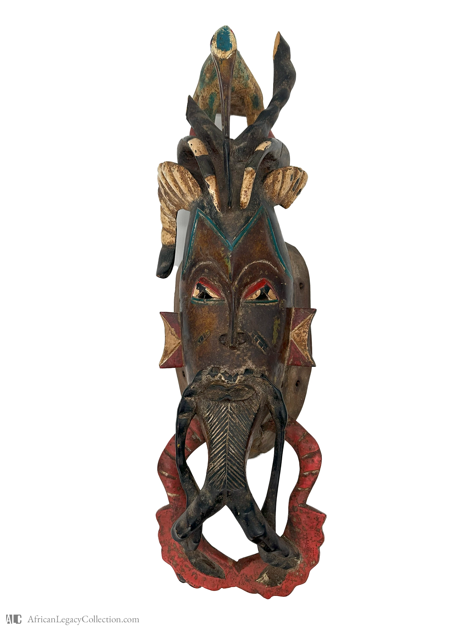 This African mask is typically used in cultural ceremonies and represents an amalgamation of human and animal characteristics for ritualistic purposes. It originates from West Africa, where masks play a crucial role in community rites and celebrations.