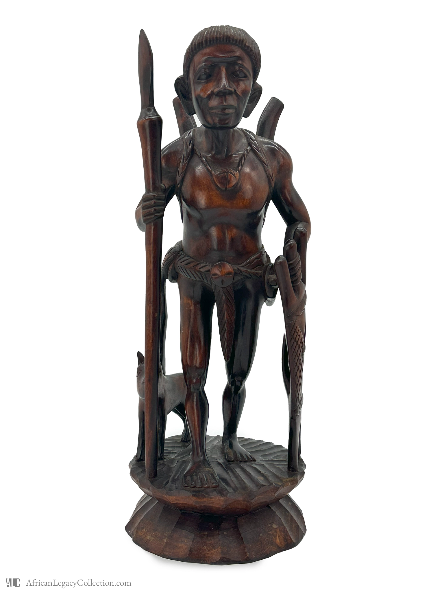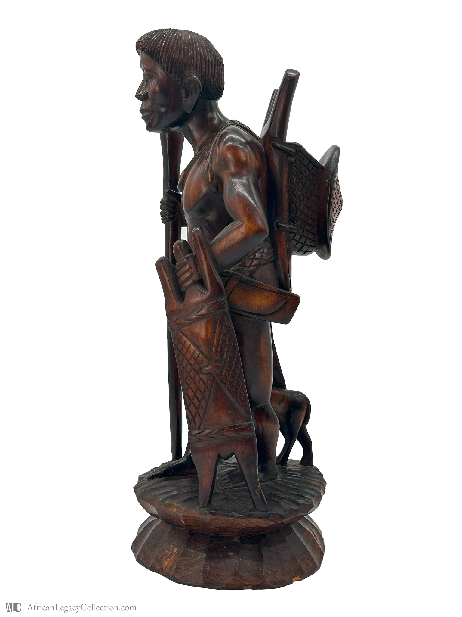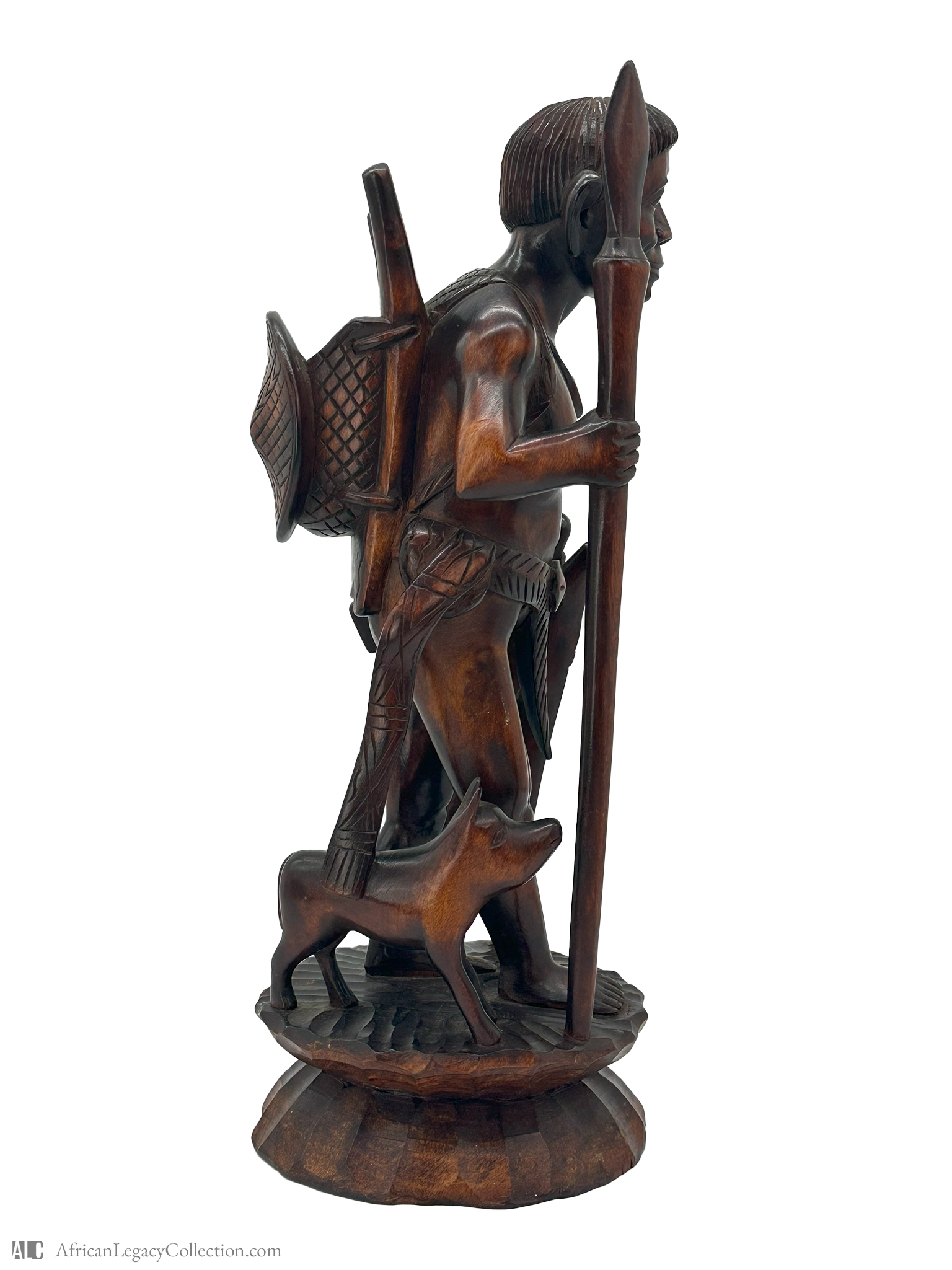 This intricately carved wooden sculpture likely originates from Central Africa. It depicts a hunter, emphasizing themes of survival and provision, which are central to many indigenous African communities. The figure stands poised with a spear and shield, accompanied by a dog, symbolizing companionship and assistance in hunting.