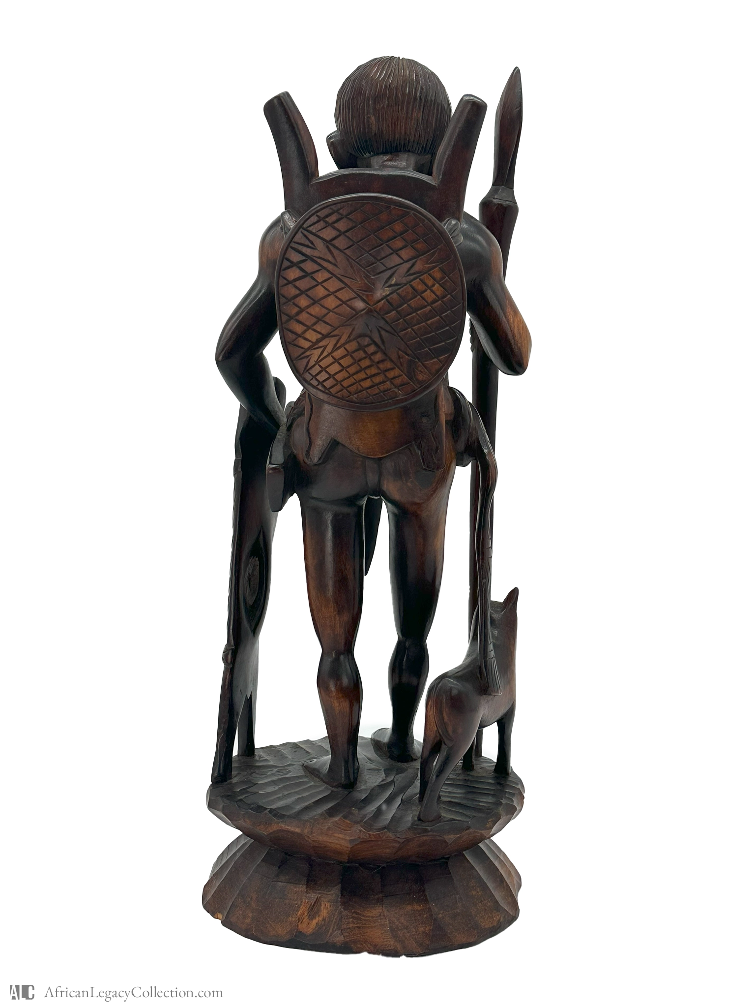 The sculpture is crafted from a dense hardwood, utilizing techniques such as incised striations to create detailed textures, particularly in the clothing and shield. This piece reflects a rich historical context, highlighting the cultural significance of hunting and community roles in traditional African societies.
