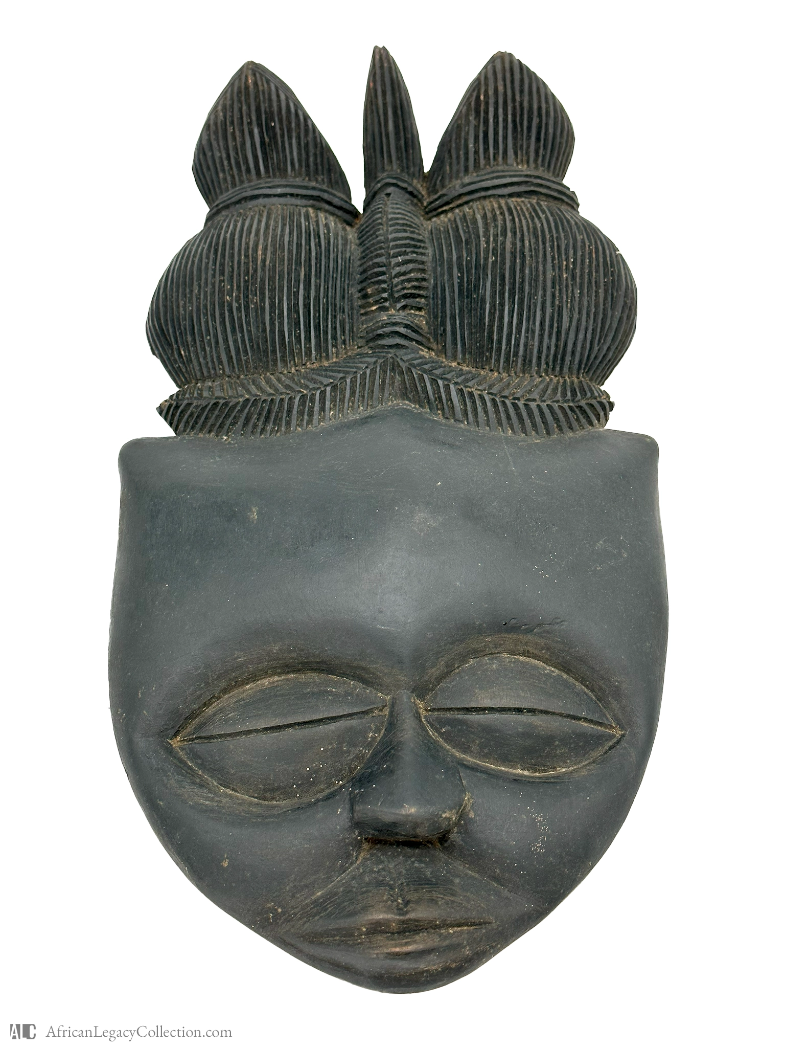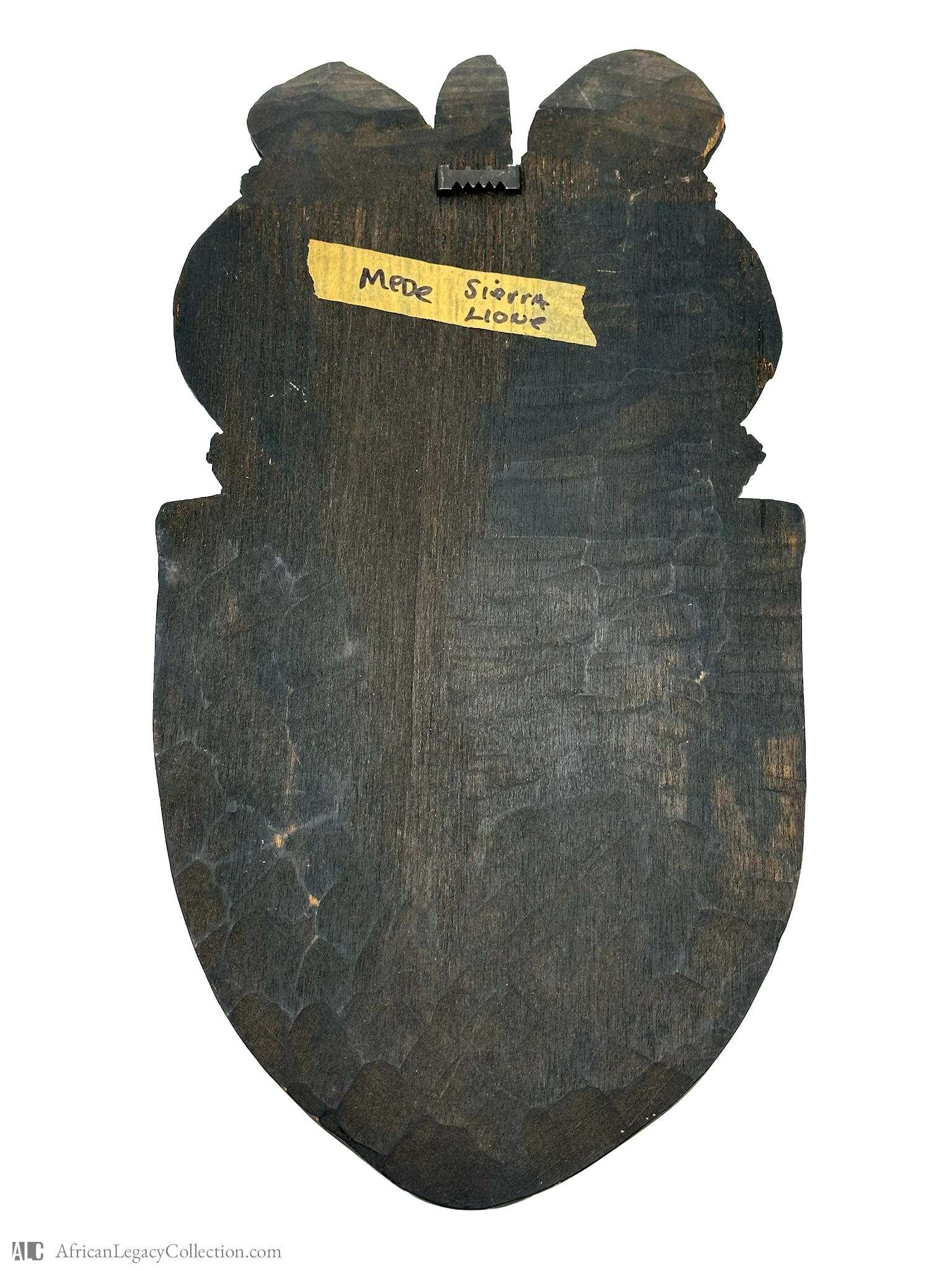 This mask can be identified as a traditional Mende mask from the Mende people of Sierra Leone, used in initiation rituals. These masks are integral to the Sande society, which oversees the transition of girls into womanhood, signifying ideals of beauty and moral virtues.