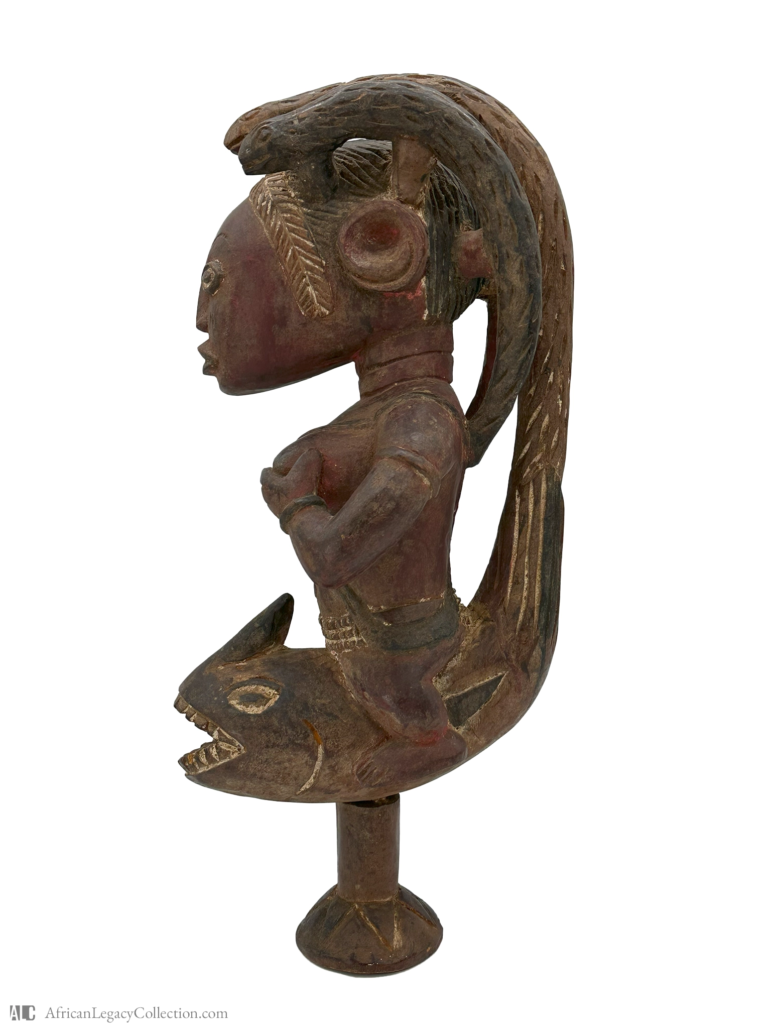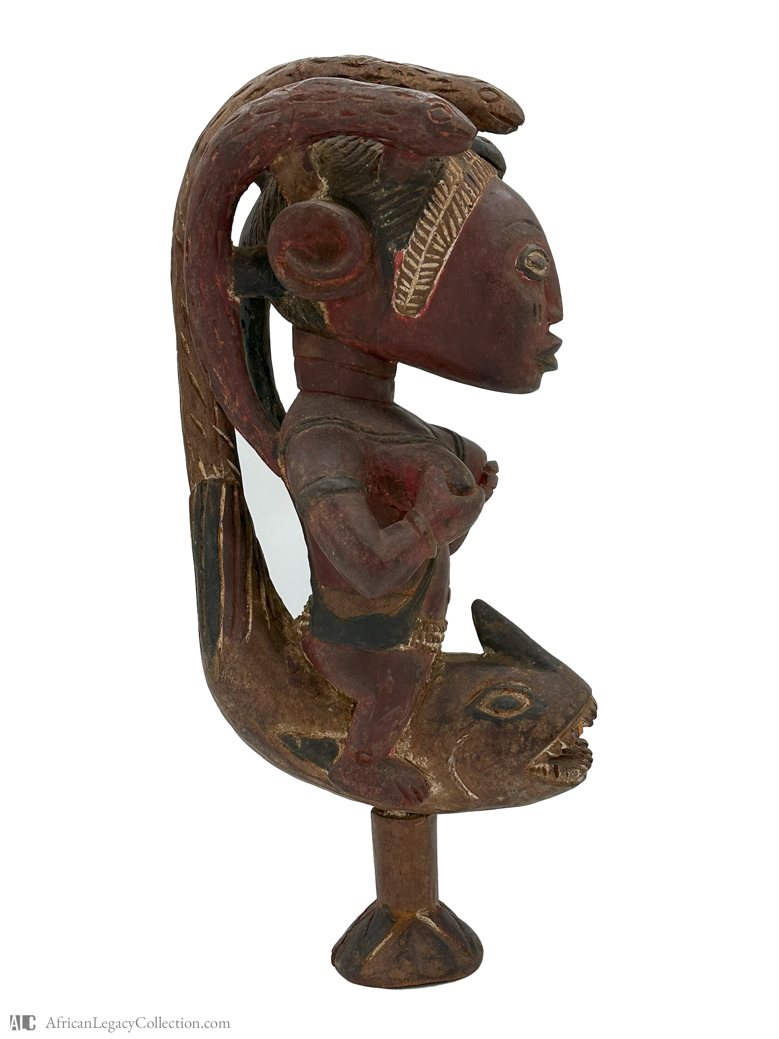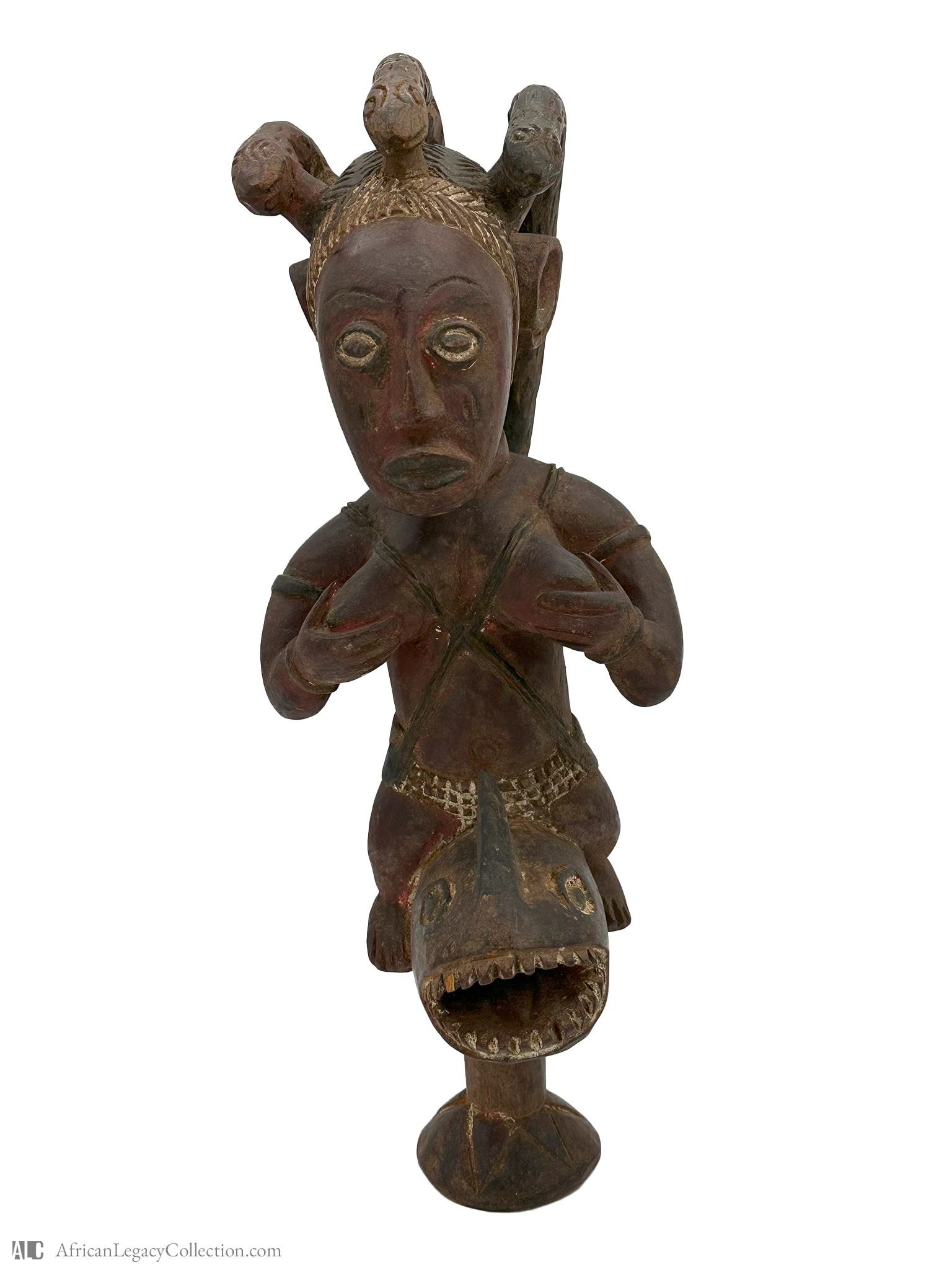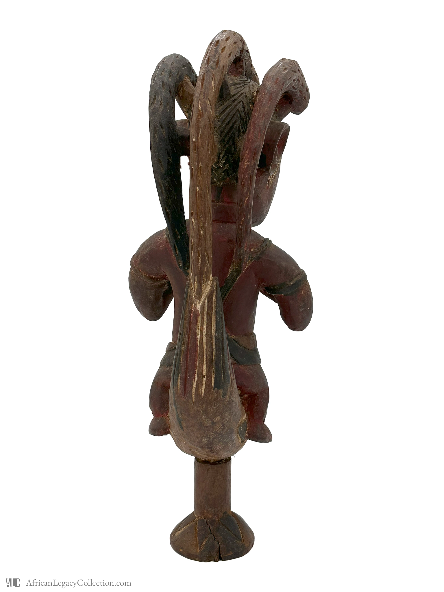 This artifact is a ceremonial figure likely originating from West Africa. It may represent a spiritual or mythical entity, serving a role in traditional rituals. The figure’s intricate details suggest it was used in religious or cultural ceremonies to invoke protection or blessings.