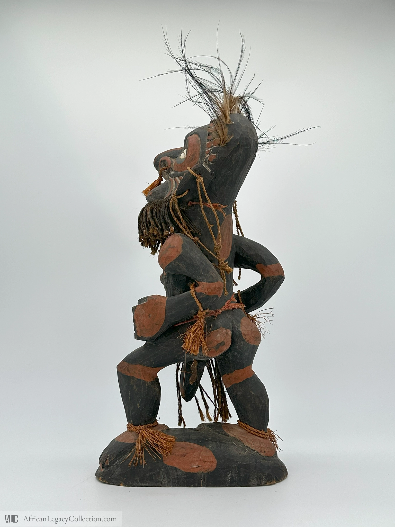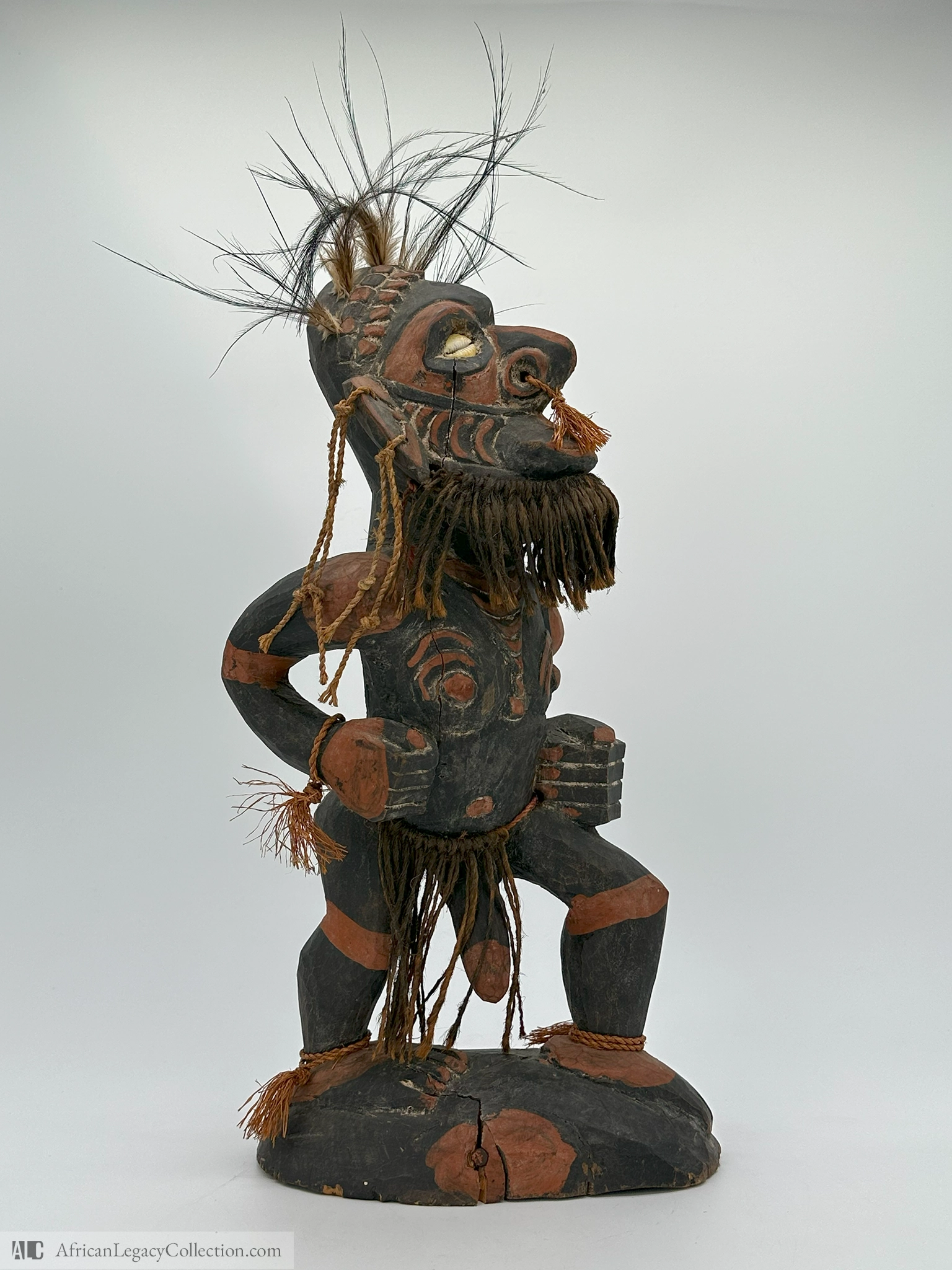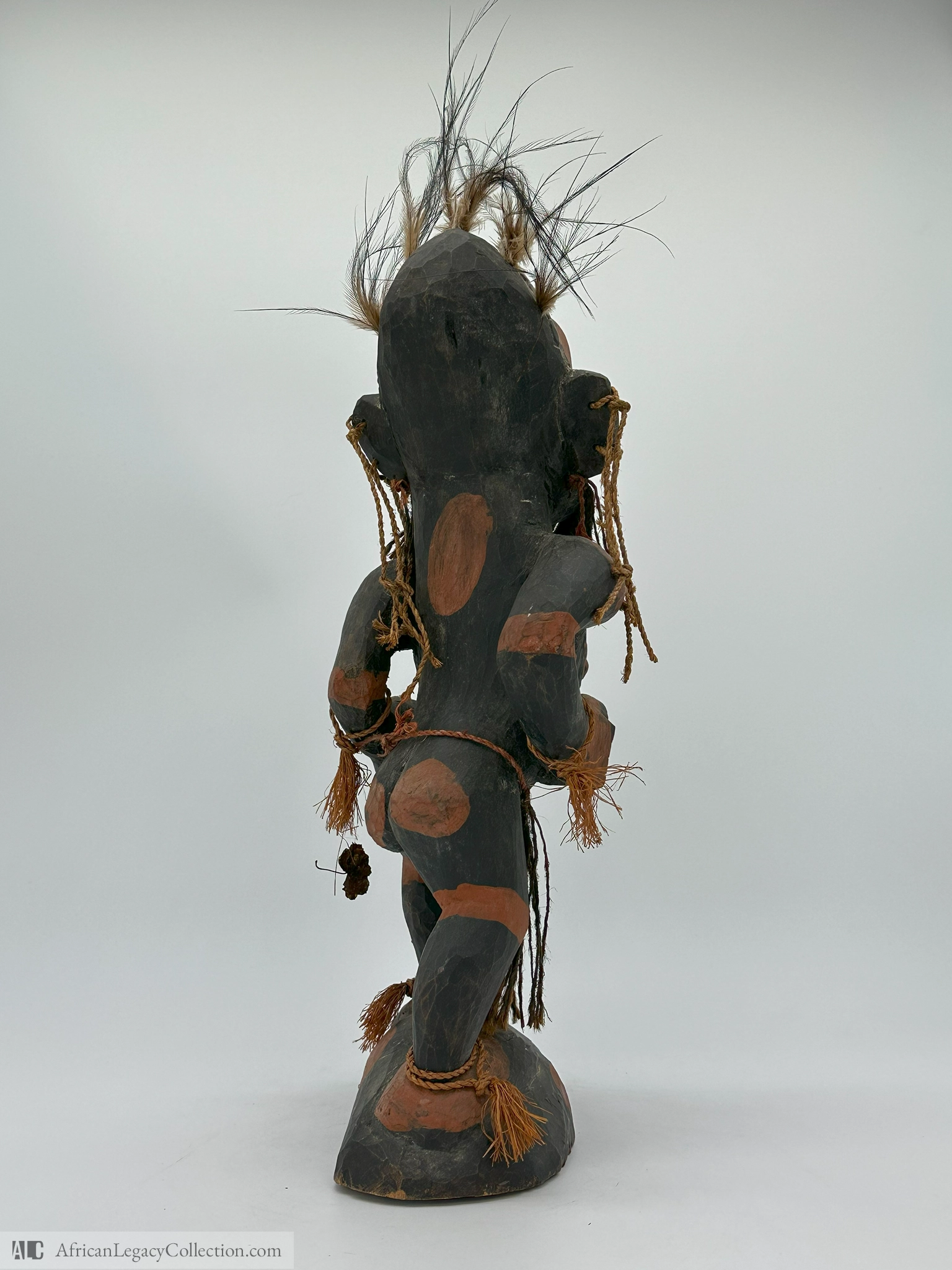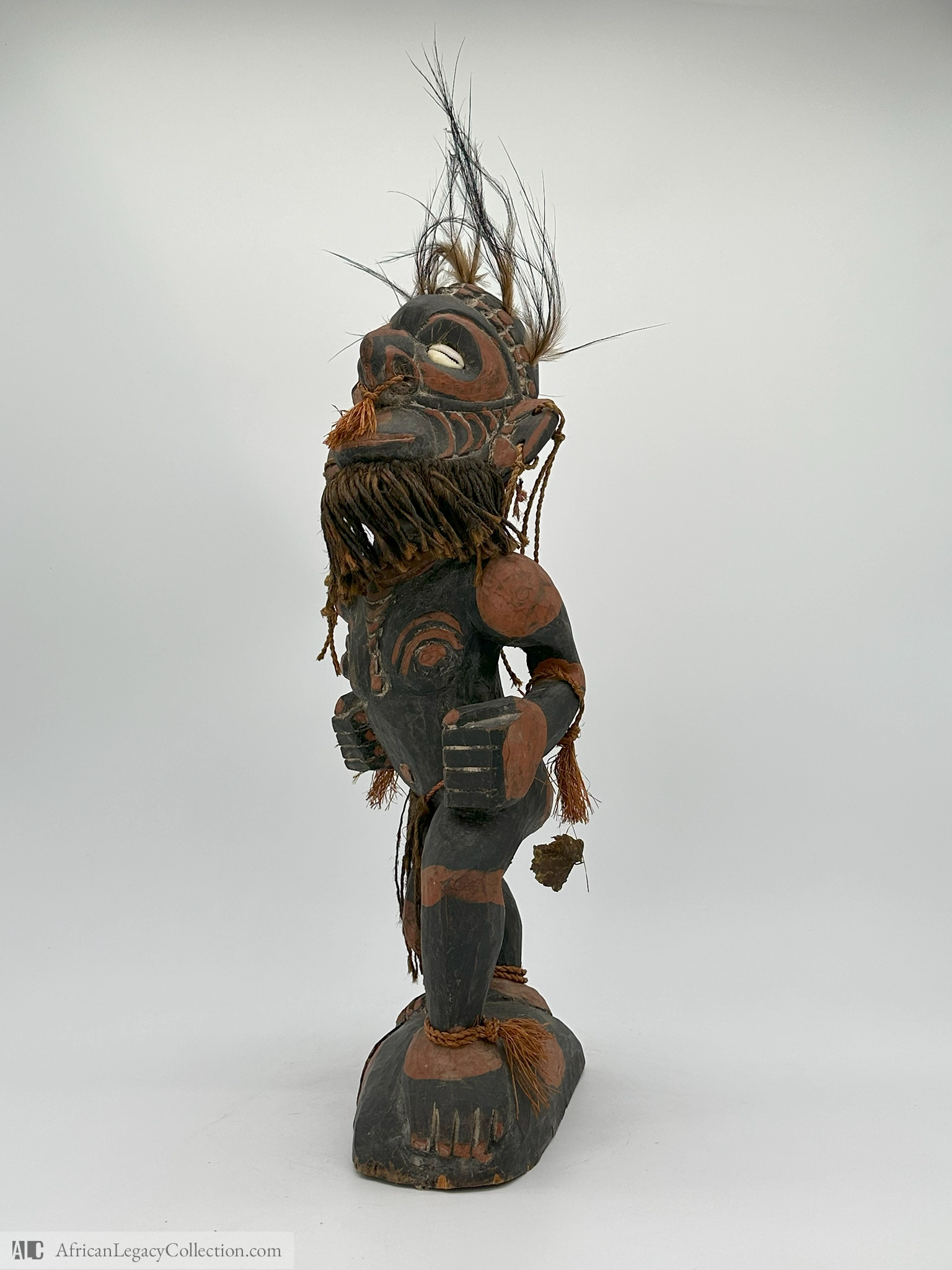 Crafted from wood, the figure features detailed scarification motifs and anthropomorphic stylization, indicating the skillful practice of traditional carving techniques. The use of natural pigments adds to its ceremonial importance. Such artifacts are reflective of cultural and spiritual beliefs prevalent in the region, highlighting a rich tradition of artistic expression.