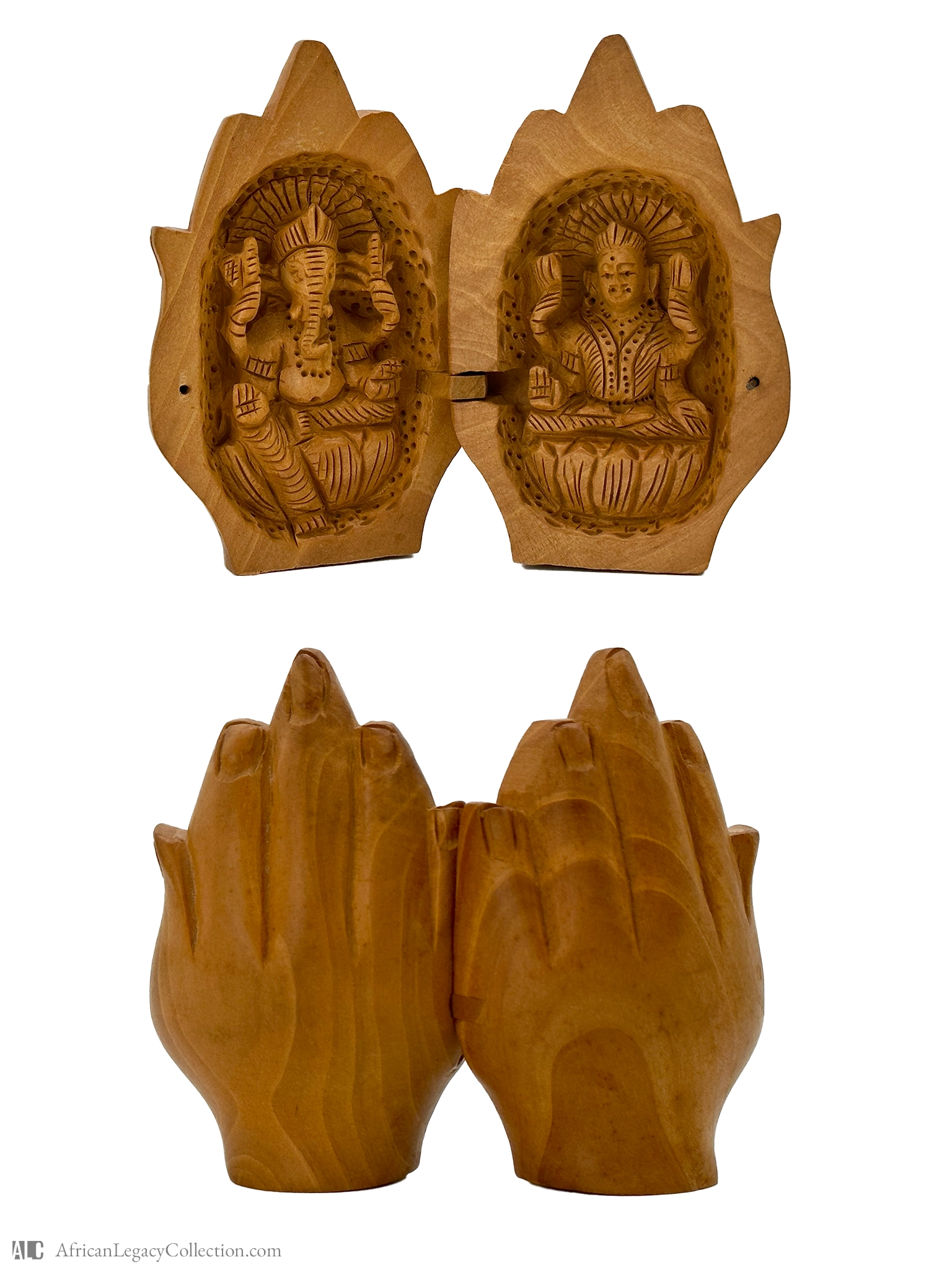 This intricately carved wooden artifact depicts deities within a hand-shaped form, suggesting its use in personal or household devotion. Its iconography points to Indian cultural influences, representing divine figures in a portable shrine or prayer object.