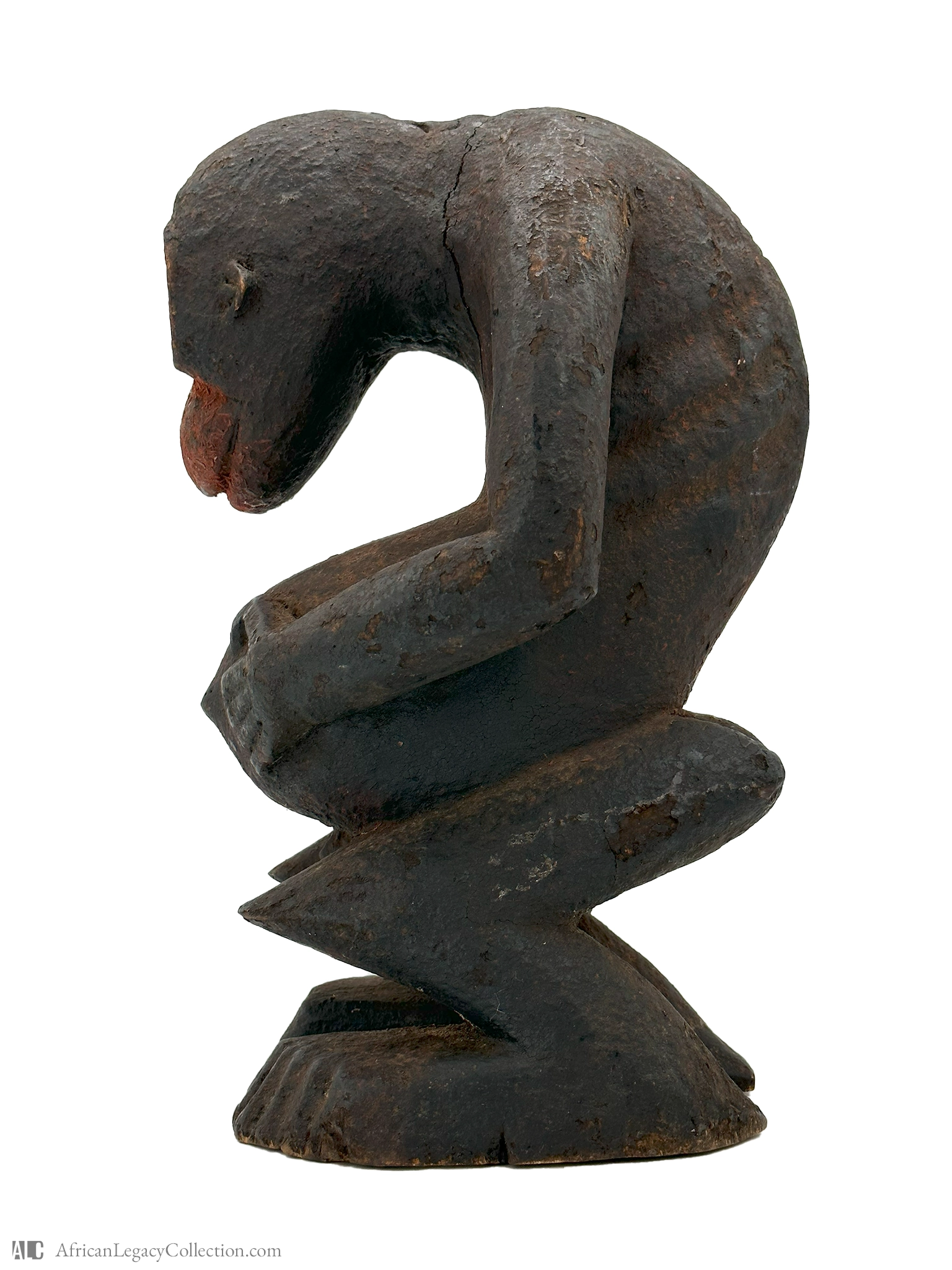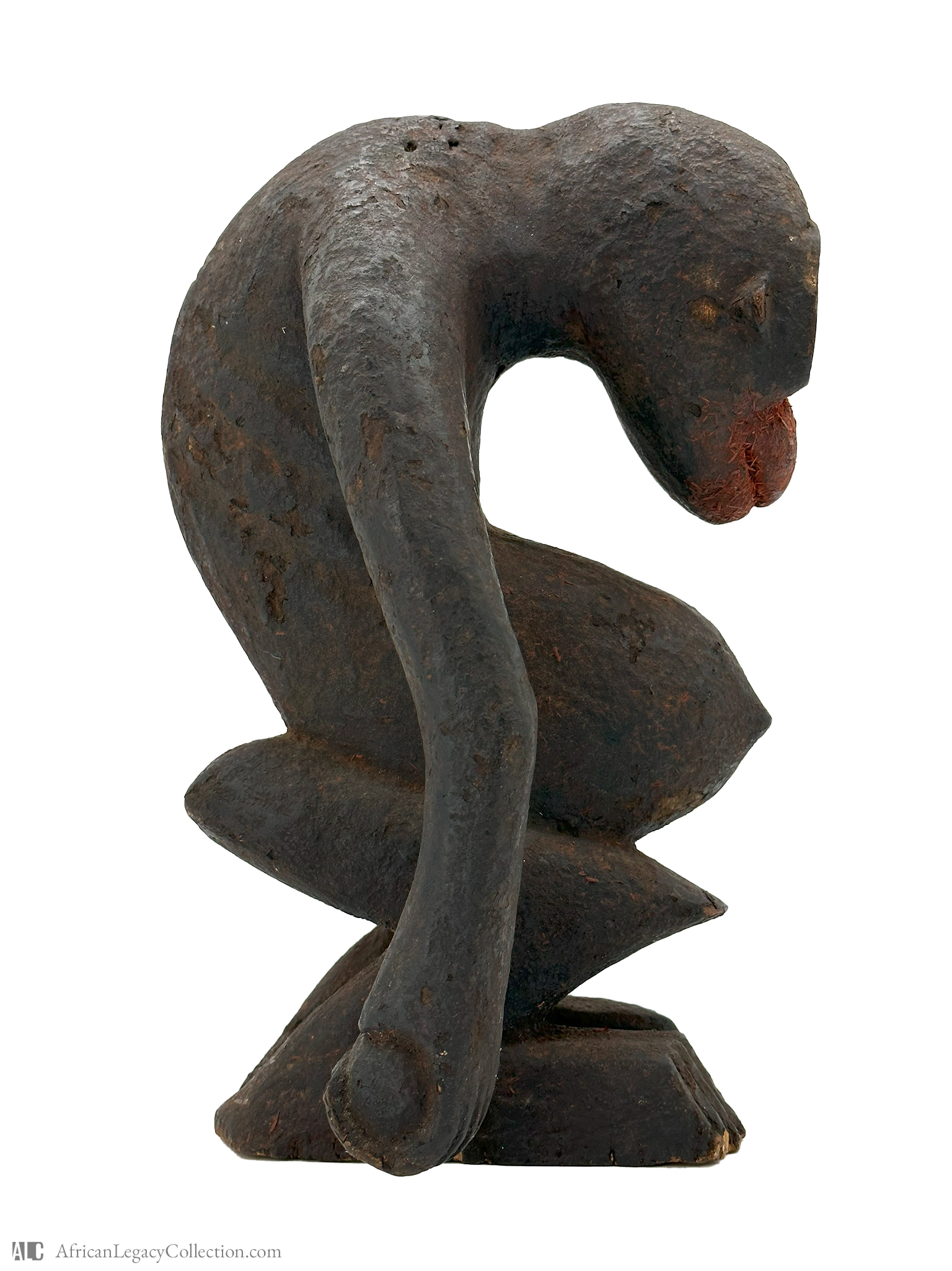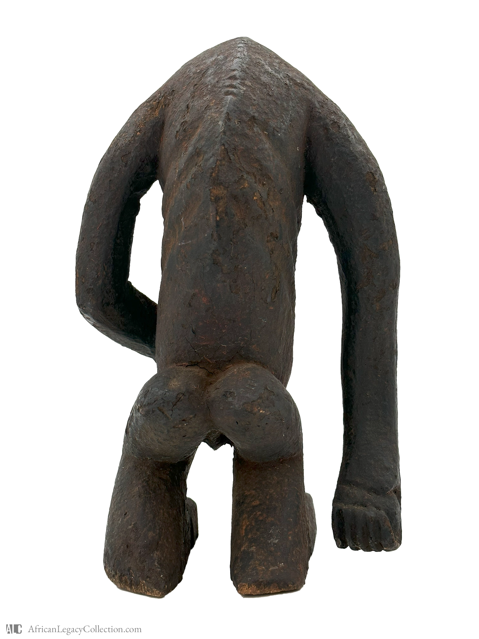The figure is primarily crafted from wood, evidenced by its intricate carved details. This artifact reflects the artistic traditions of the region, characterized by expressive forms and symbolic interpretations. It underlines the cultural significance of such objects in traditional African societies, offering insights into their aesthetic and spiritual values.