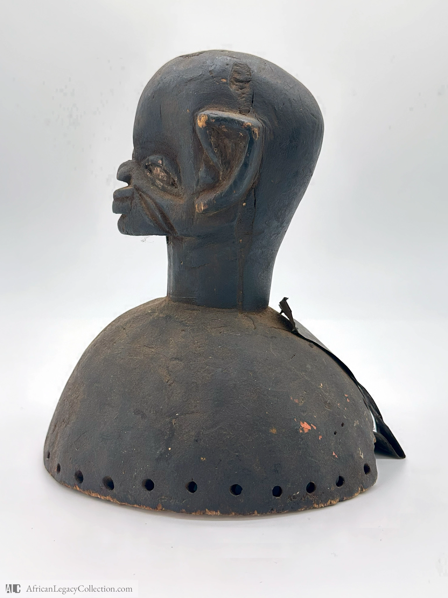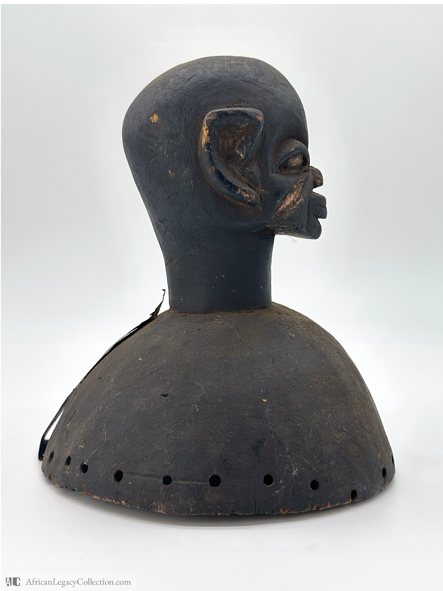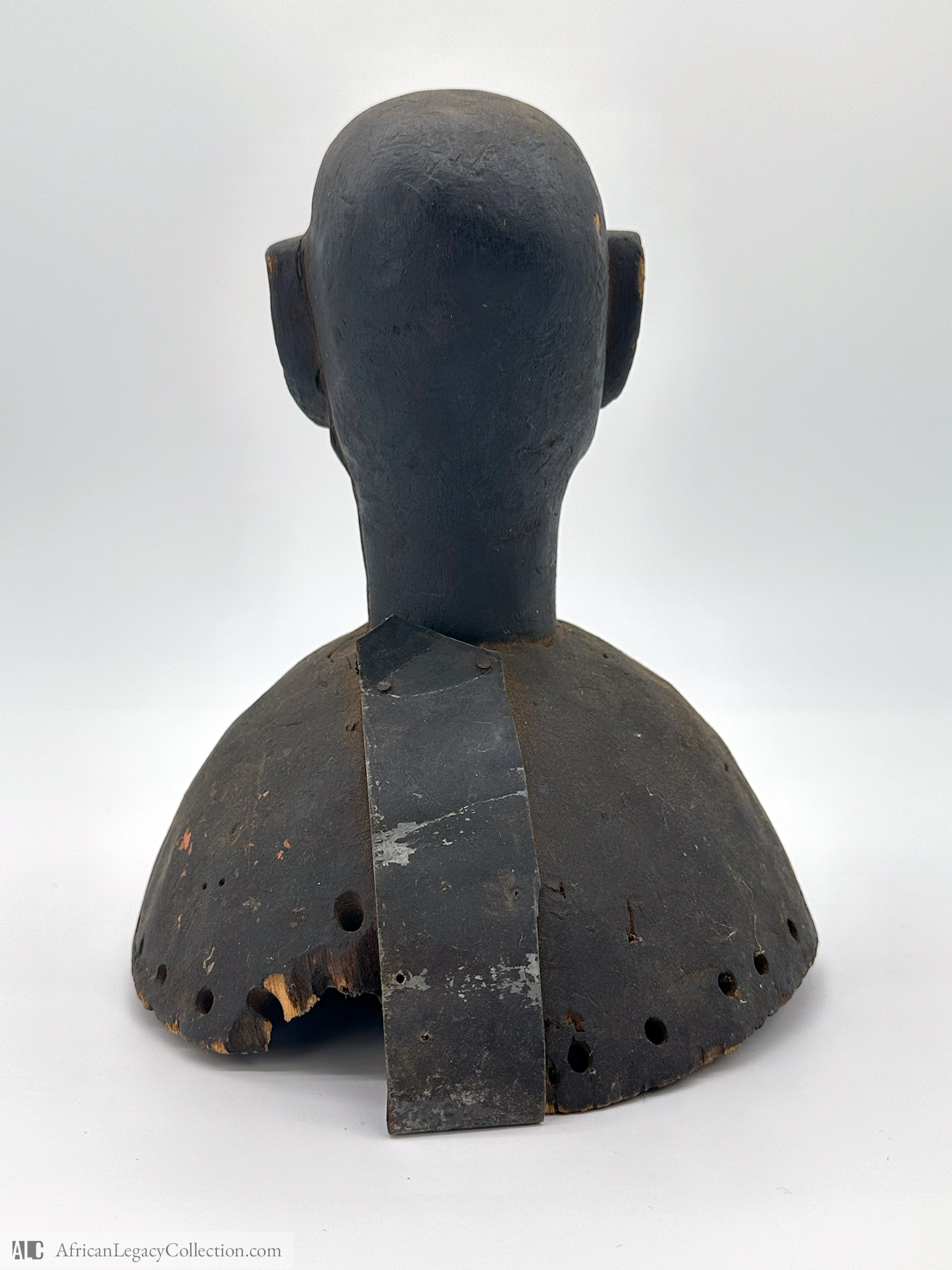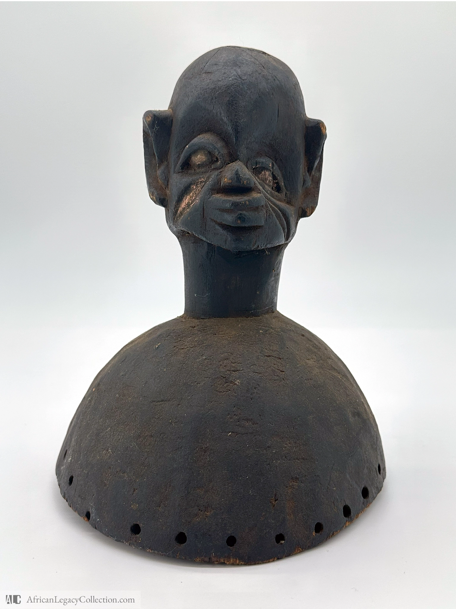 This artifact is a carved wooden bust, likely originating from West Africa, used in traditional ceremonies or as a decorative object. The stylized human features suggest its role in cultural expression or ancestral veneration.