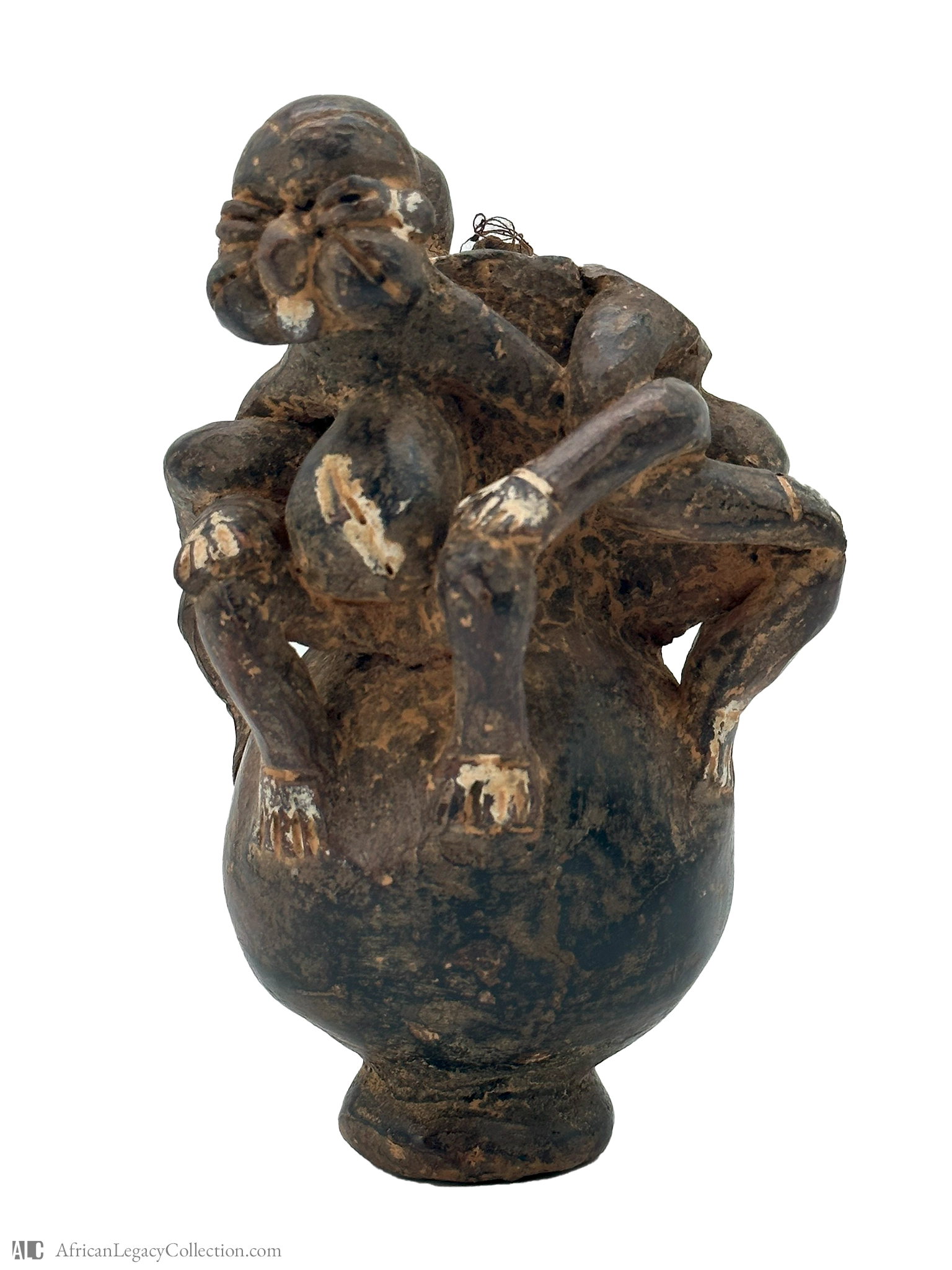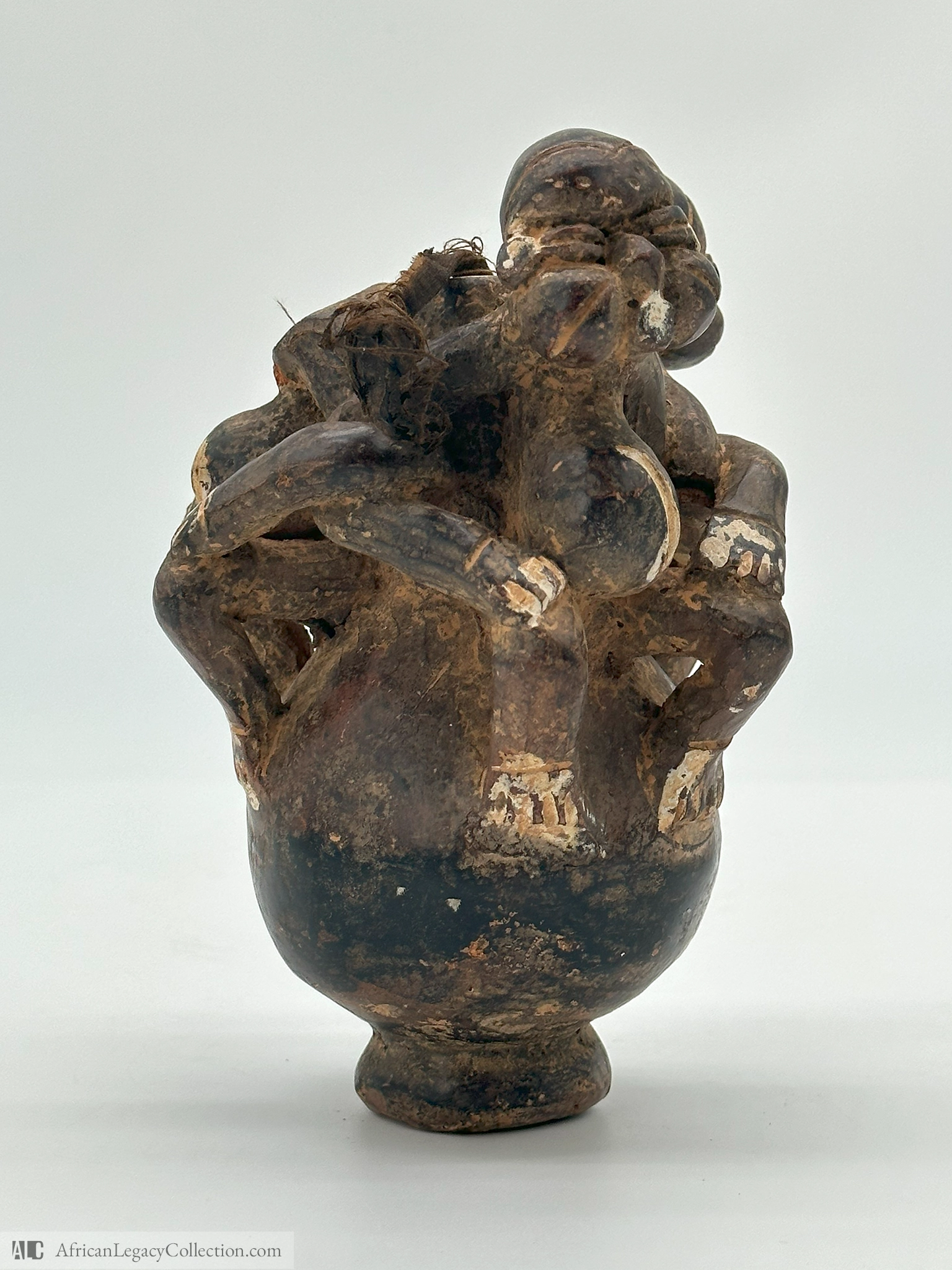 This artifact is a ceremonial vessel likely originating from Central Africa. It features intricate anthropomorphic stylization, depicting figures in a dynamic embrace. Such vessels were often used in ritualistic contexts, possibly for libations or offerings.