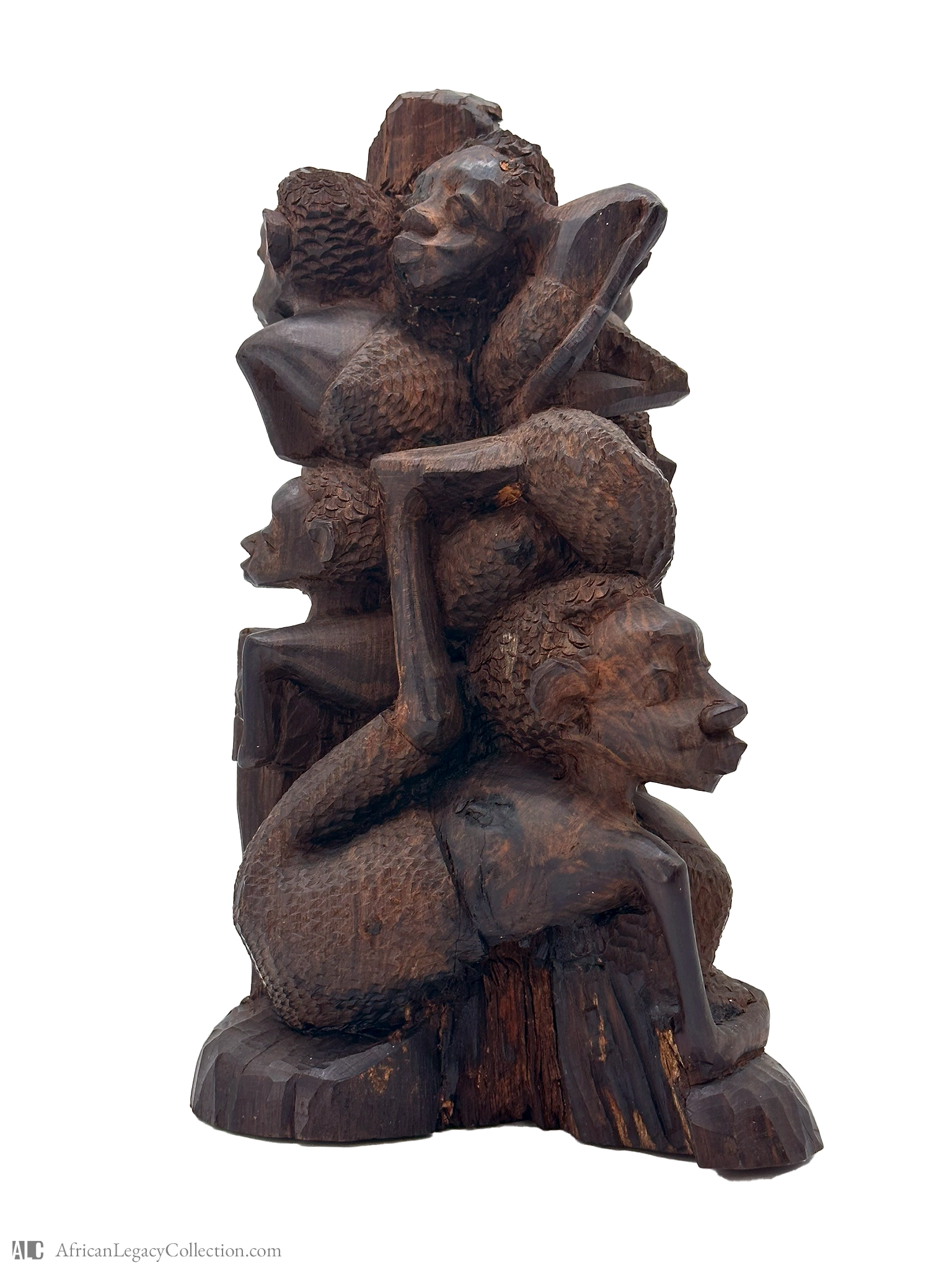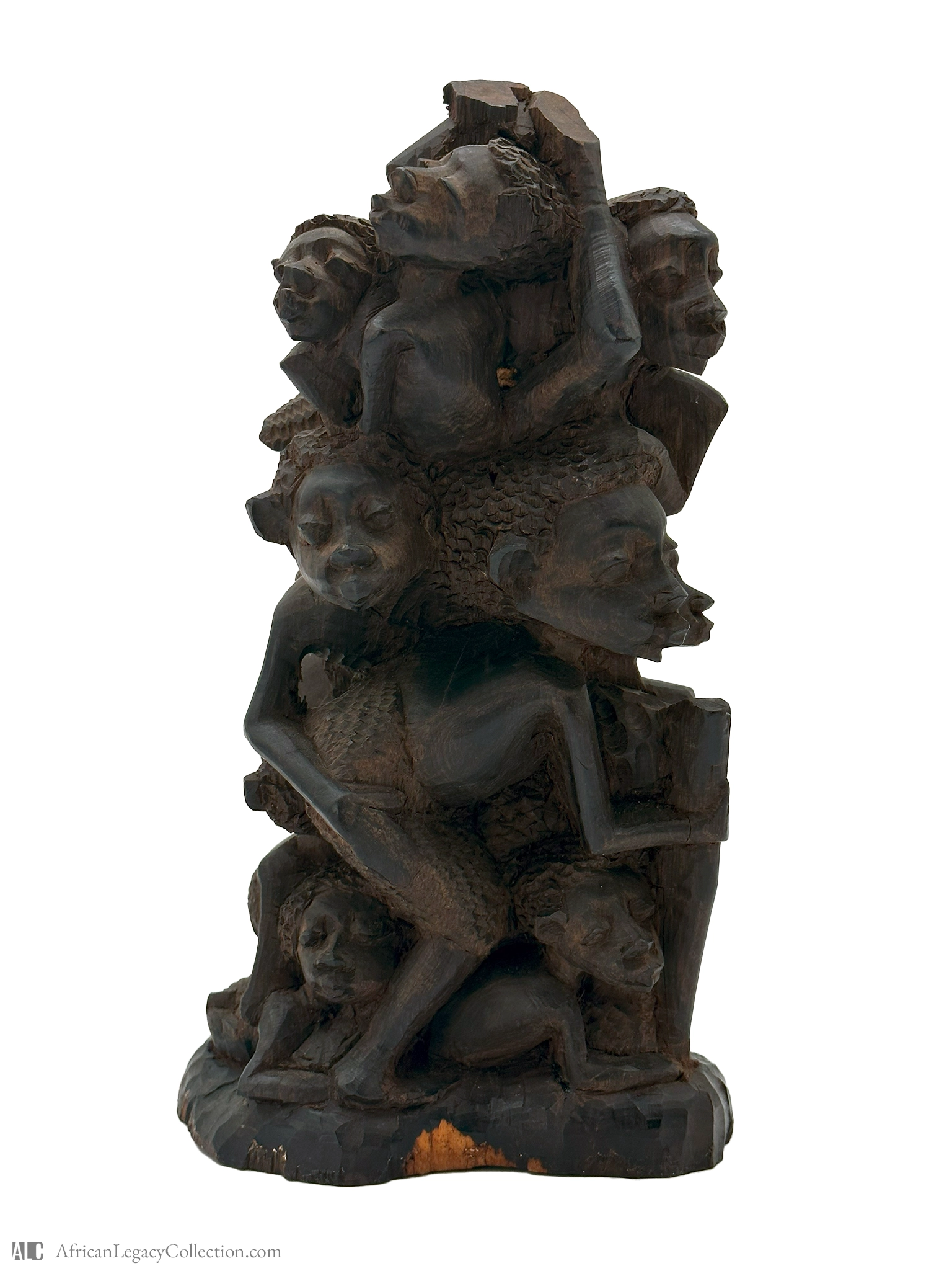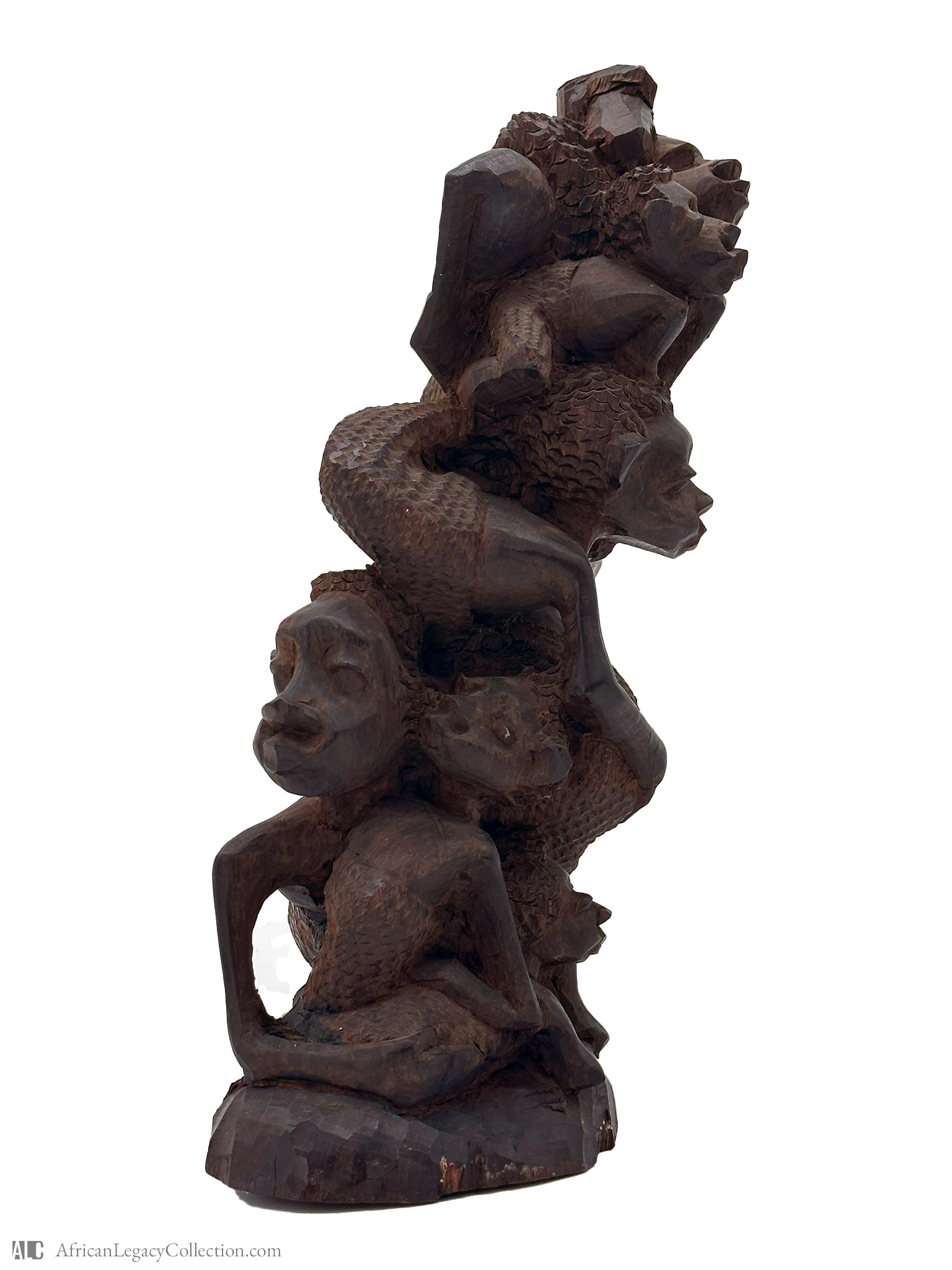 The sculpture is crafted from dark wood, displaying incised striations and textured surfaces that highlight its artistic technique. This piece’s historical significance lies in its representation of interconnectedness and community, echoing the values and beliefs of the culture it originates from.