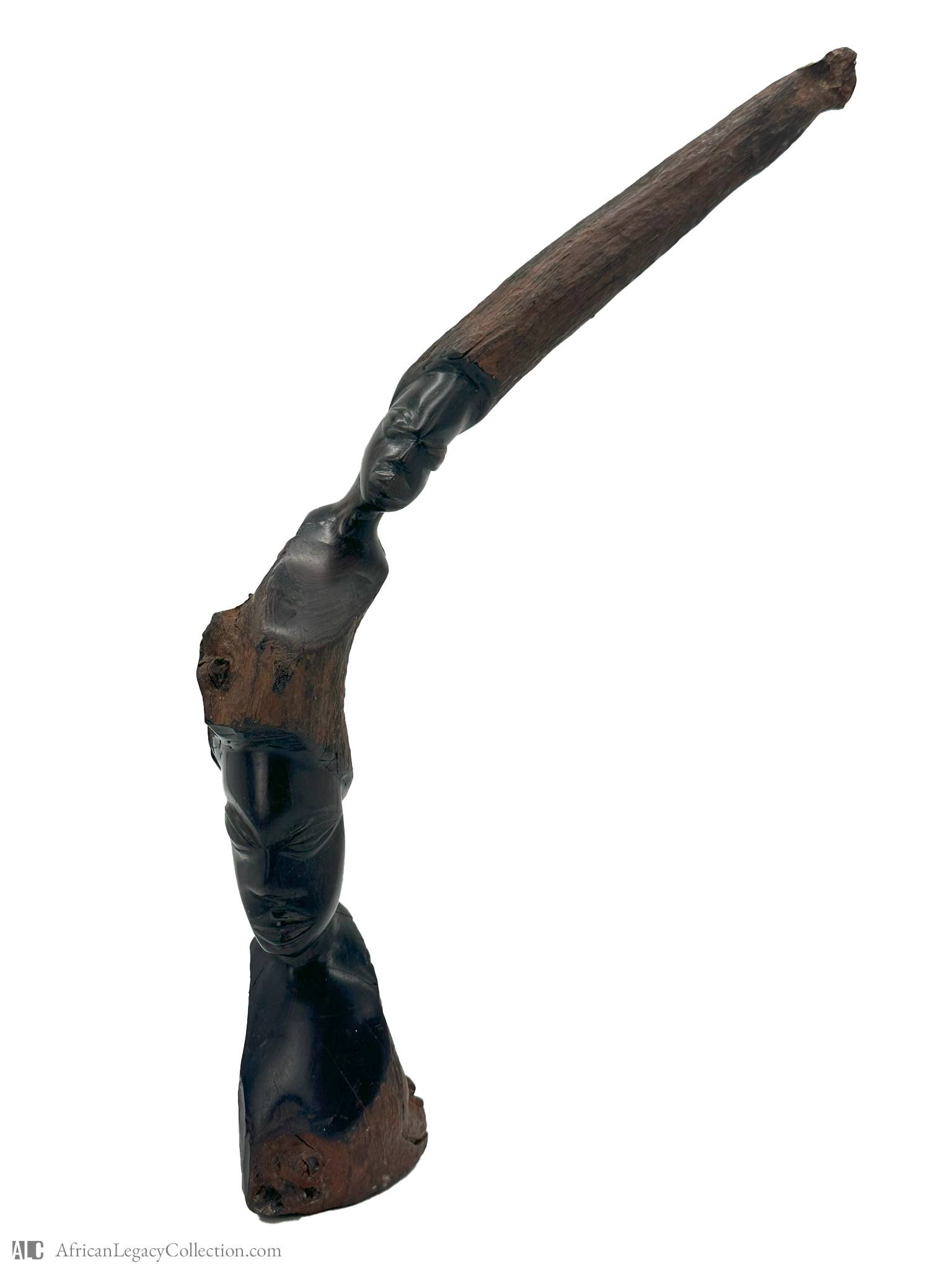 This carved wooden artifact likely originates from West Africa and is an example of an intricately hand-carved sculpture. The piece depicts an elongated human form, possibly representing an ancestral figure, highlighting its potential symbolic role in cultural or spiritual contexts.