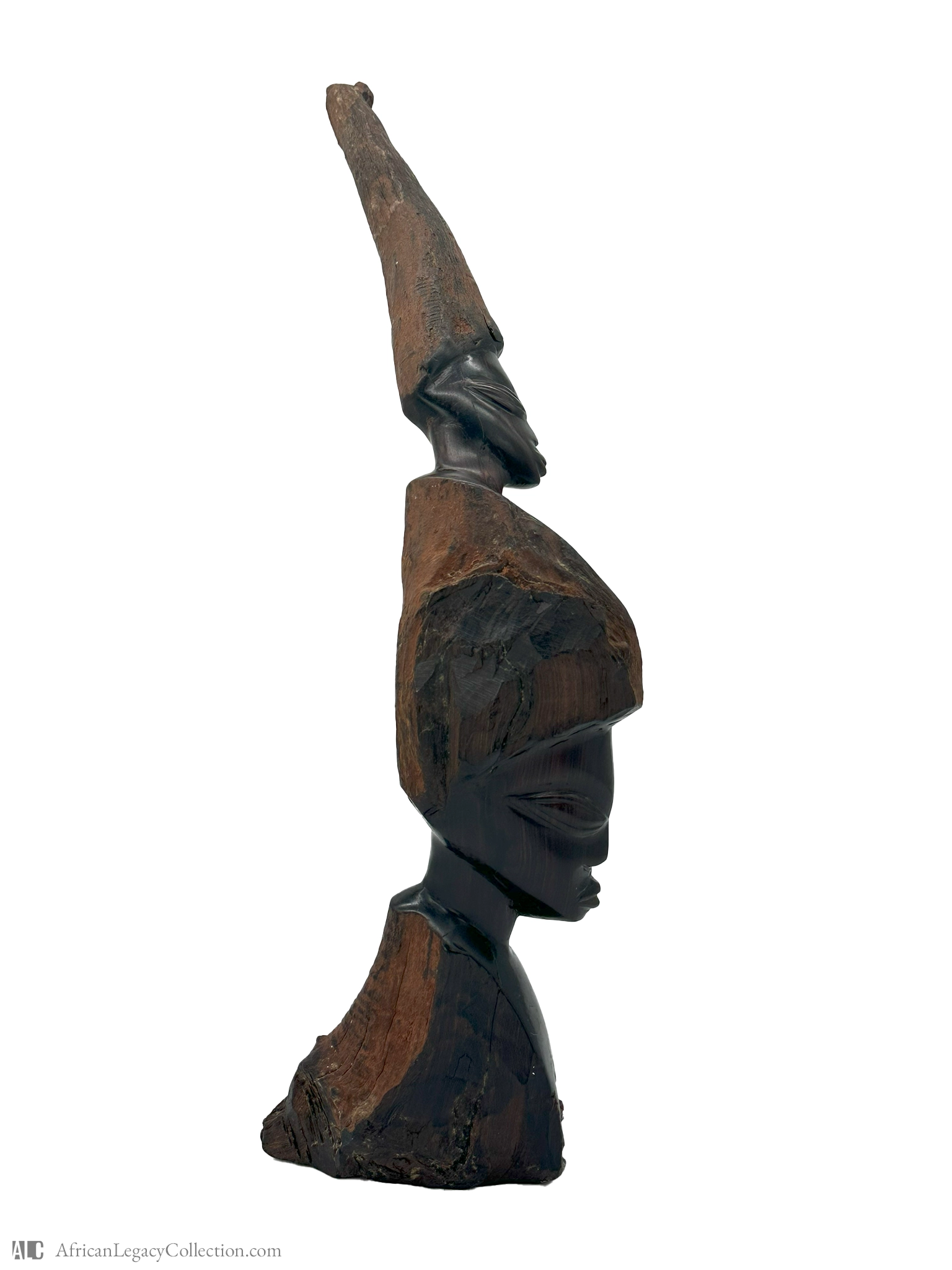 The artifact is crafted from wood, showcasing the artisan’s skill in creating smooth and polished surfaces alongside textured natural elements. Such pieces are often significant in cultural storytelling and are prized for their aesthetic and historical value. This object reflects the traditional woodworking techniques present in African sculpture.