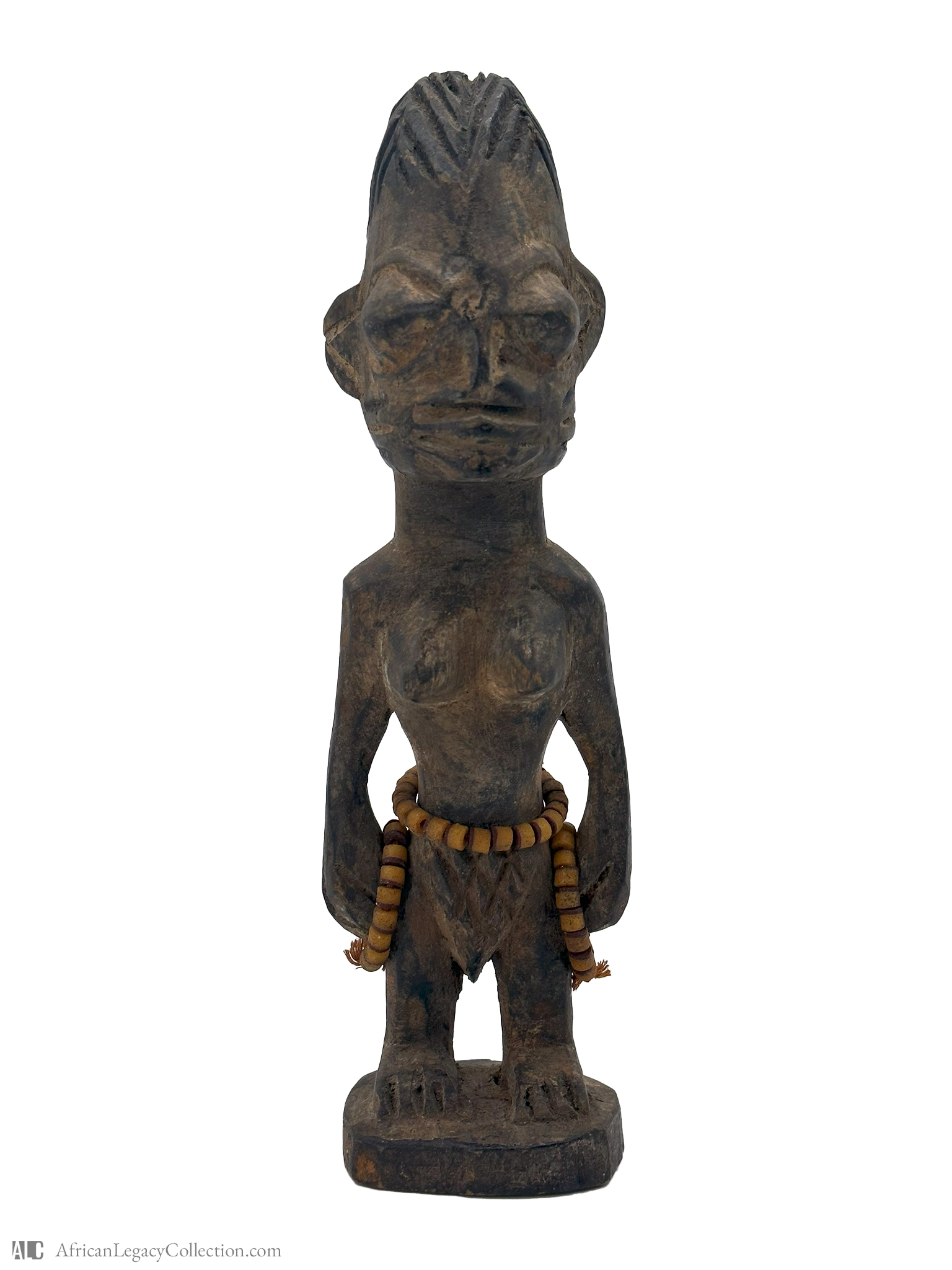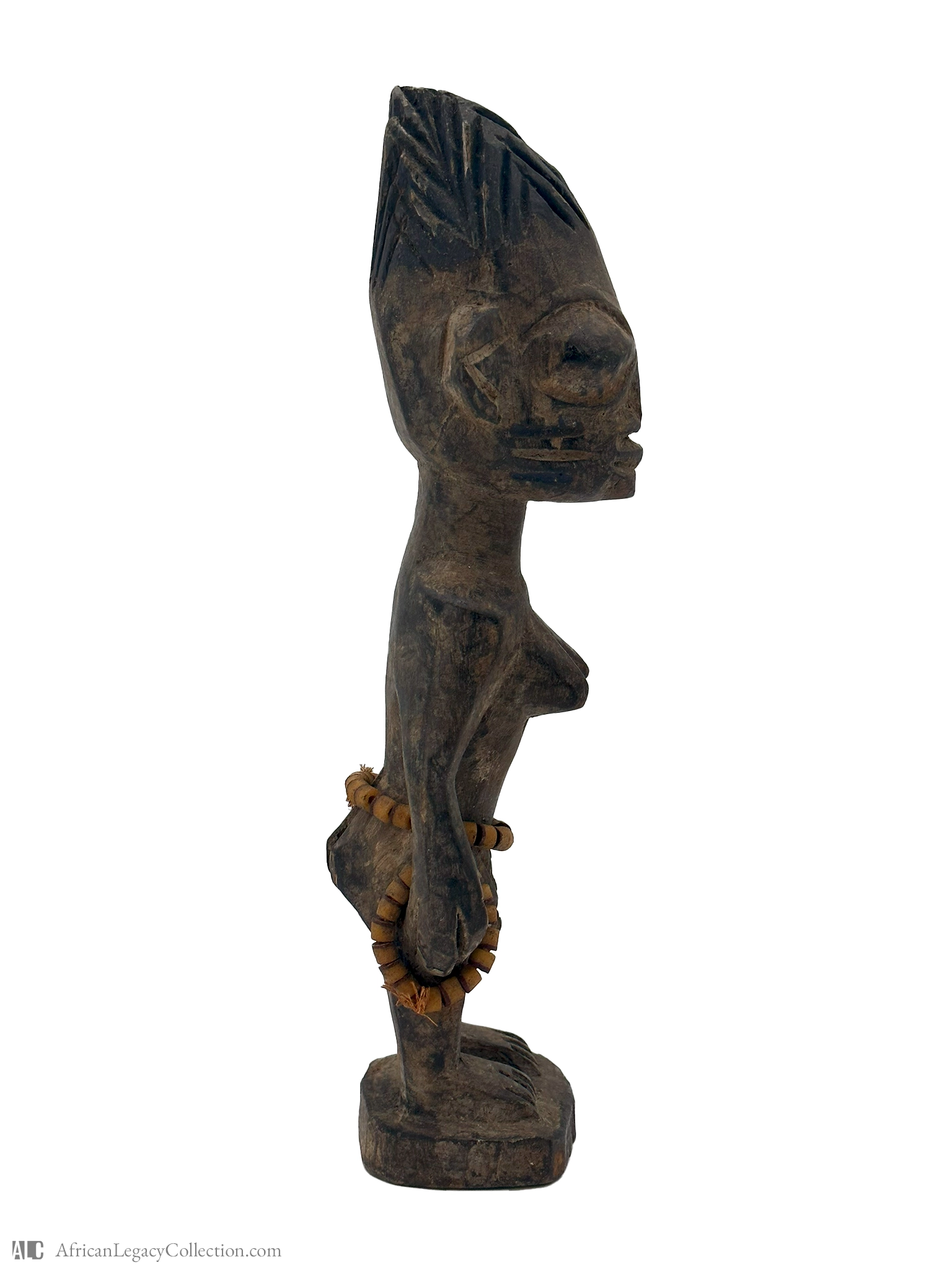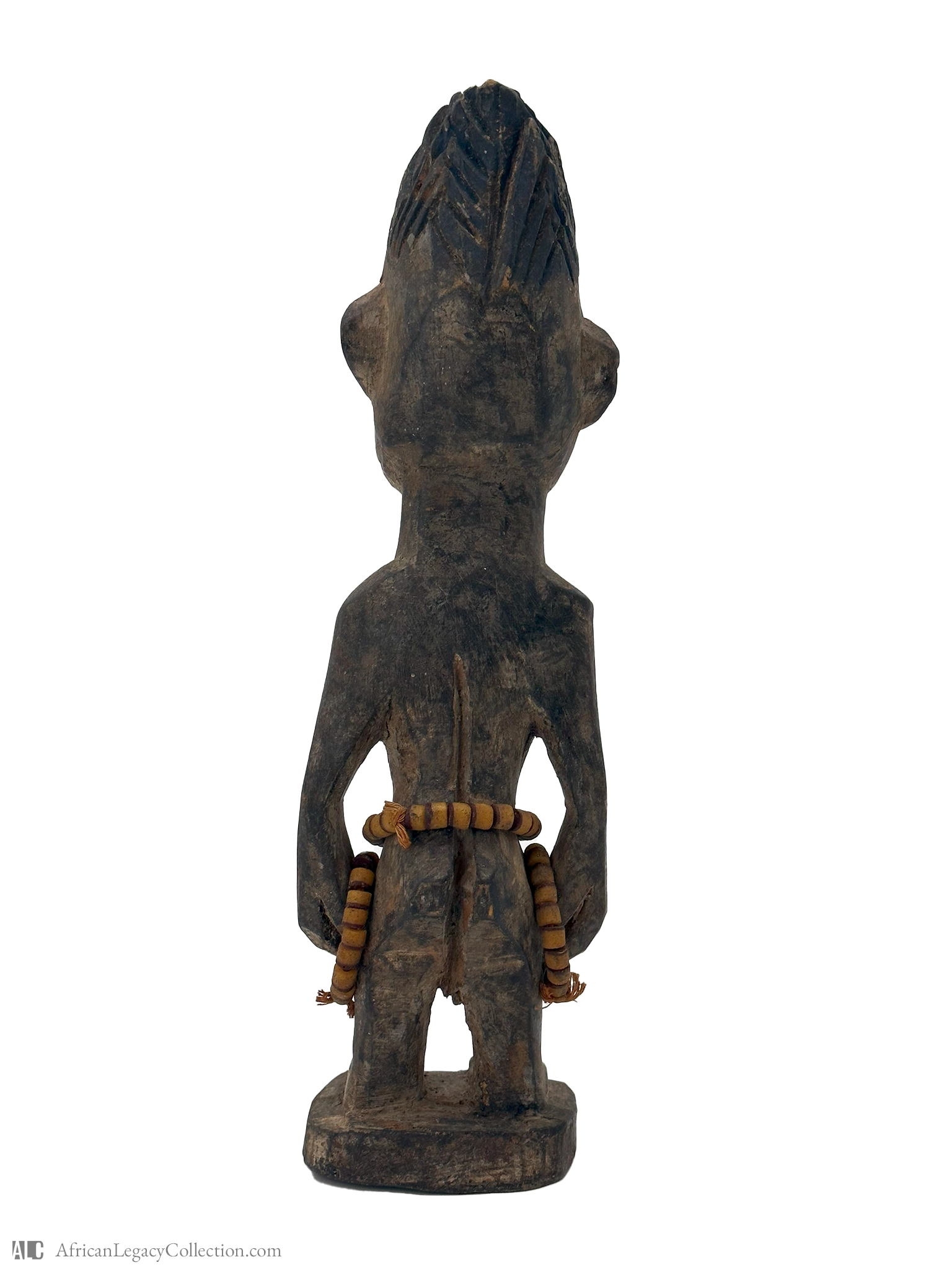 Crafted predominantly from wood, the figure displays incised striations and dark patina, characteristic of its region’s craftsmanship. Historically, such figures played a crucial role in linking the living with the spiritual realms, highlighting their cultural and societal significance in traditional African societies.