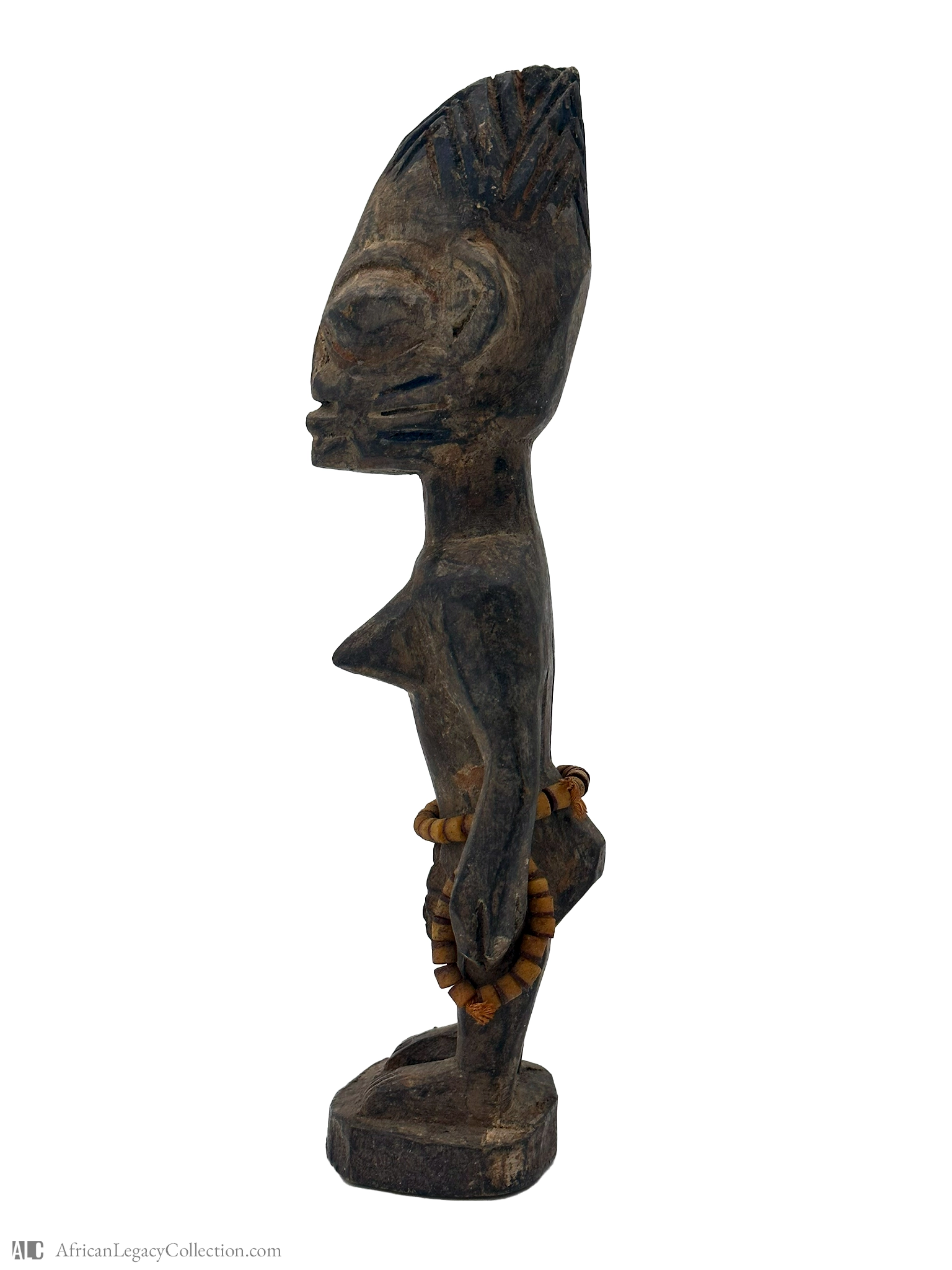 This wooden figure is likely representative of ancestral imagery, commonly seen in West African traditions. Its distinct anthropomorphic stylization suggests it served as a spiritual emblem, potentially used in ritual contexts to honor ancestors or invite protection from spiritual forces.
