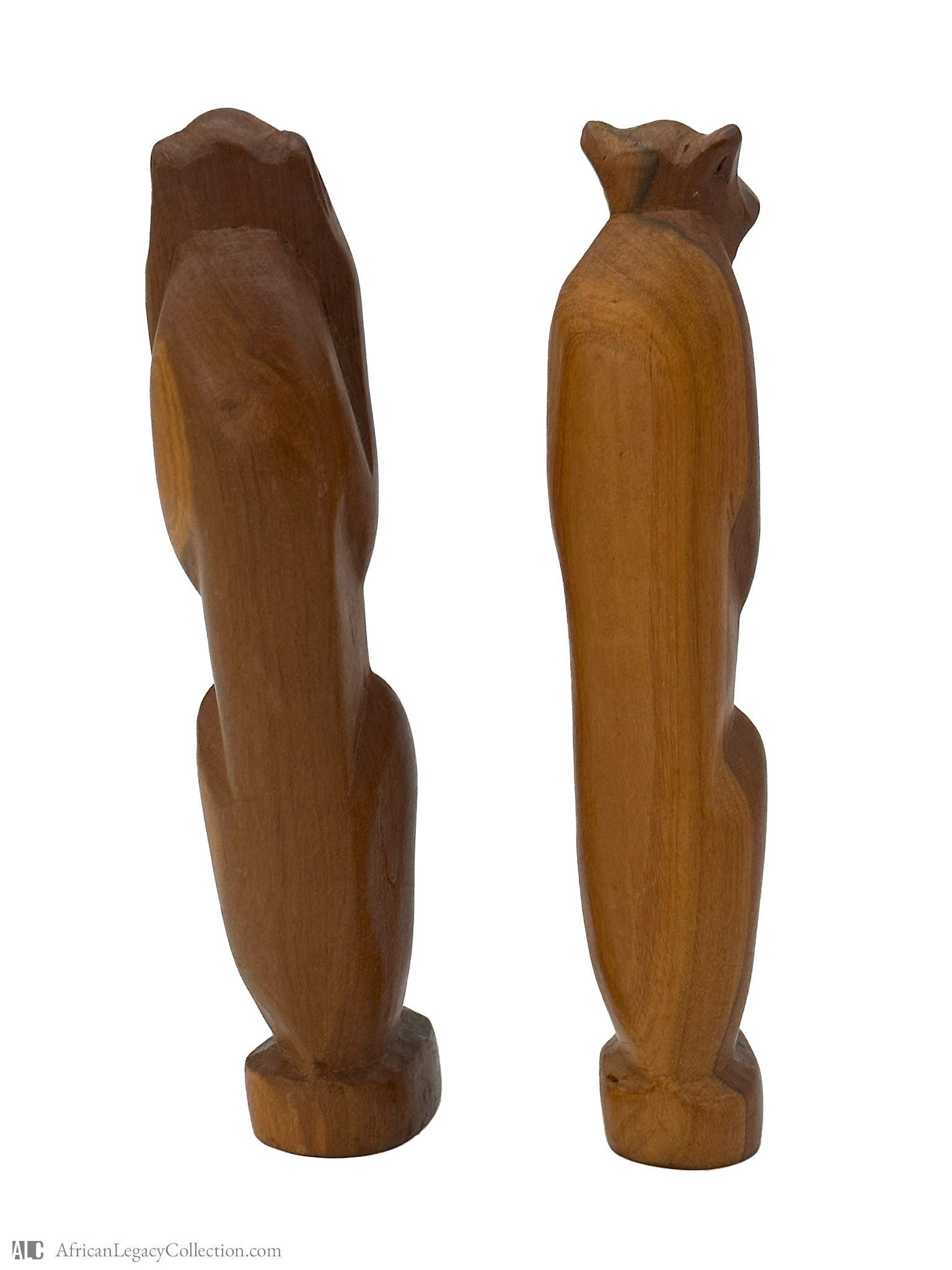 This pair of carved wooden figures likely originates from West Africa and may represent anthropomorphic or zoomorphic themes. These figures could have served various cultural or spiritual purposes, including use in rituals or as protective talismans.