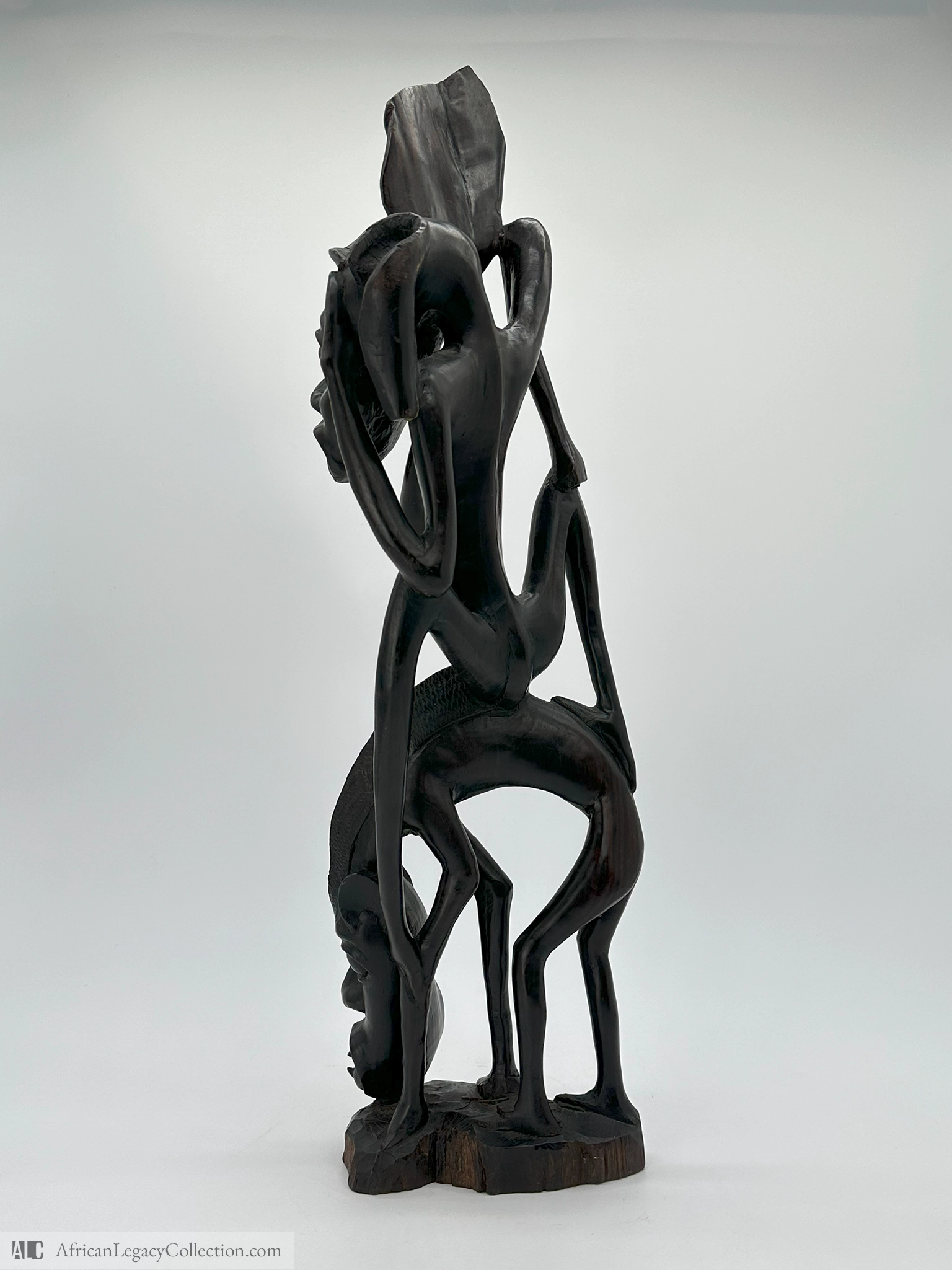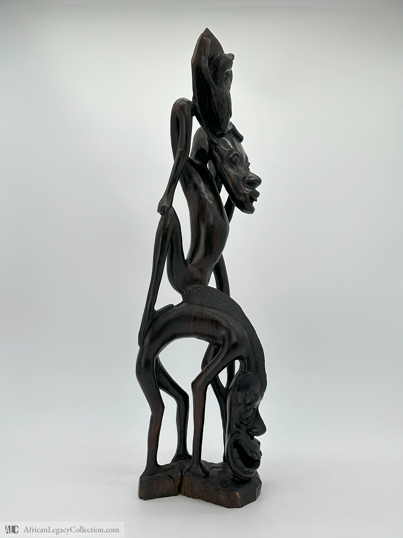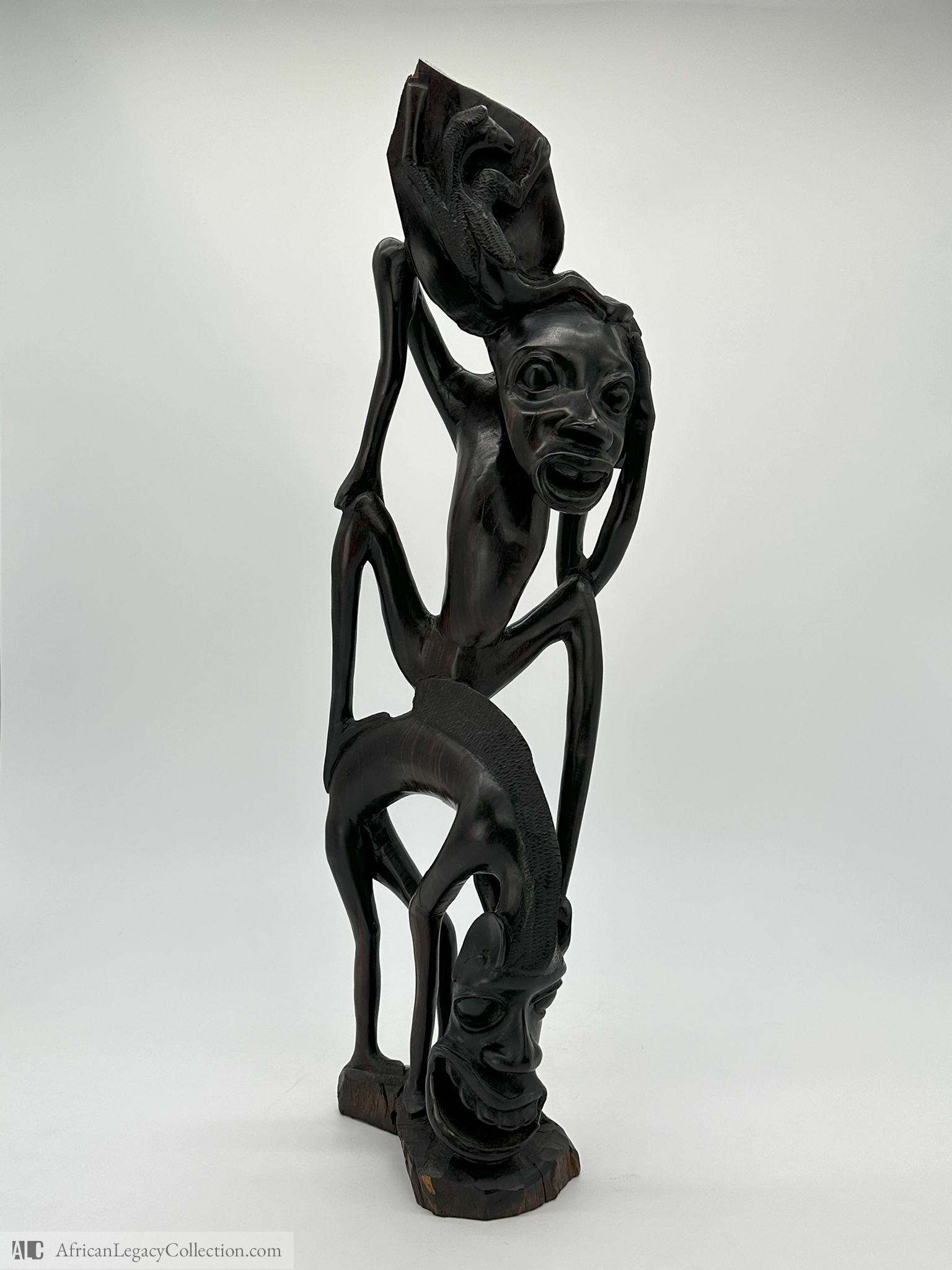 This intricately carved wooden sculpture likely originates from Central Africa and serves as a representation of anthropomorphic figures in traditional African art. Its dynamic pose and expressive faces suggest it may be intended for ritual or cultural storytelling purposes, reflecting the spiritual beliefs and social values of the community.