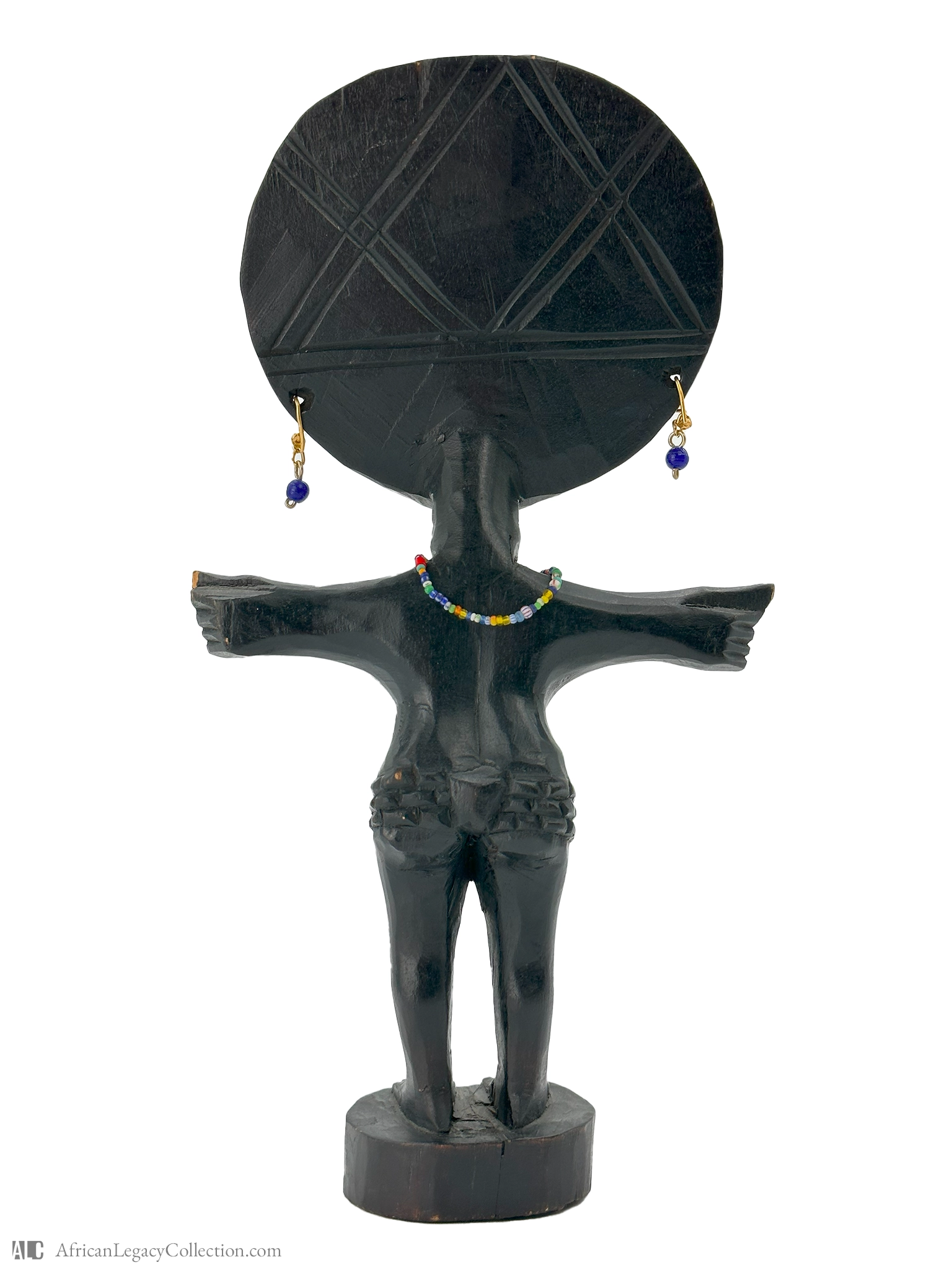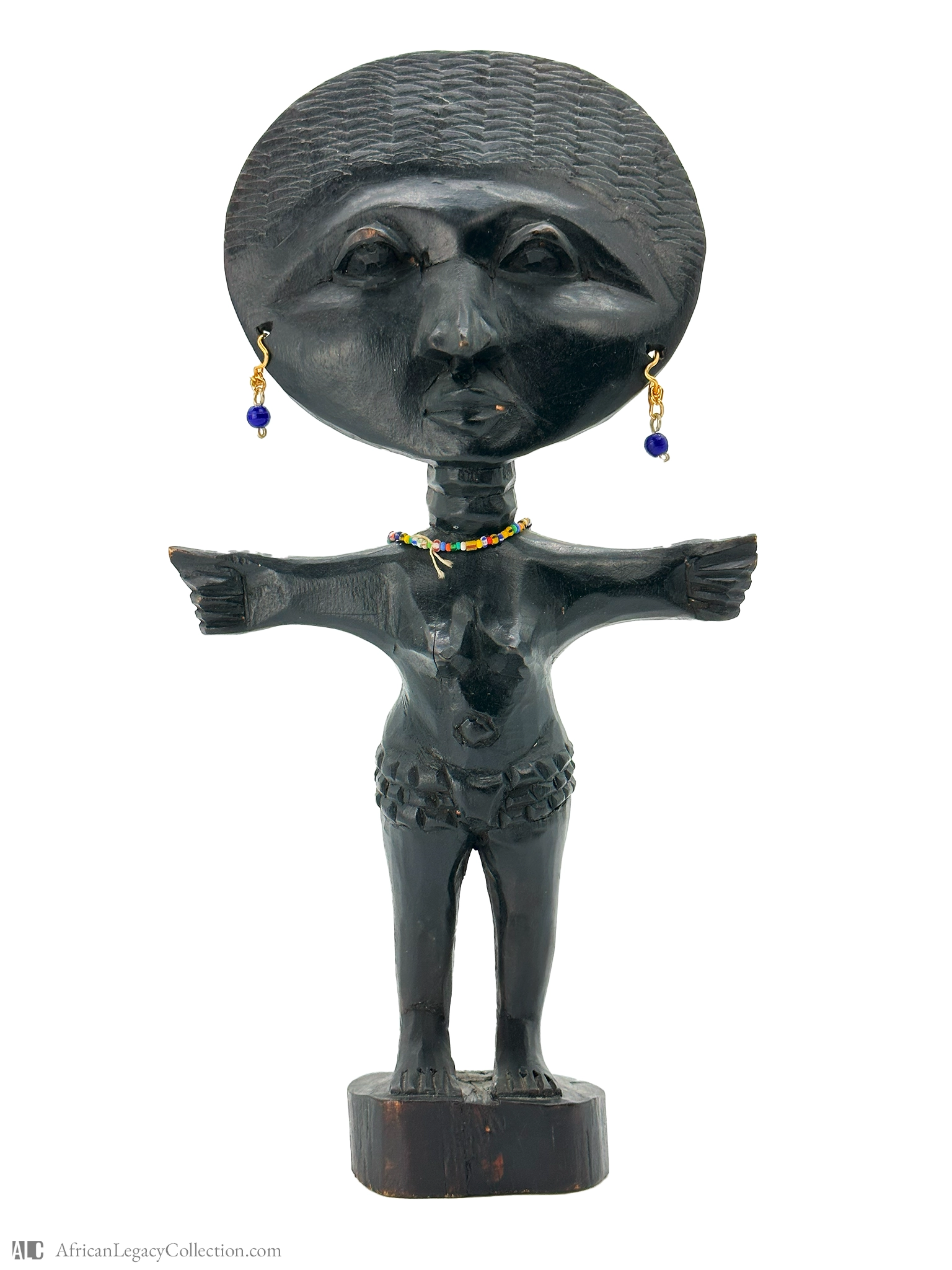 The piece is crafted from wood, indicative of traditional carving techniques indigenous to the region. The presence of beads and earrings adds to the decorative elements, suggesting that the figure may have had ceremonial importance. These figures typically held historical and cultural significance within their communities, often used in rites of passage or other significant cultural ceremonies.