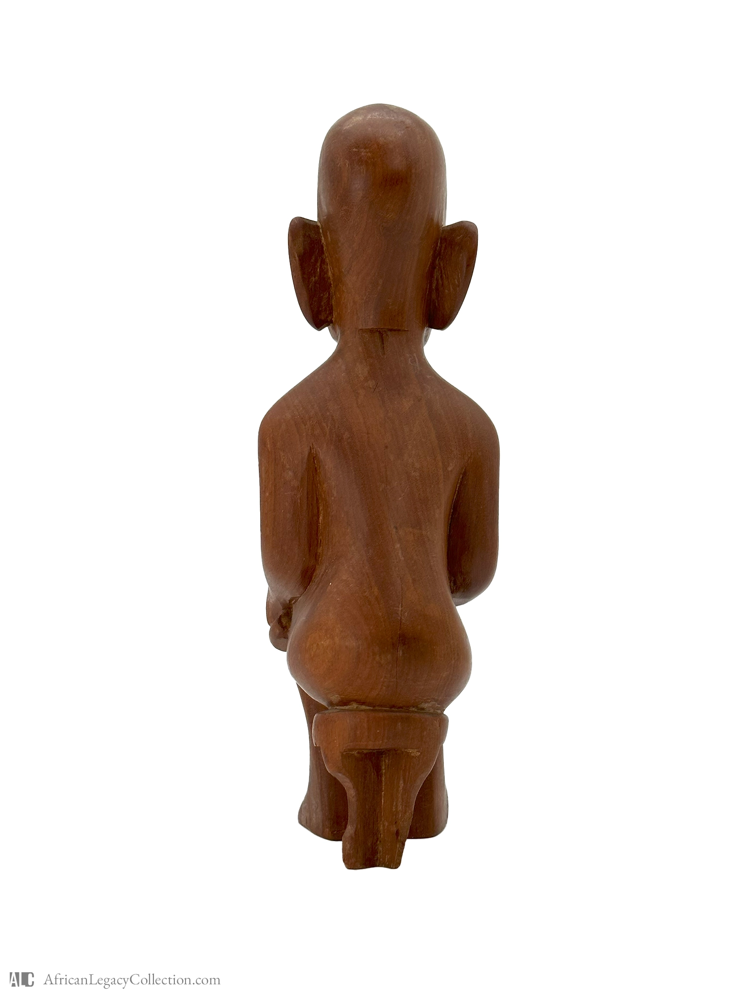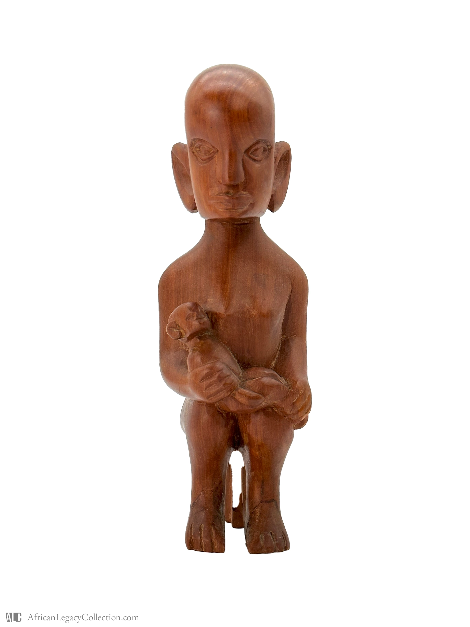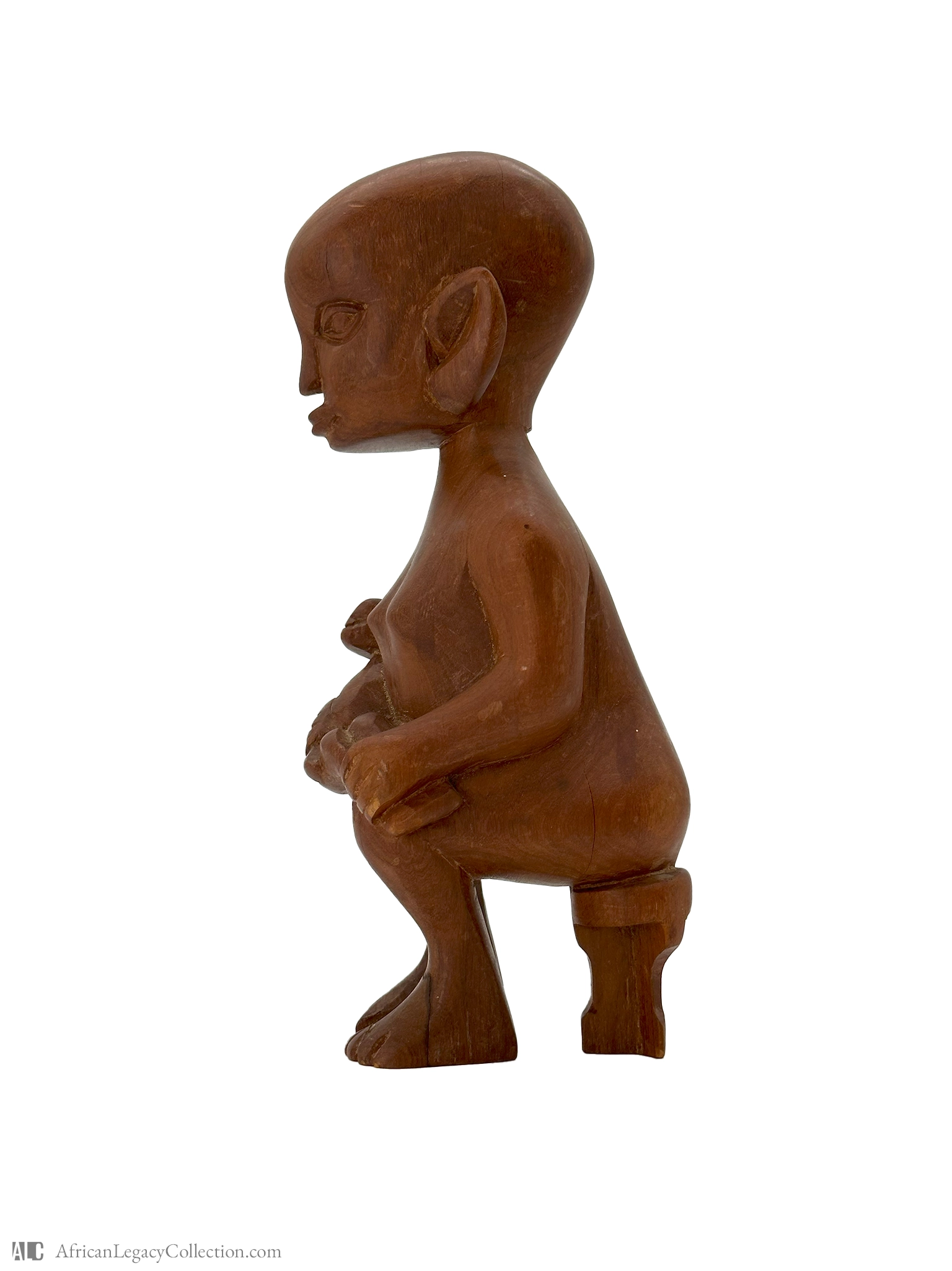 This wooden sculpture likely serves as a fertility figure, representing a seated woman with a child. Such artifacts are commonly found in West African cultures, where they are used in rituals to promote fertility and protect mothers and children.
