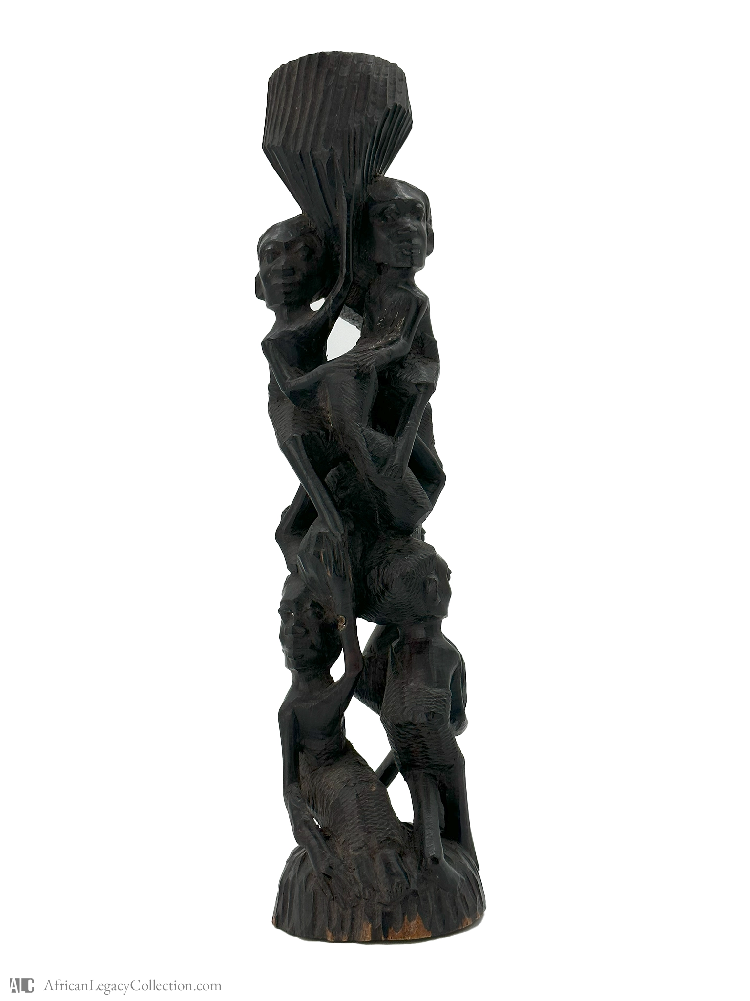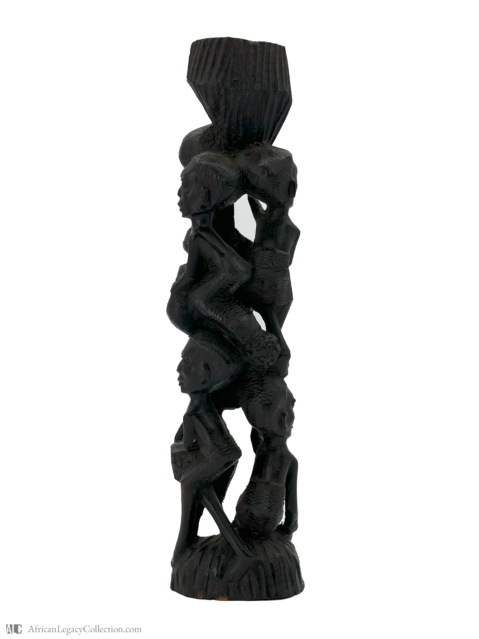 This carved figure likely originates from West Africa and serves as a decorative or symbolic object. The intricate design might represent community or family themes, common in African art, often highlighting societal roles and connections.