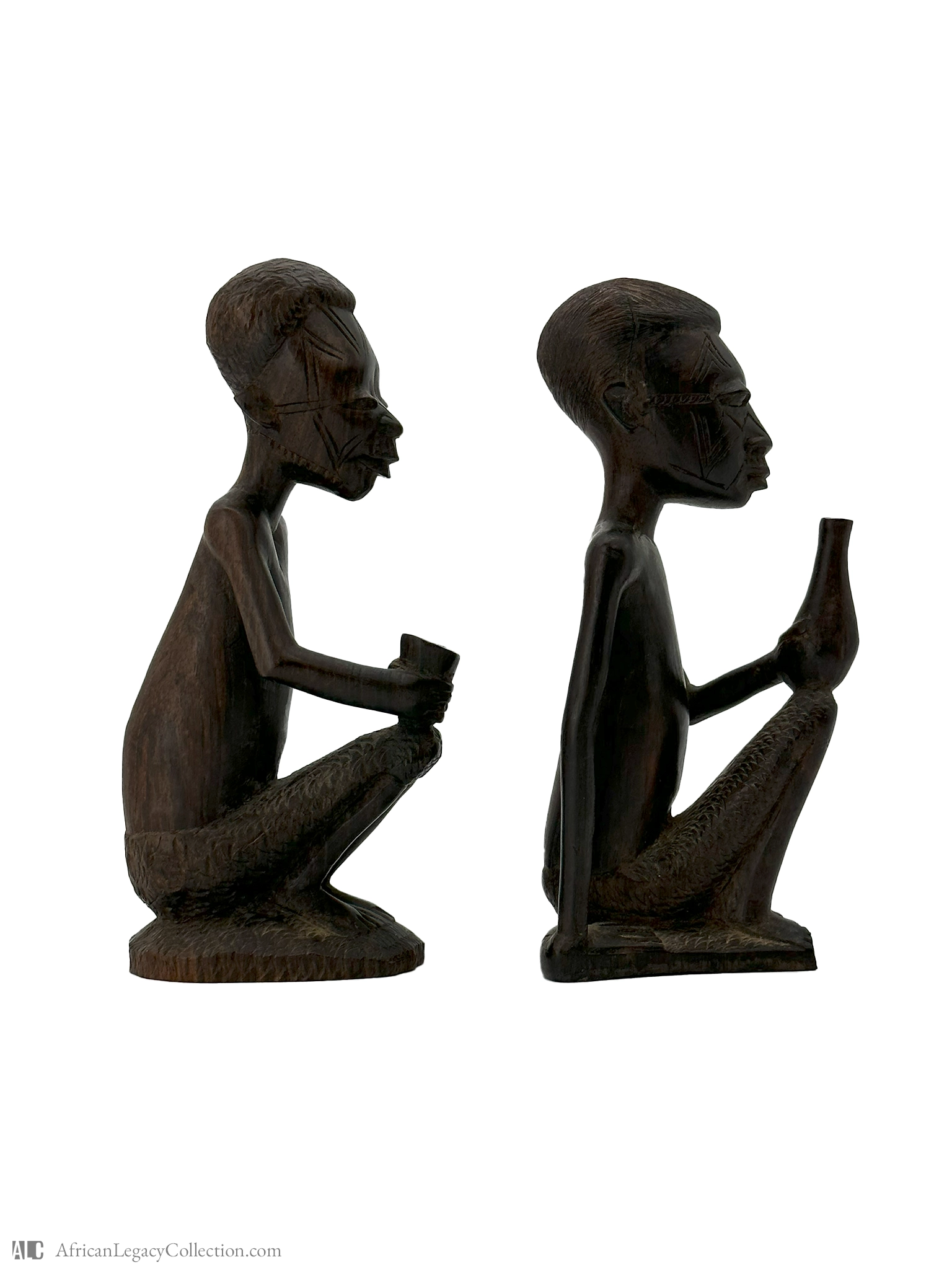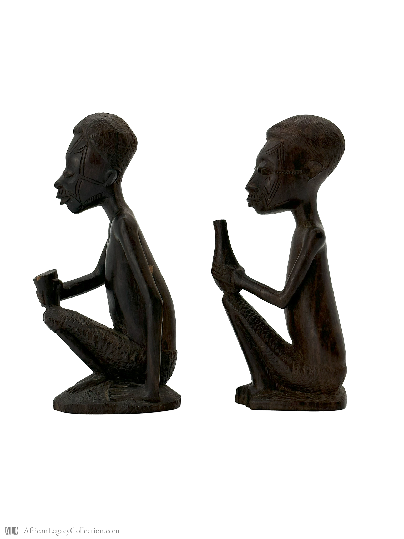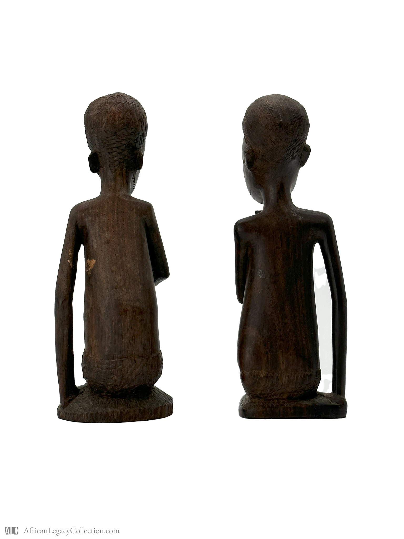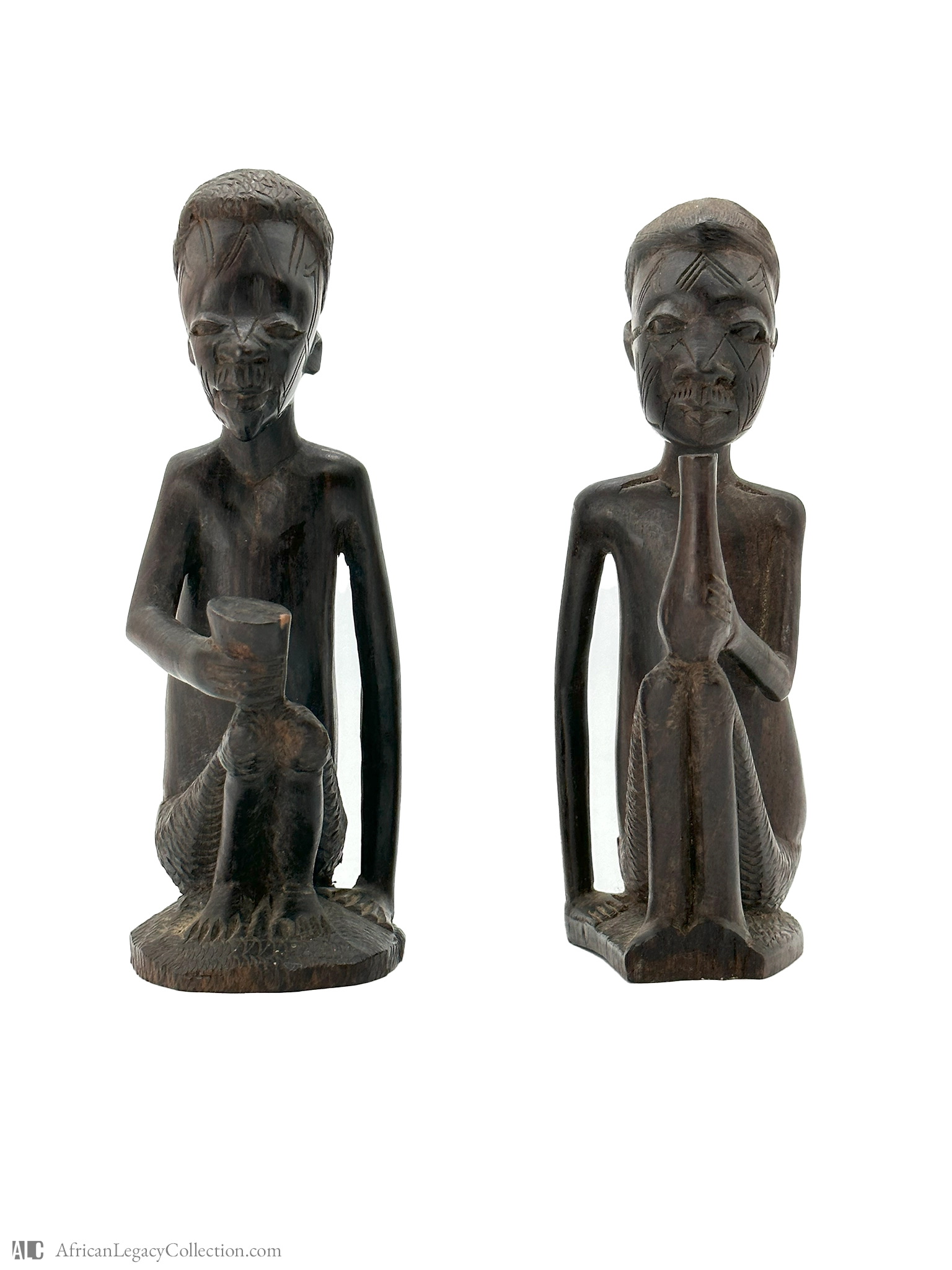 Crafted from dark wood, these sculptures showcase skillful carving techniques emphasizing anthropomorphic stylization. The presence of incised striations and the patina’s texture suggest an art piece with both aesthetic and historical value, reflecting the traditions and skills passed down through generations.