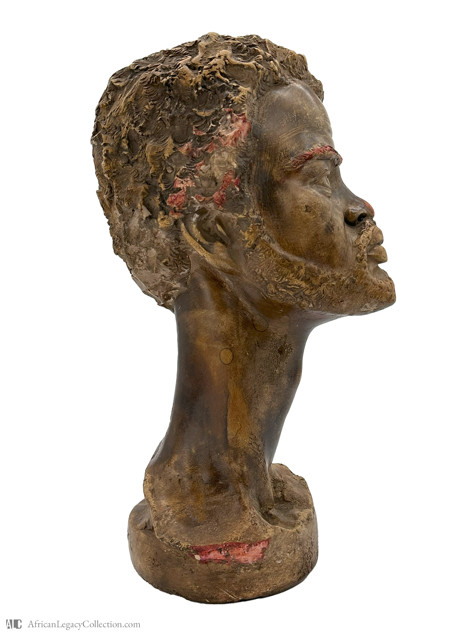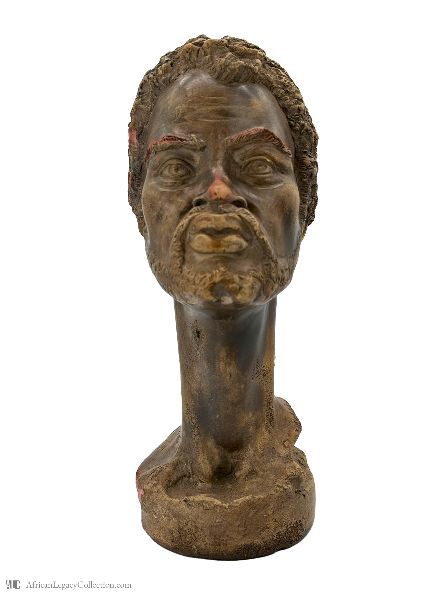 This sculptural bust is representative of African artistry, likely originating from West Africa. It portrays a male head with intricate detailing that suggests its use as a display piece or to honor an individual of significance within a community. Its form captures the essence of traditional portraiture, wherein the subject’s personality is emphasized.