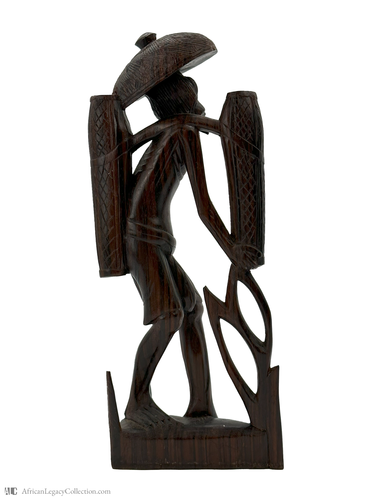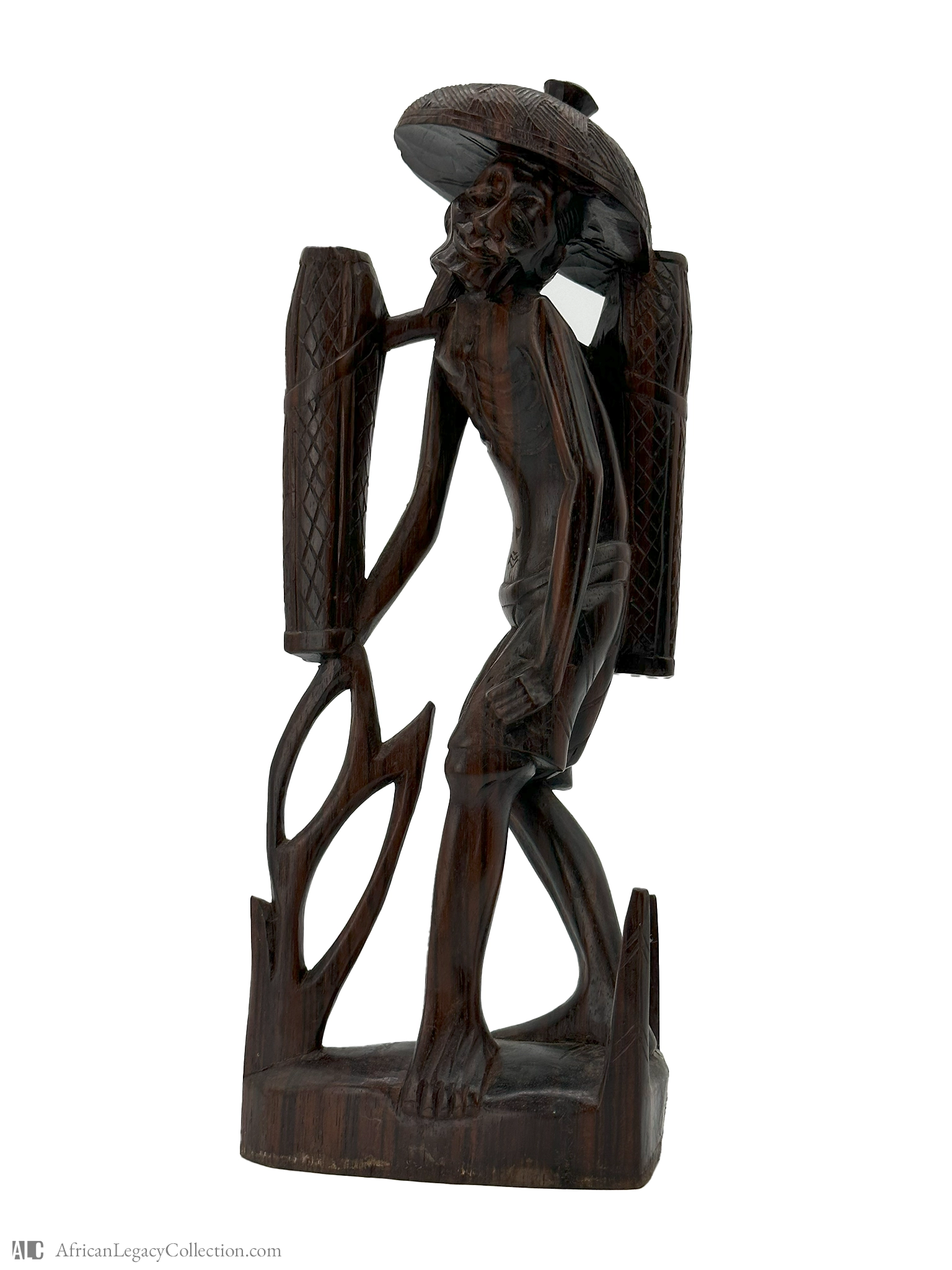 Crafted predominantly from dark, polished wood, the sculpture showcases intricate carving techniques that highlight the artisan’s skill. Such figures are emblematic of mid-20th century African art, often reflecting the cultural practices and societal roles within their communities. The piece stands as a testament to the rich artistic heritage and social themes of its time.