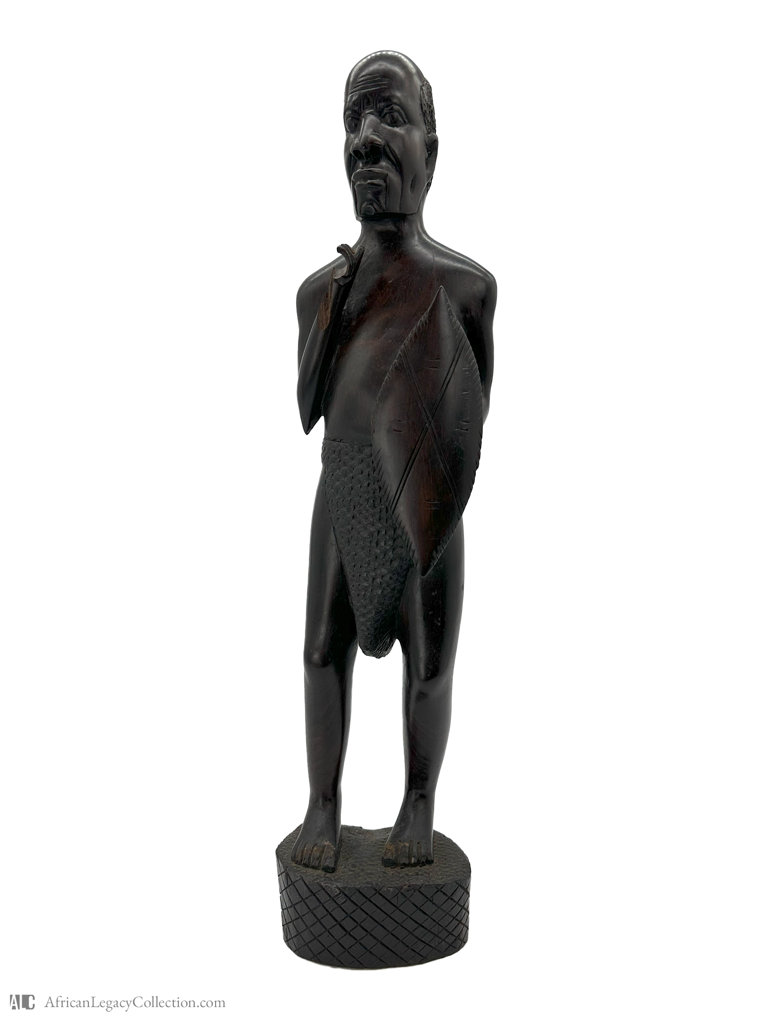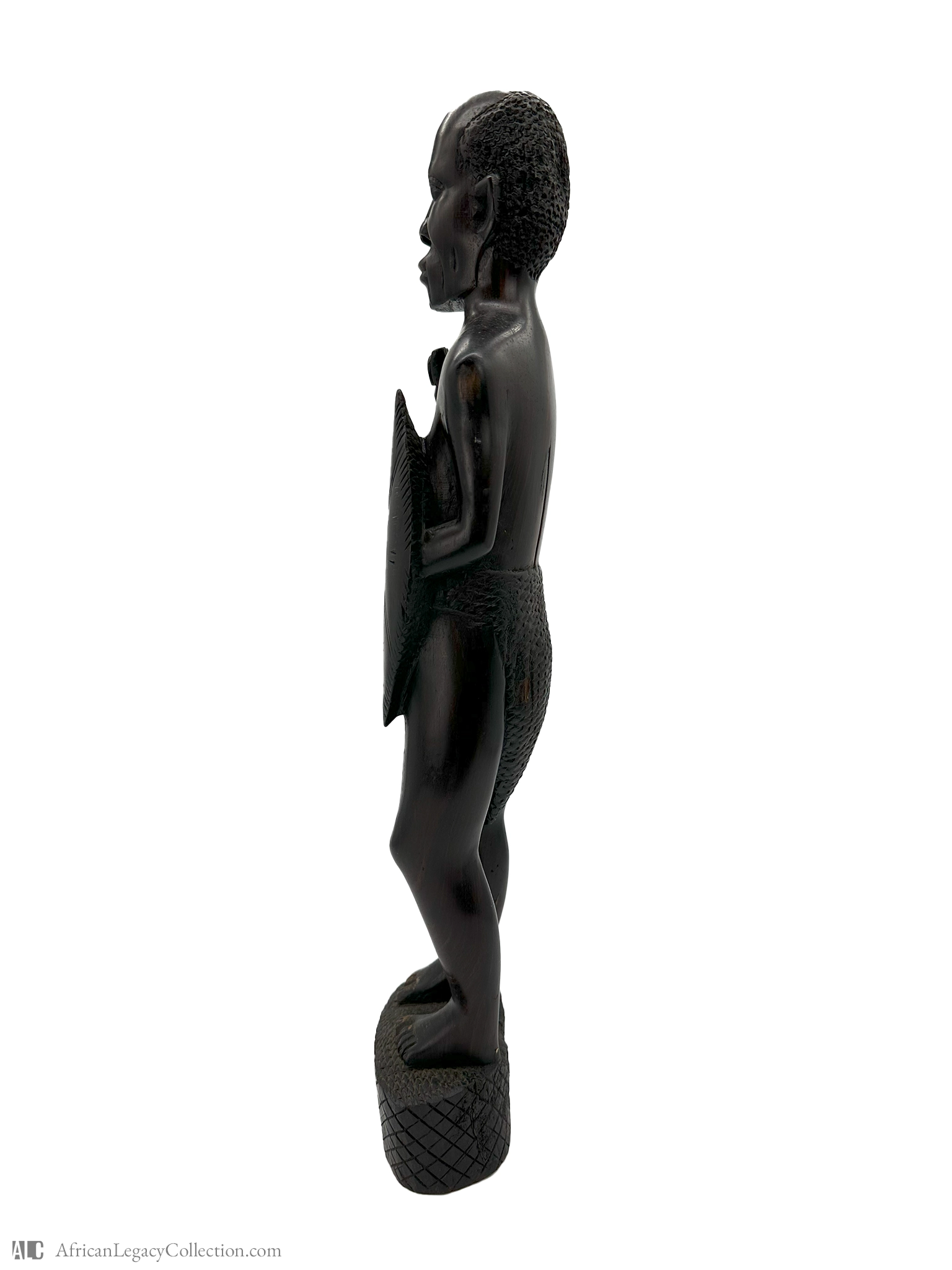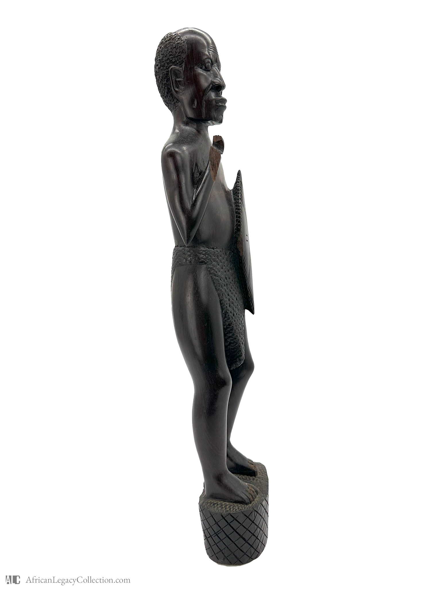 This intricately carved sculpture represents a standing male figure, likely originating from Central Africa. It is believed to represent a warrior due to the presence of a shield, a common symbol of protection and strength. The artifact might have served a ceremonial role, possibly used in rituals or as a status symbol within the community.