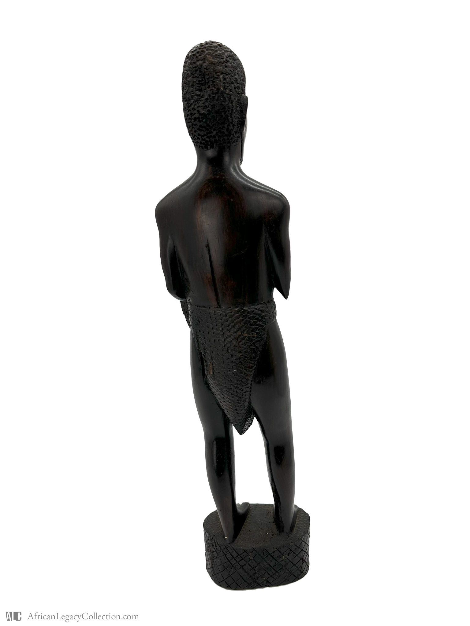 Crafted from dark hardwood, the statue showcases fine incised details and smooth finishes typical of skilled carving traditions. This piece is characteristic of mid-20th-century African art, reflecting both cultural heritage and identity. Its craftsmanship highlights the importance of wood as a material in African art, often associated with religious and social significance.