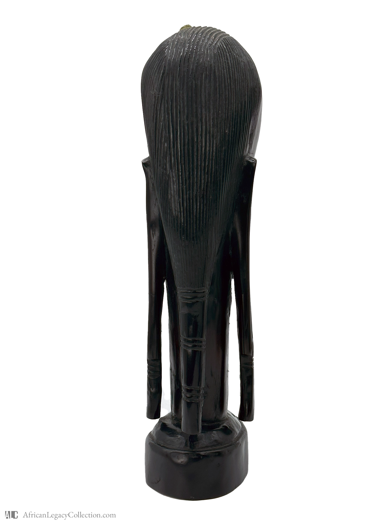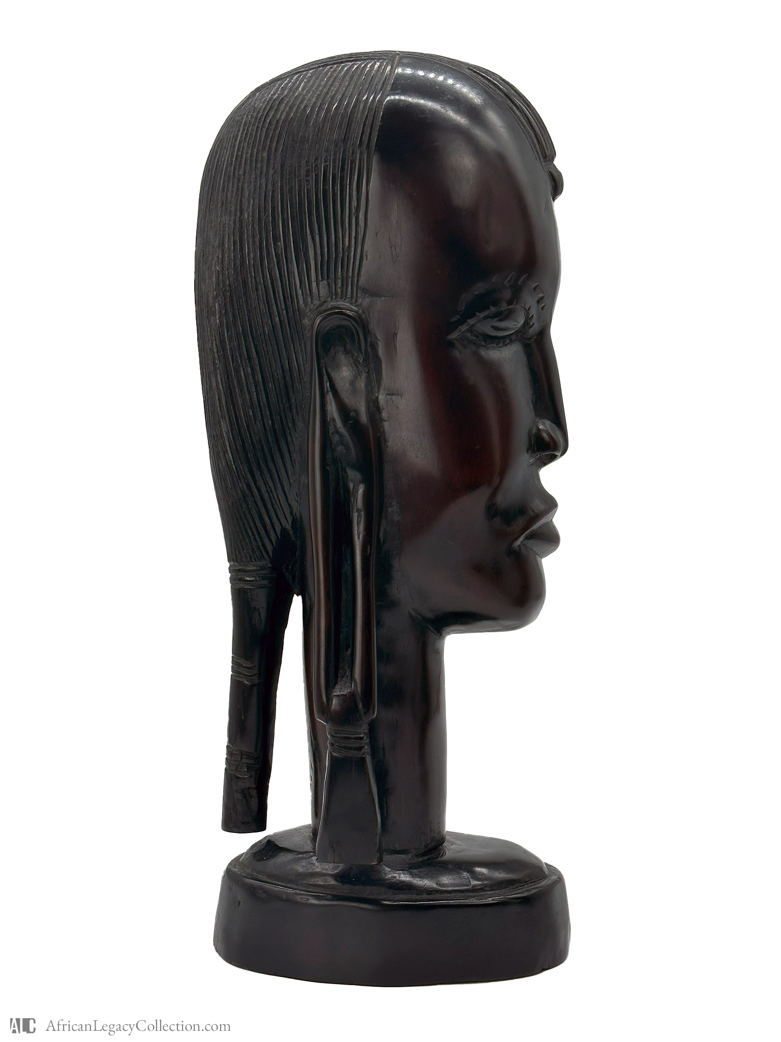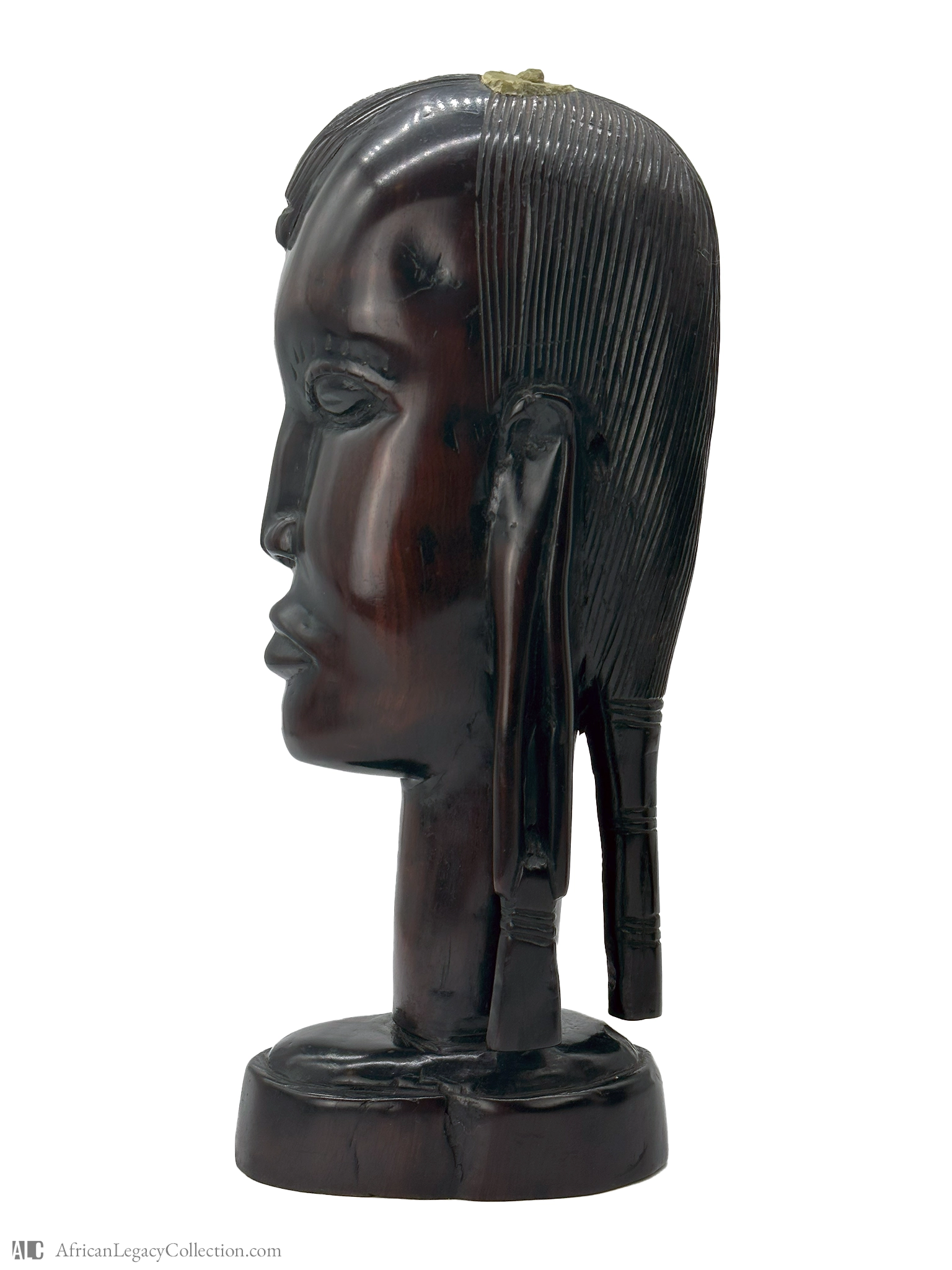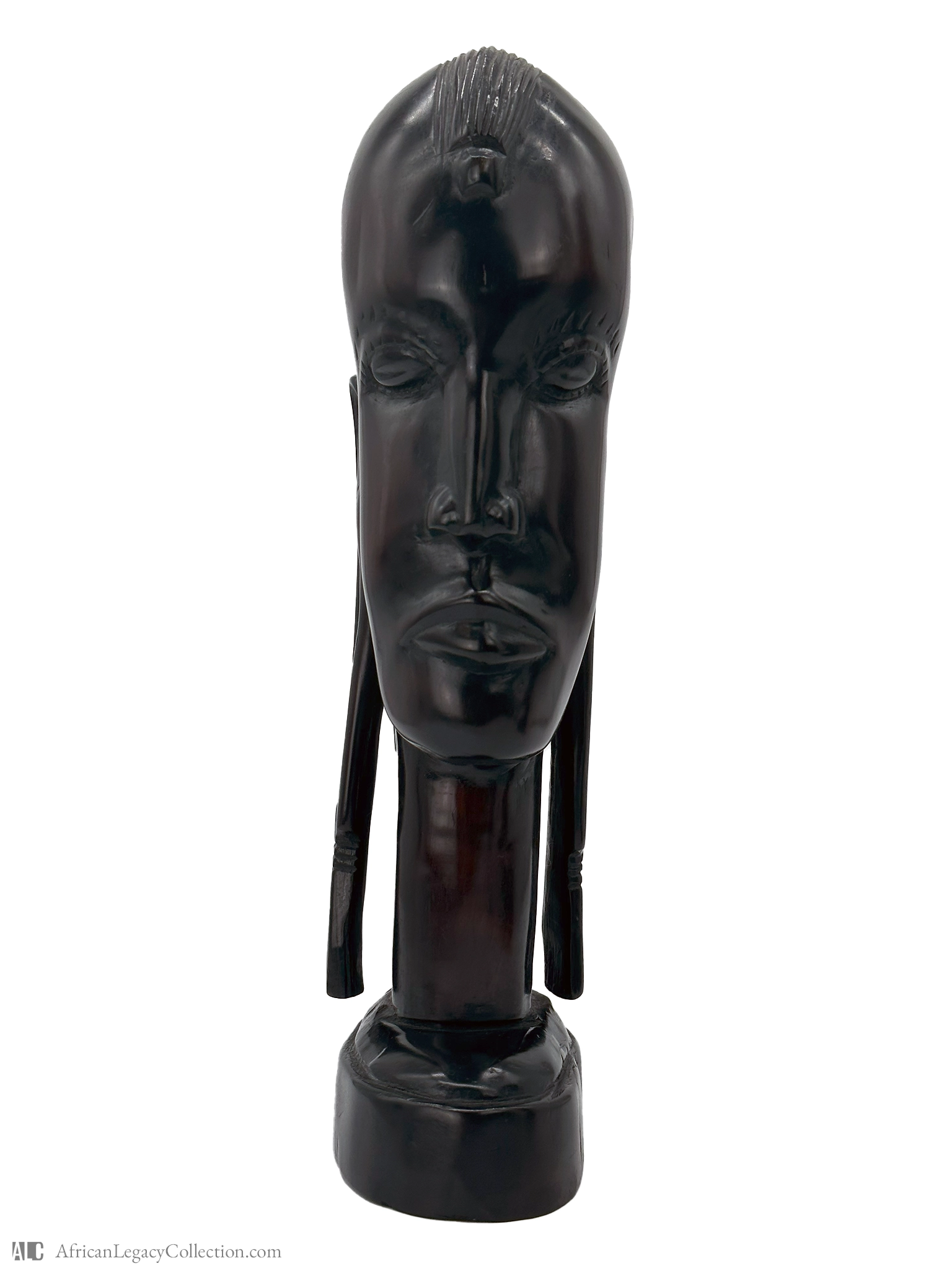 Crafted predominantly from dark wood, the sculpture may have been produced during the 20th century, reflecting techniques such as incised striations for detail in the hair and facial features. Its function extends beyond decoration, potentially playing a role in cultural rituals or as a symbol of identity and heritage.