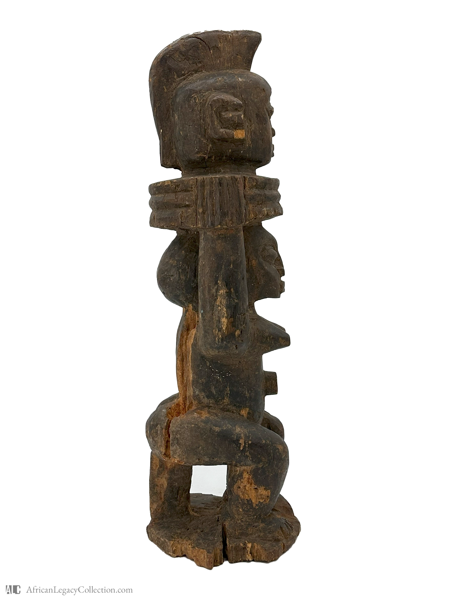 Carved from a single piece of wood, this figure exhibits scarification motifs, indicative of significant cultural symbolism. It is believed to date back to the late 19th or early 20th century, reflecting the artistic practices of its time. Its weathered patina demonstrates historical usage and adds to its authenticity as a ceremonial artifact.
