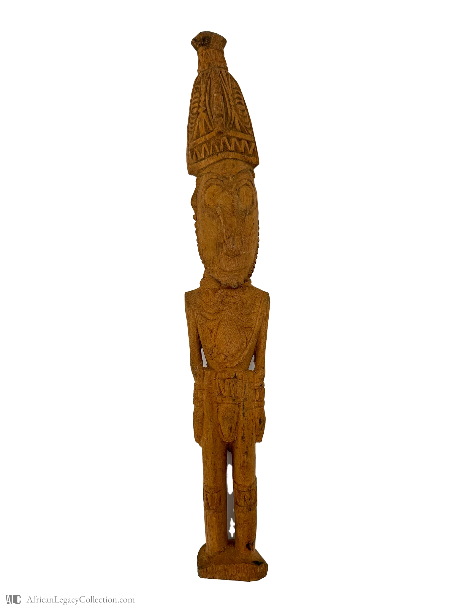 This carved wooden figure likely originates from West Africa and serves an important ceremonial or representational function. It depicts an anthropomorphic form adorned with detailed carvings, possibly indicating a figure of authority or reverence.