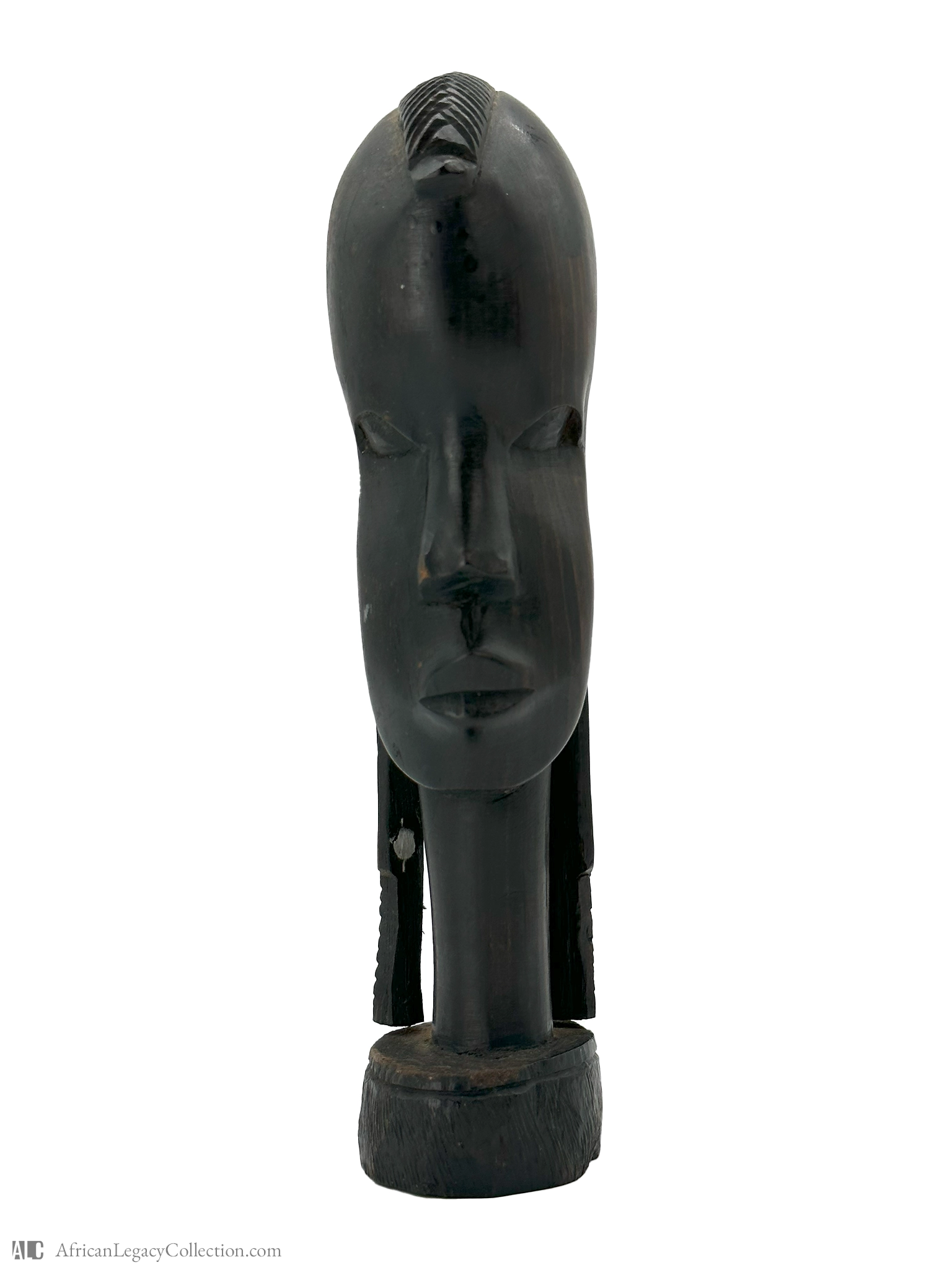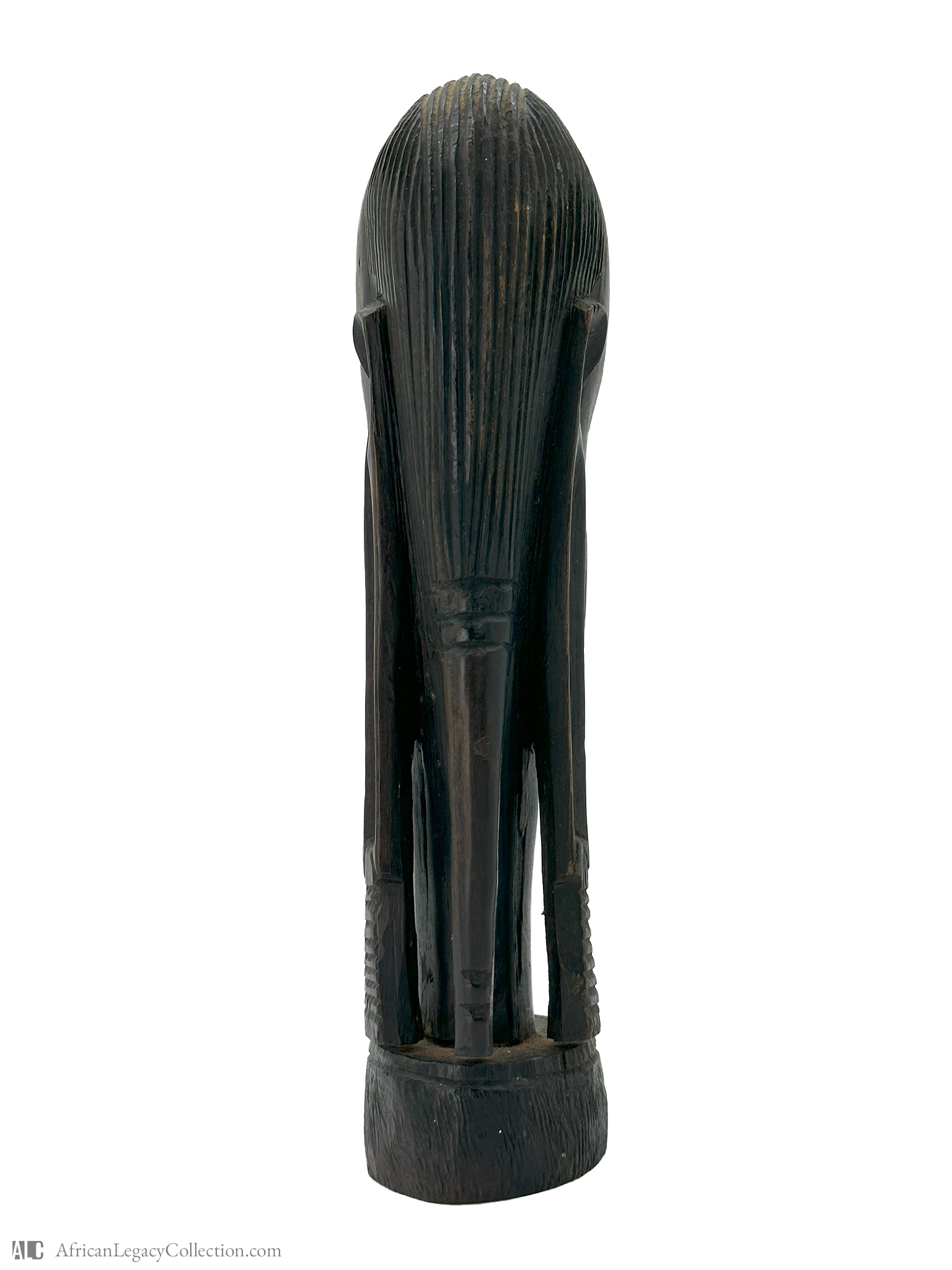 Crafted from a single piece of dark wood, this sculpture features incised striations that highlight the artistry involved in its creation. The style suggests a historical context rooted in the rich tradition of African woodcarving, known for its emphasis on form and beauty. Such artifacts contribute significantly to our understanding of the cultural and artistic practices of the region.