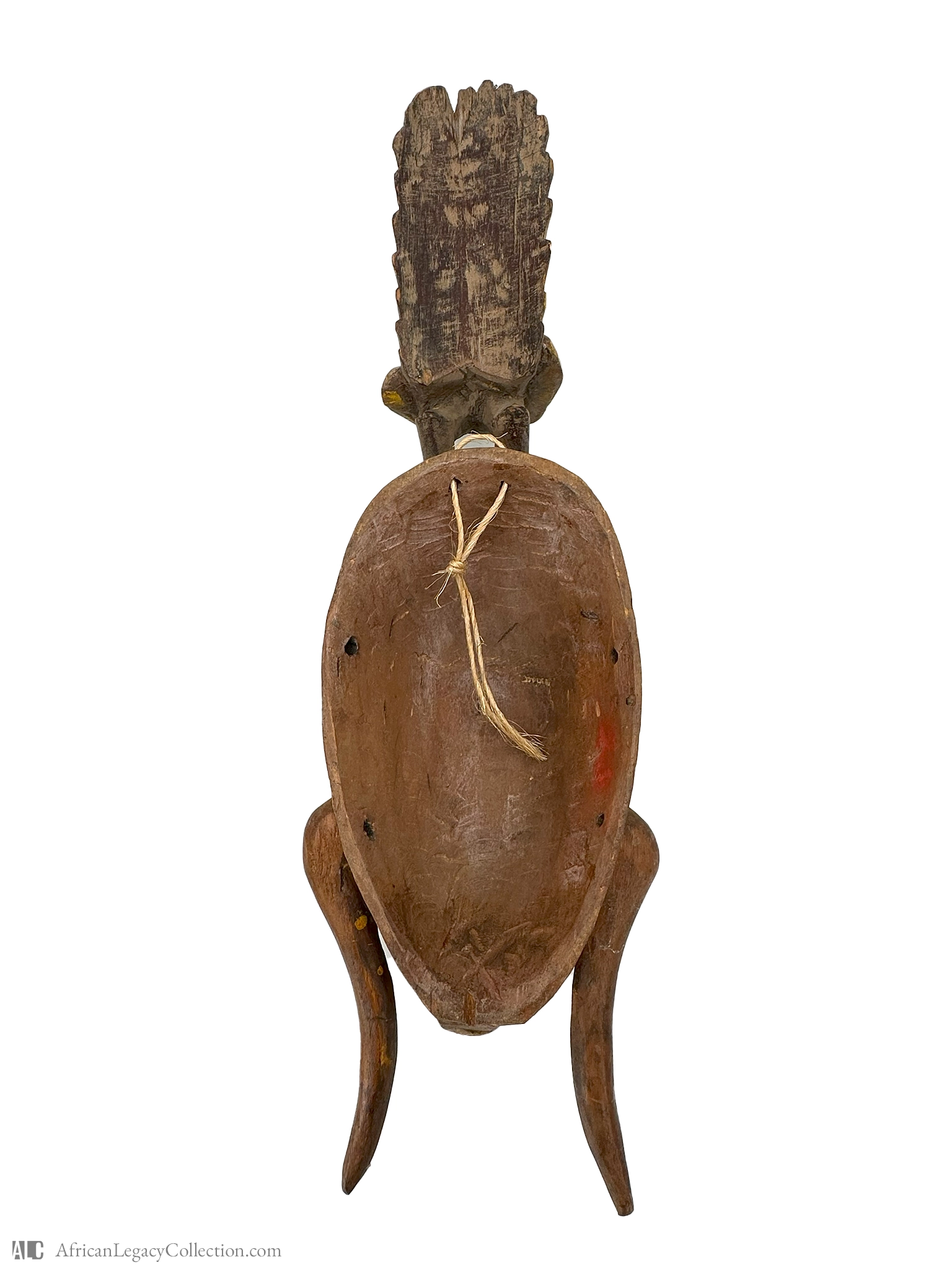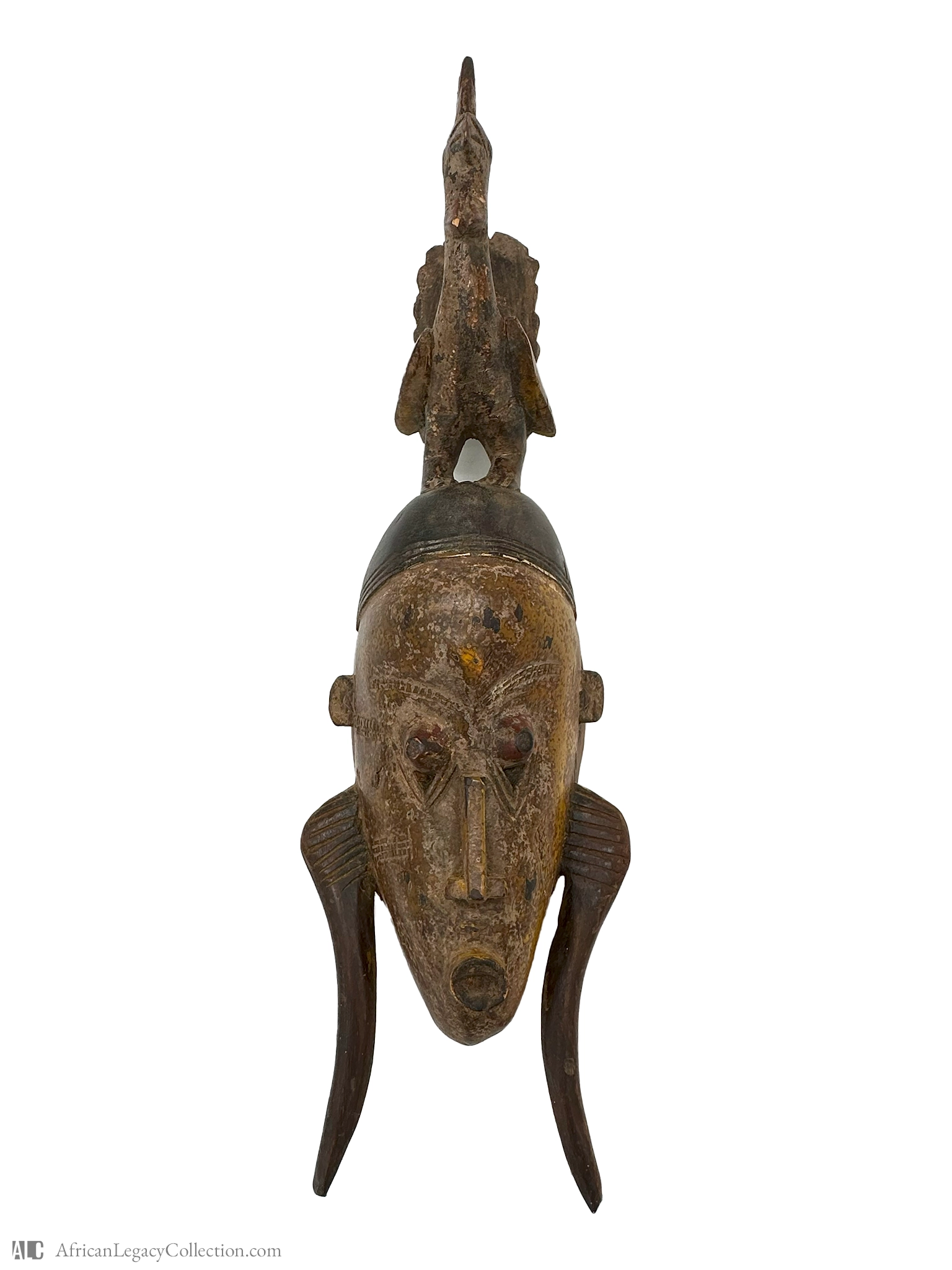 This mask is likely used in ceremonial contexts by the Senufo people of West Africa. Featuring elongated features and intricate carvings, it likely serves a ritualistic purpose, possibly in initiation rites or harvest festivals, meant to connect with ancestral spirits.
