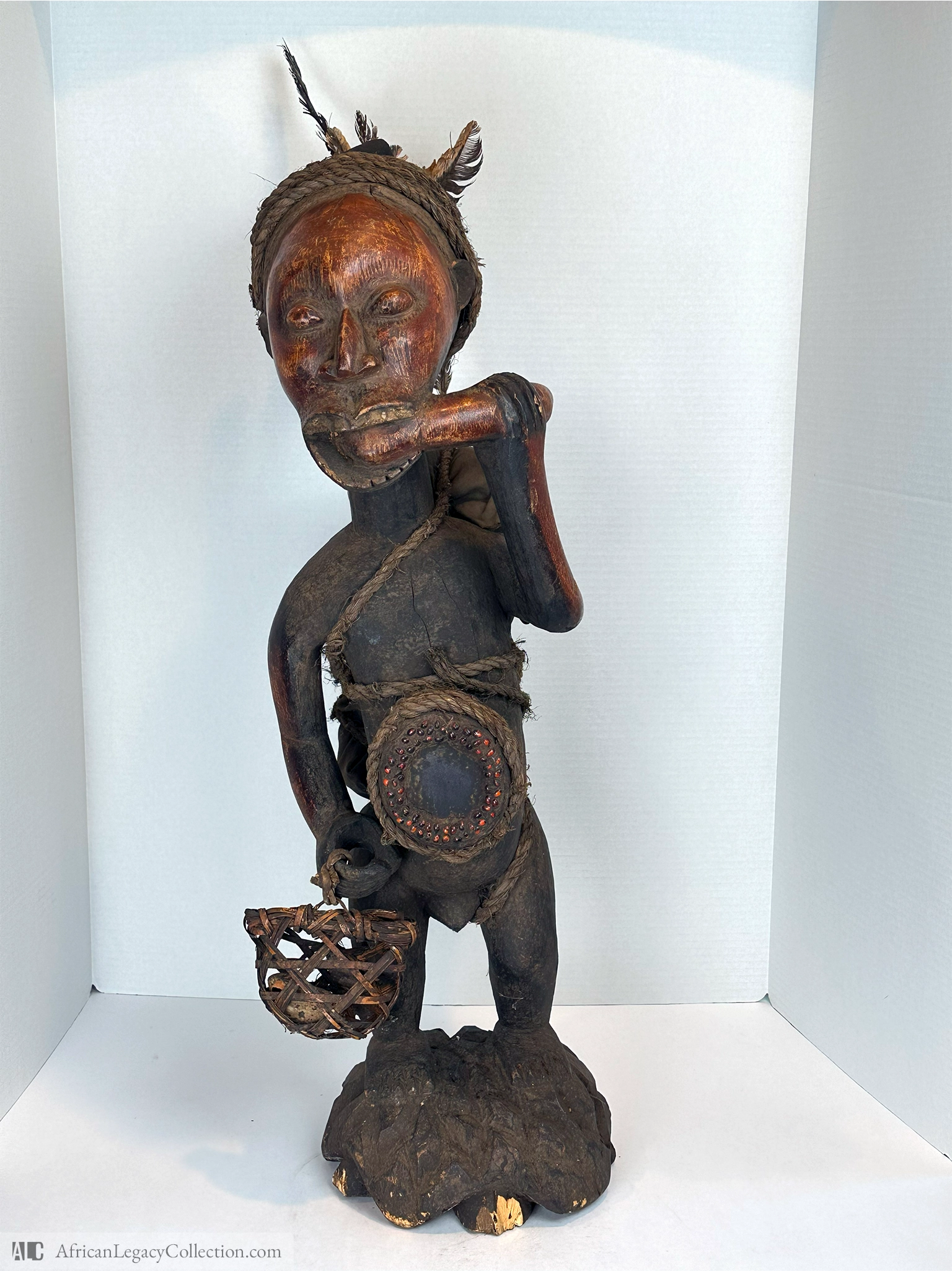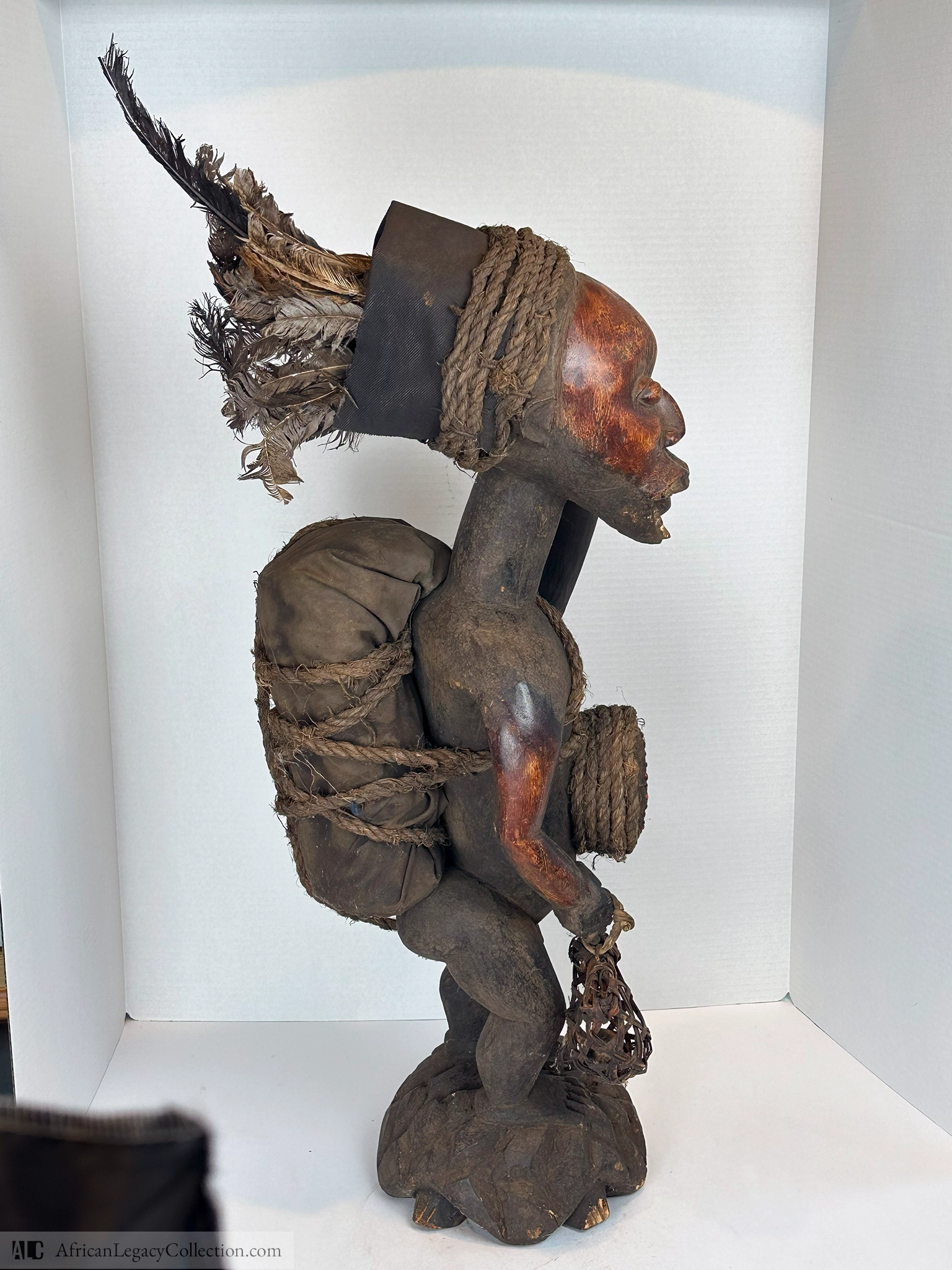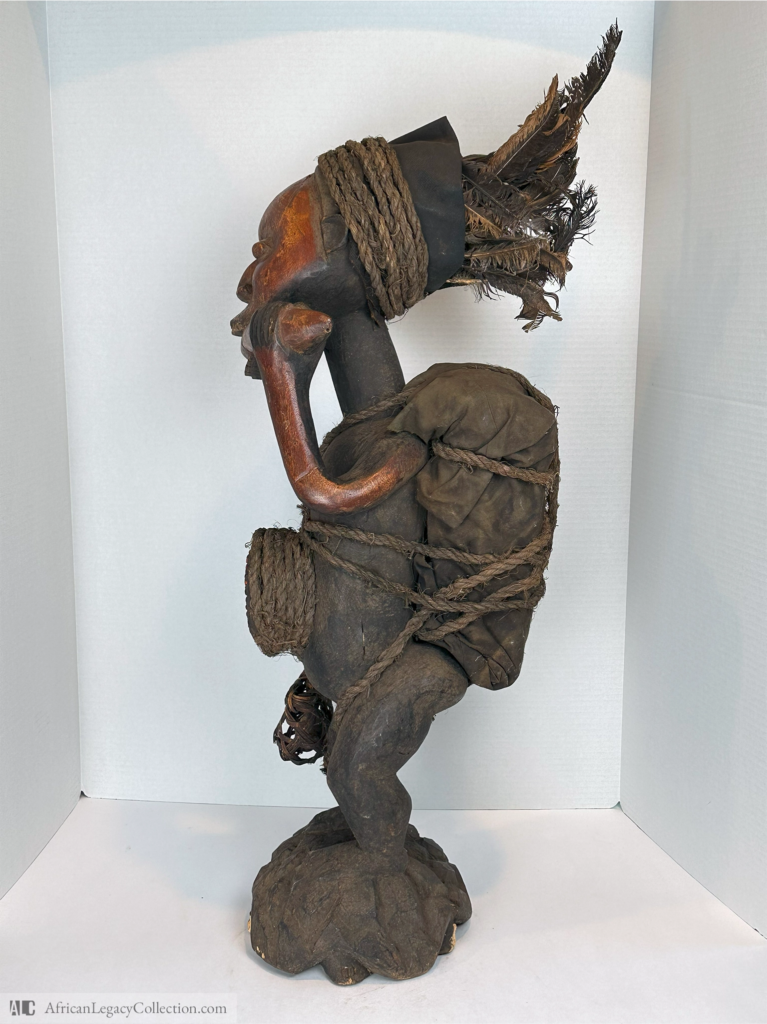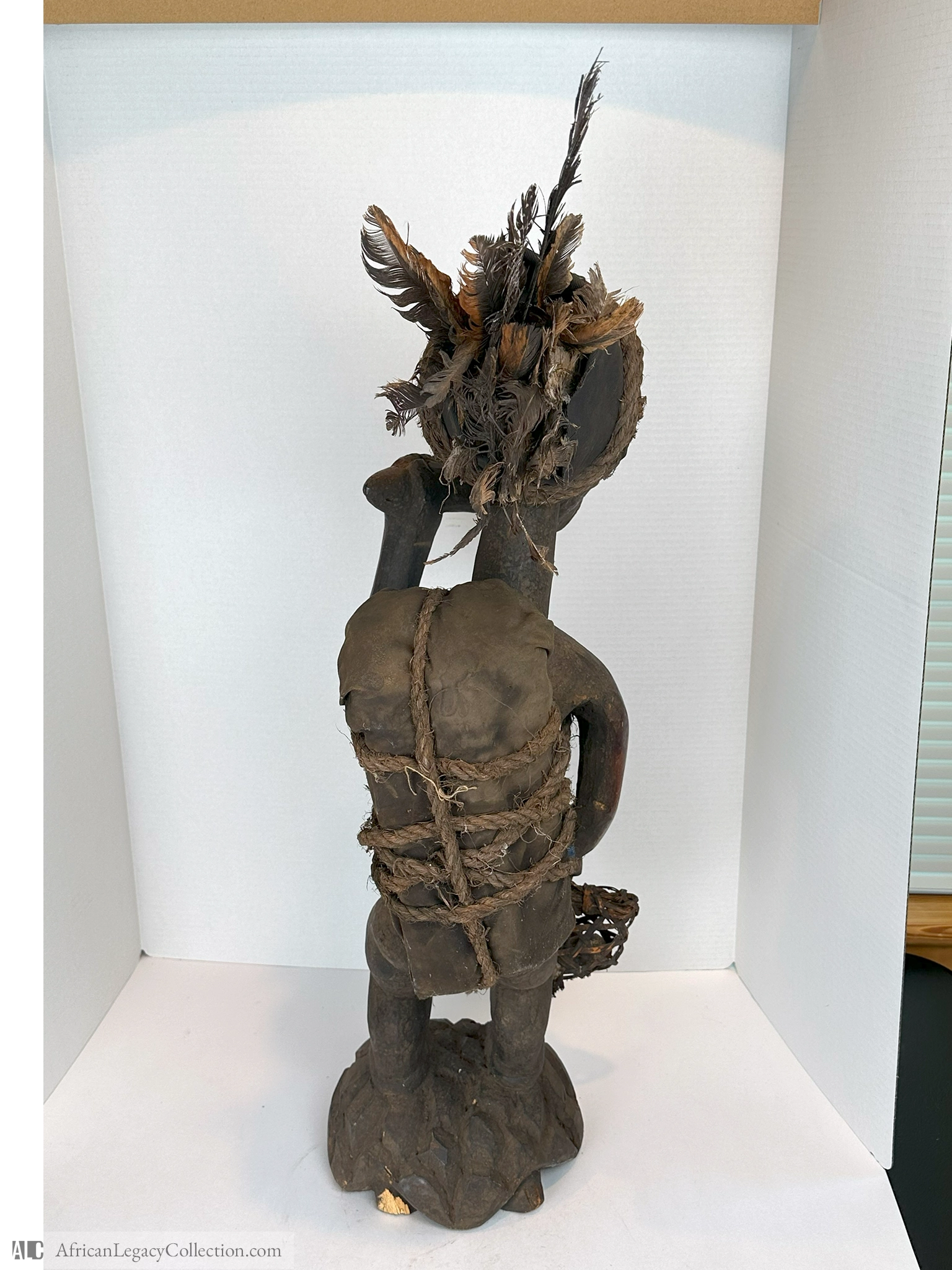 Crafted from wood with additional materials such as fabric, rope, and feathers, the statue exhibits traditional techniques seen in African art. The patina on the wood and integrated elements suggest significant age and use. Such artifacts have been historically significant in maintaining cultural heritage and spiritual beliefs.