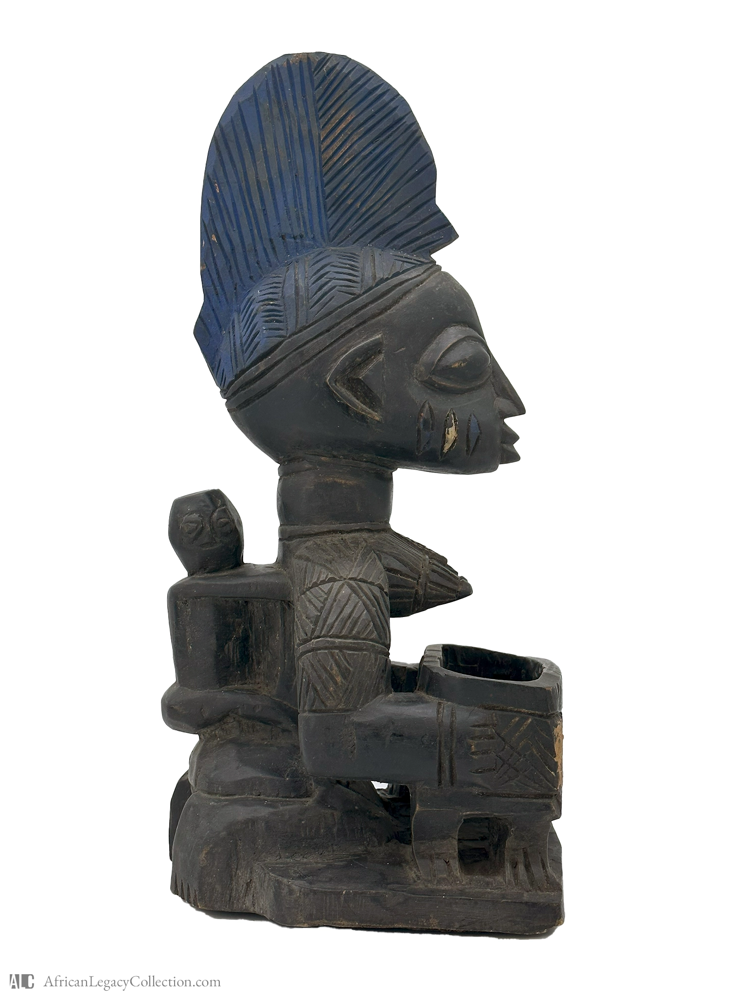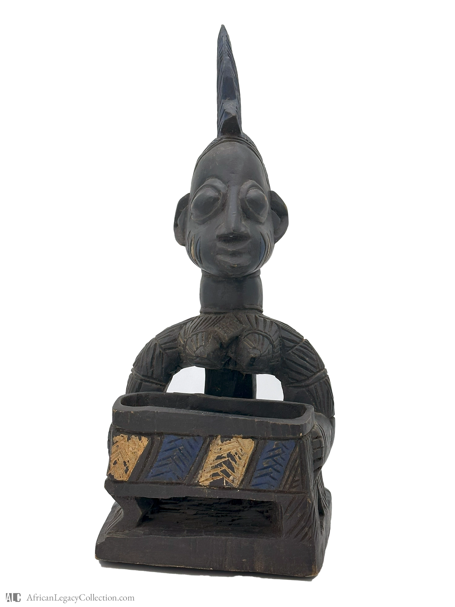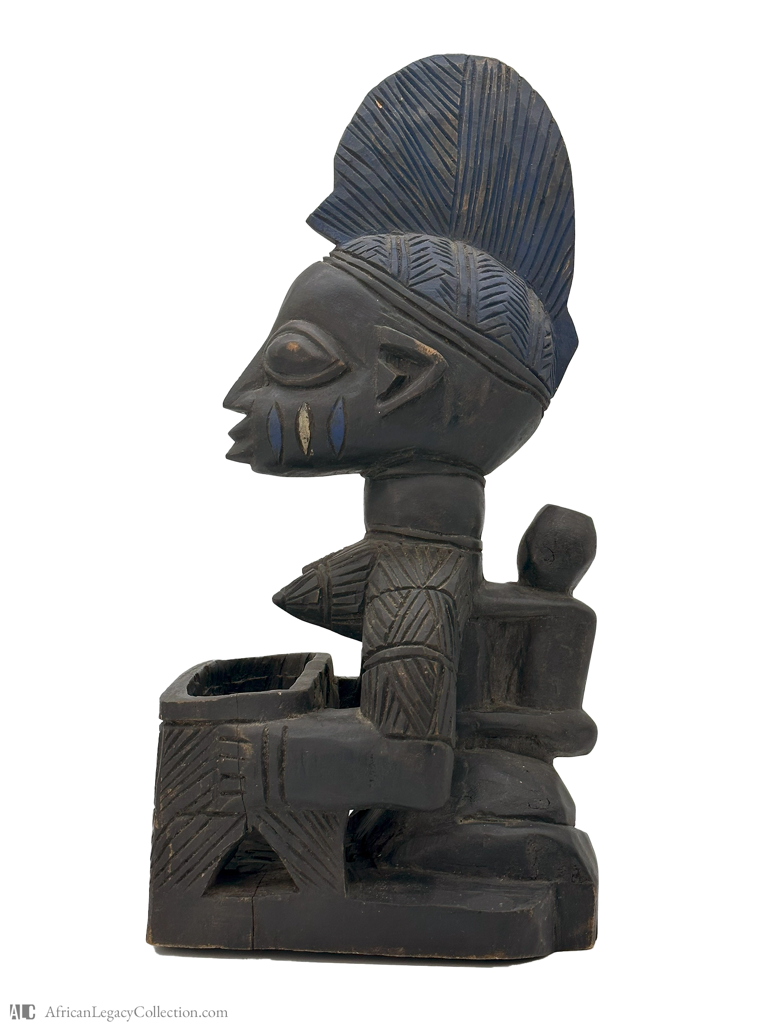 This artifact is a ceremonial stool likely originating from West Africa, specifically attributed to the Yoruba people. It serves as a significant cultural symbol, often used in rituals and as a representation of status and authority. The intricate carvings and motifs suggest its role in important social or religious ceremonies.