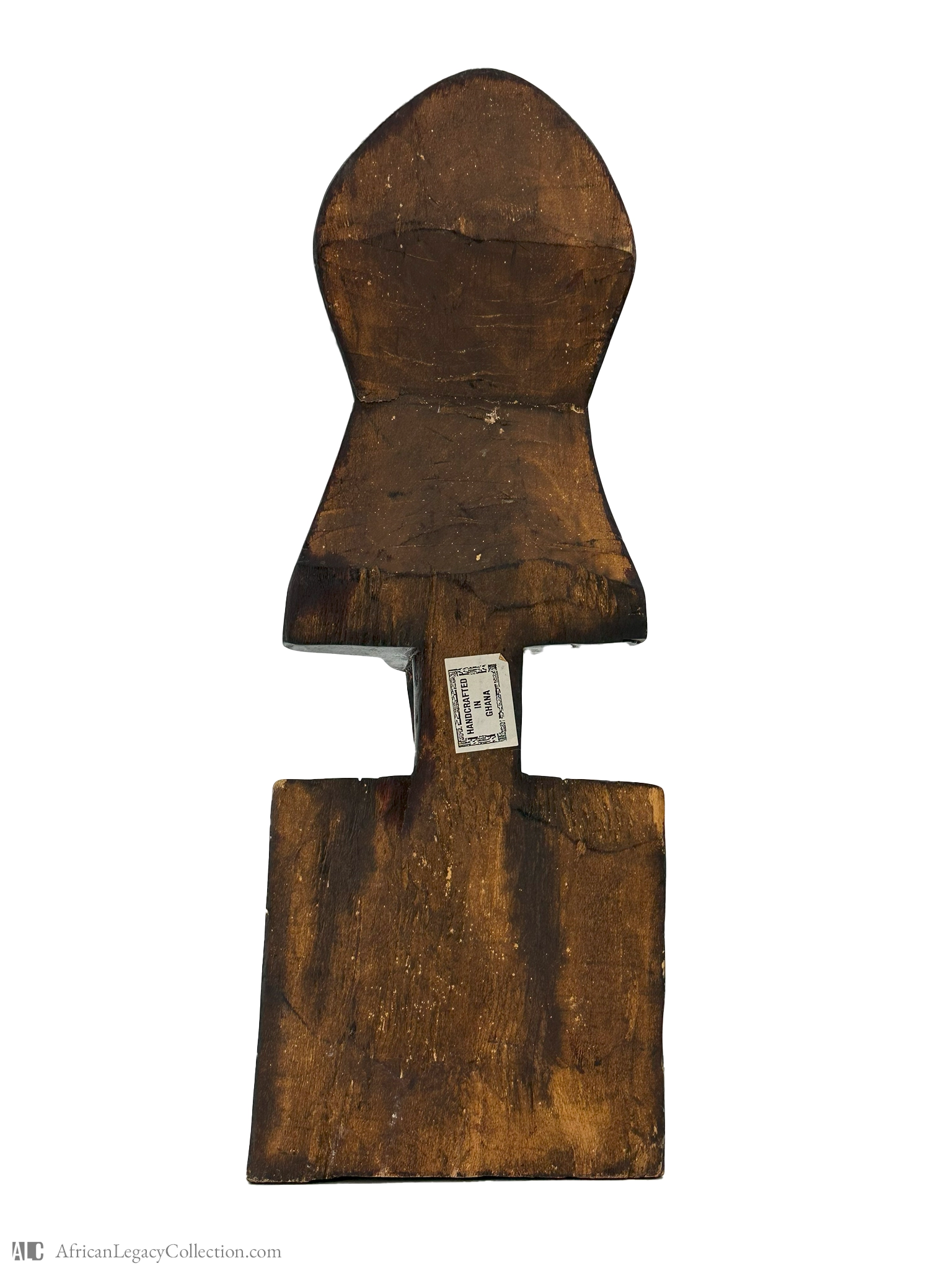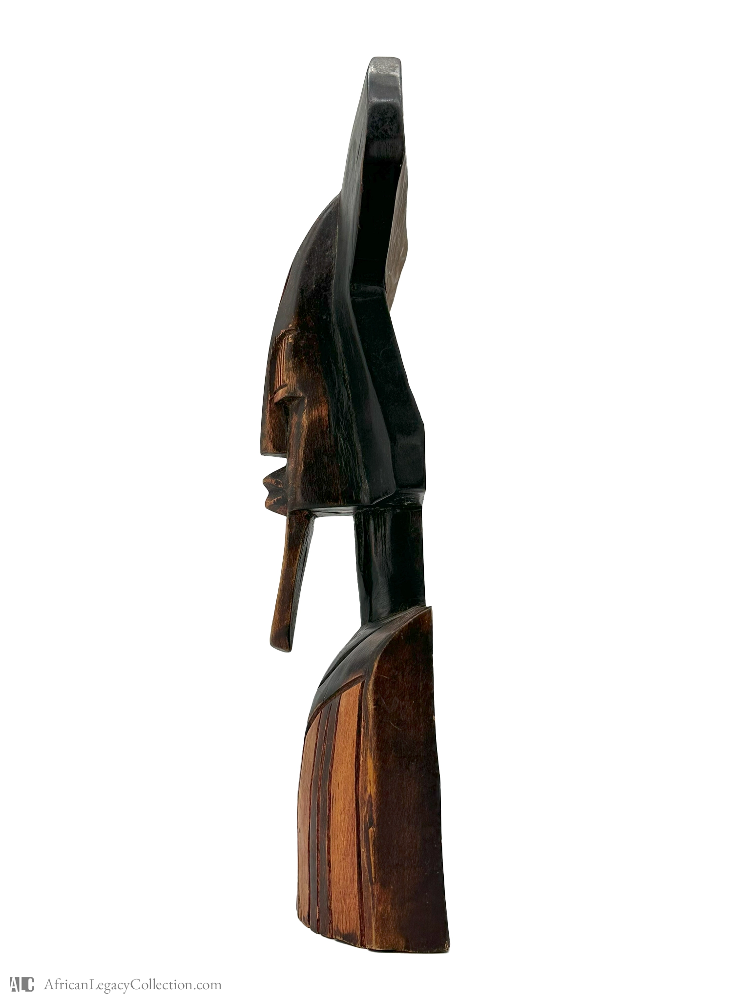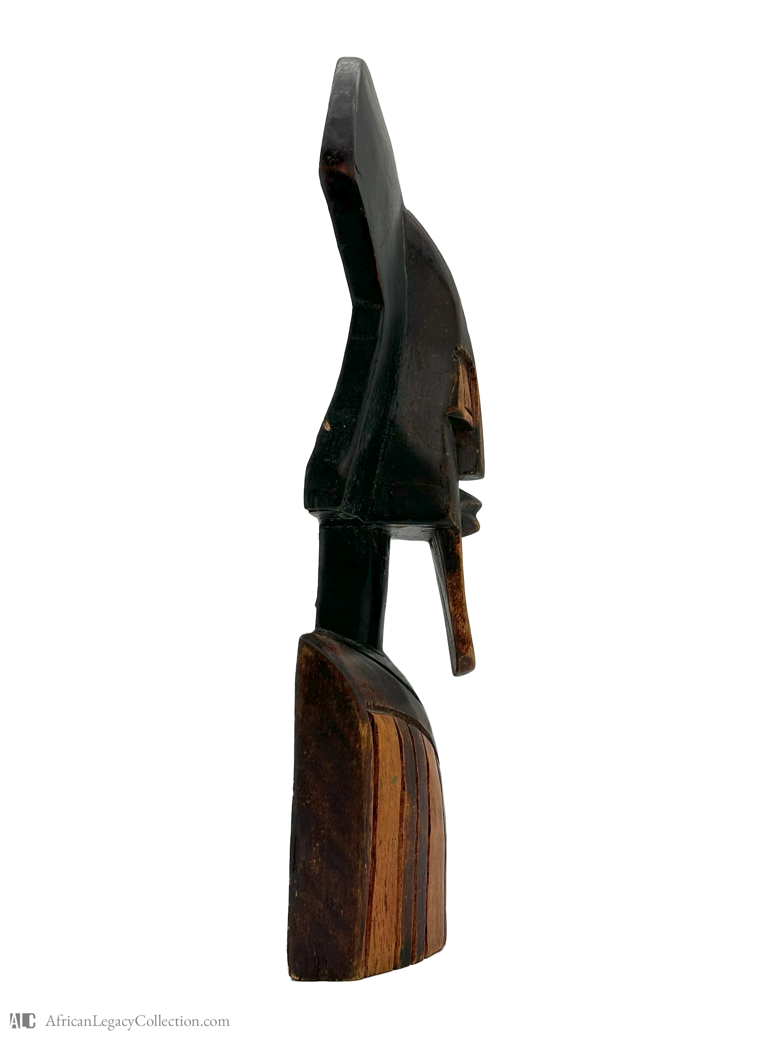 This artifact is likely a representation of a traditional African mask. The elongated face and simplistic geometric design suggest its origin in West Africa, possibly used in ceremonial contexts. Masks like these often serve as intermediaries between the spiritual and human worlds, playing a critical role in cultural rituals.