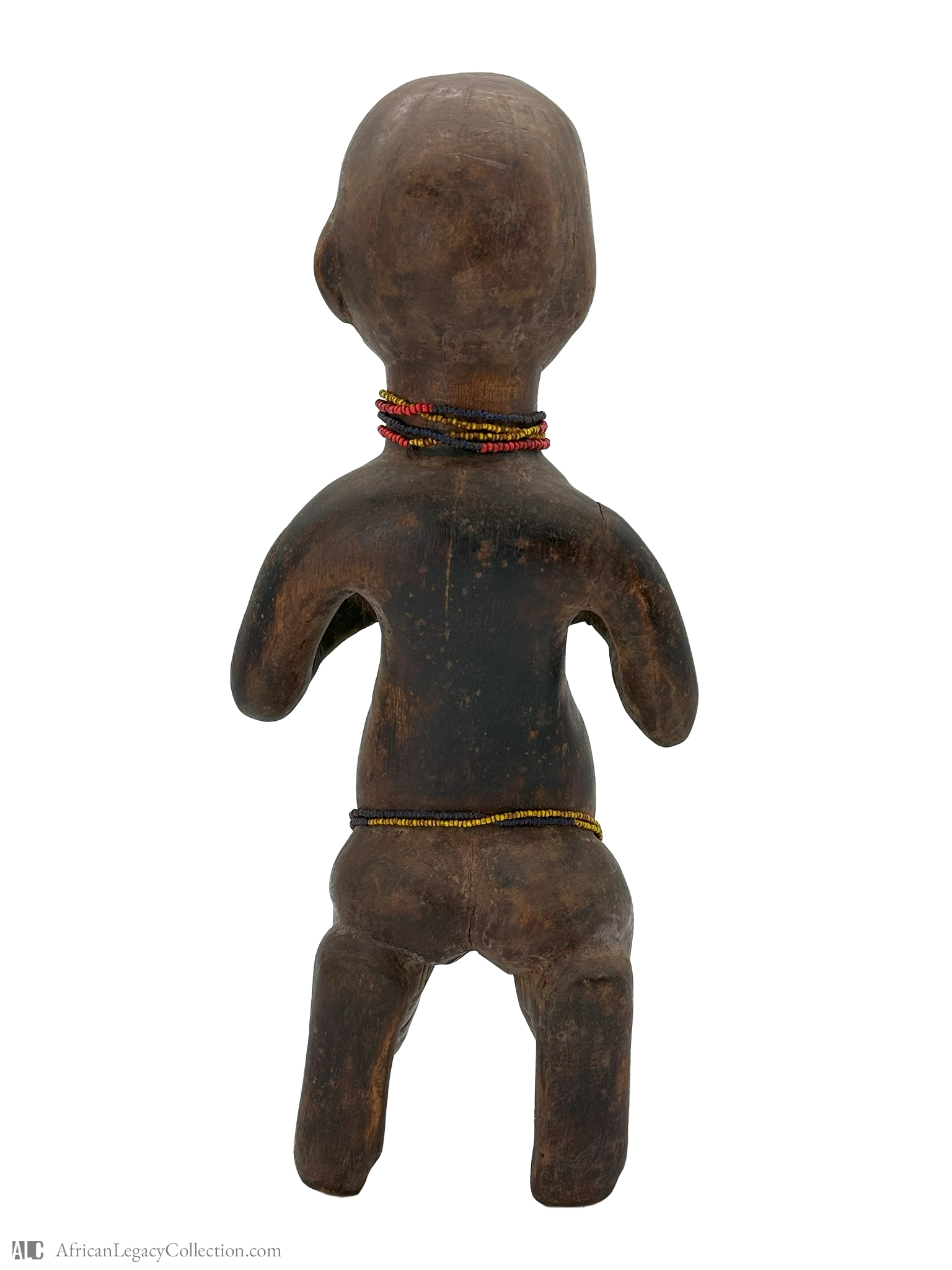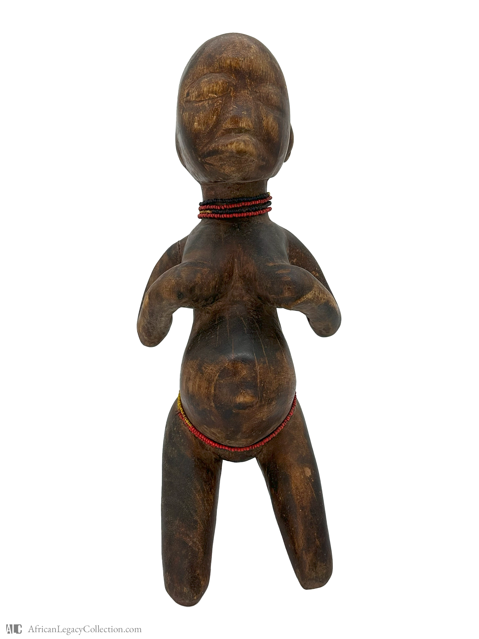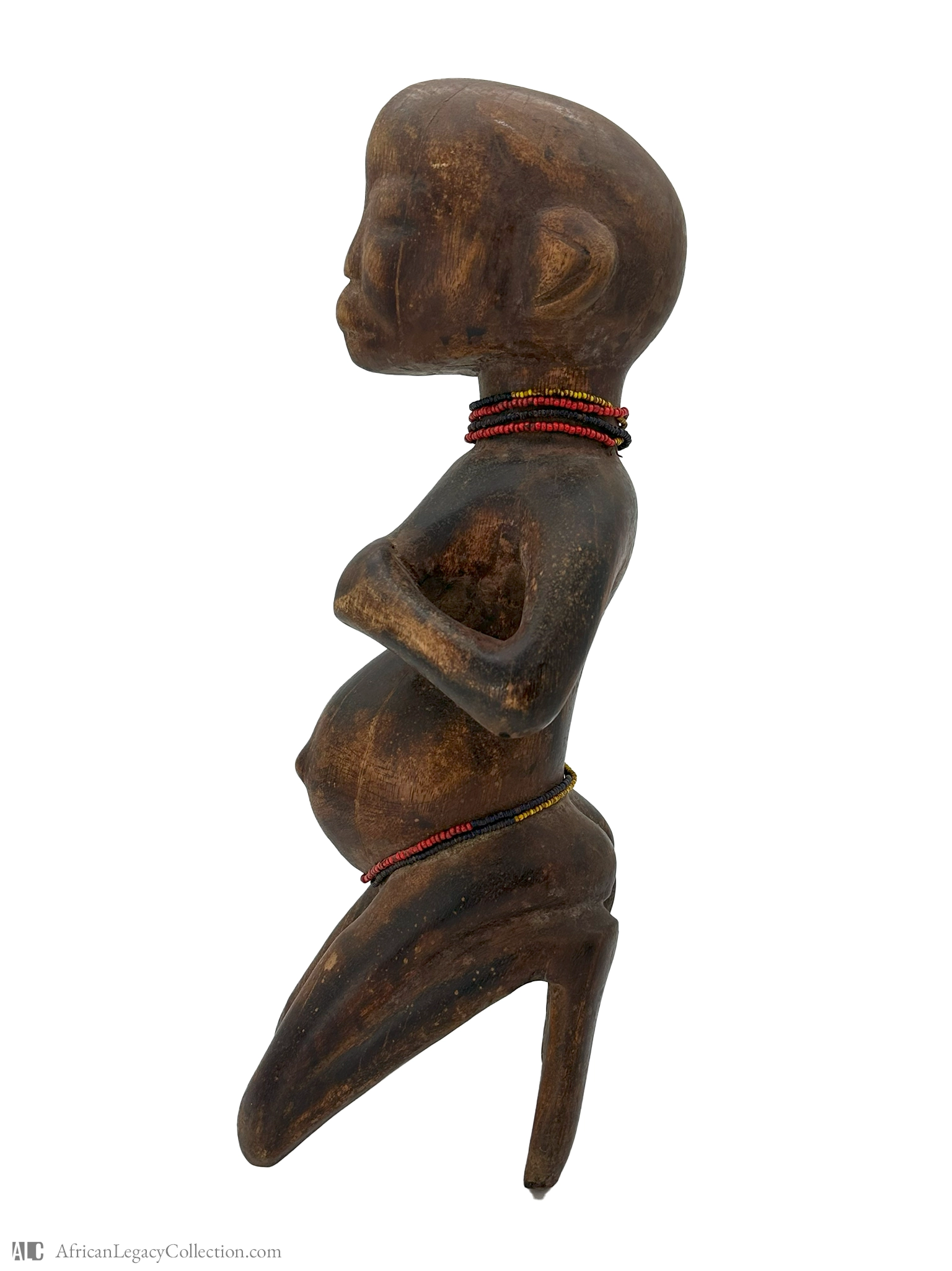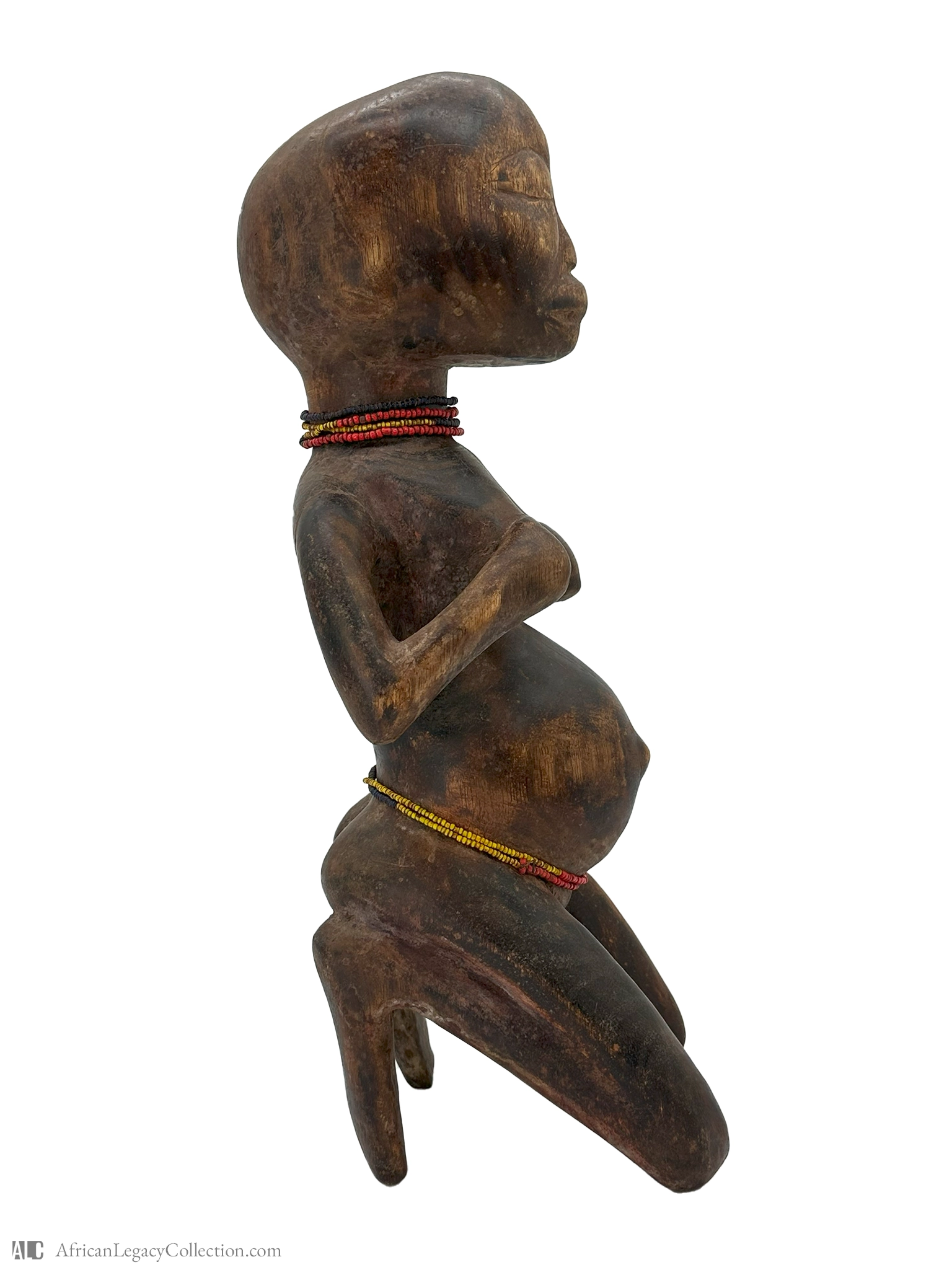 This sculpture, depicting a kneeling figure, likely represents a fertility figure from West Africa. Artifacts like this often serve ritualistic purposes, symbolizing fertility and protection during childbirth within the community.