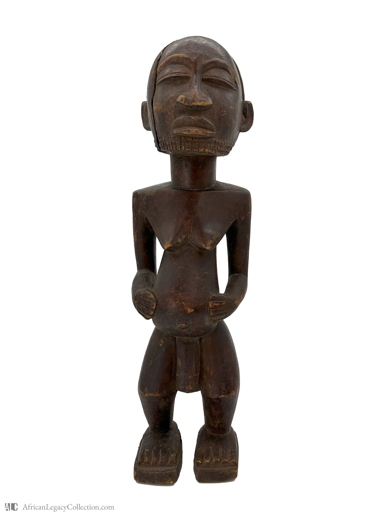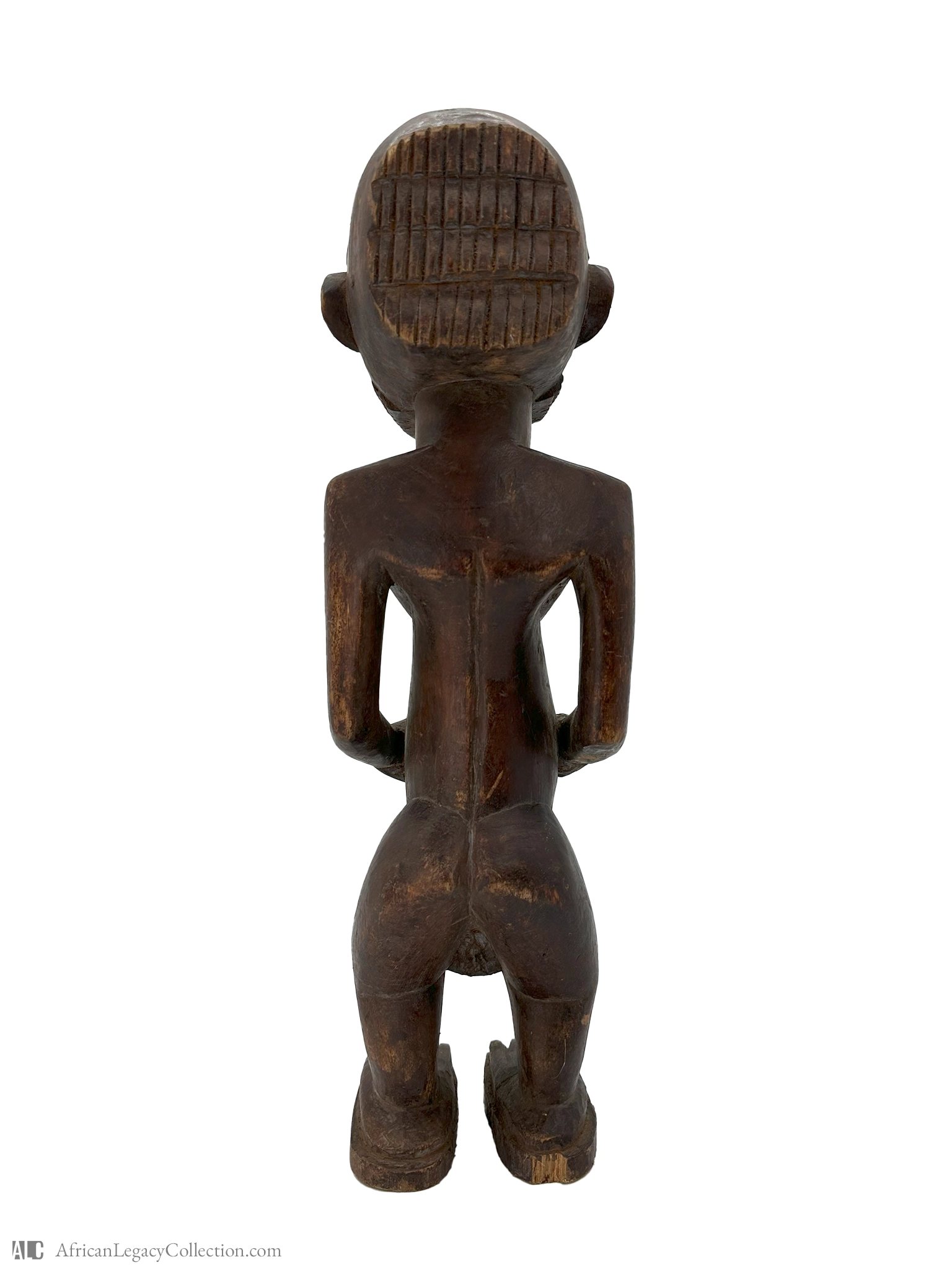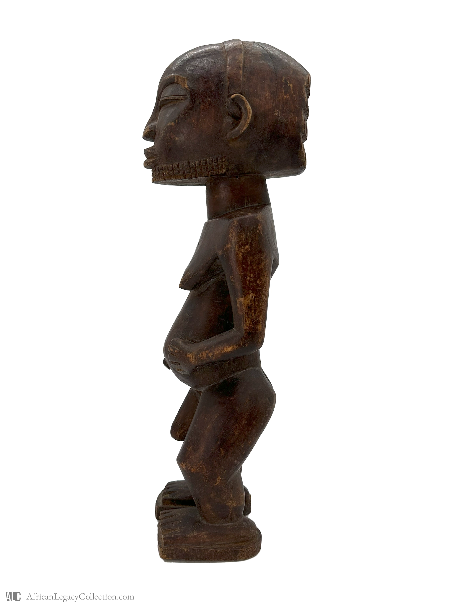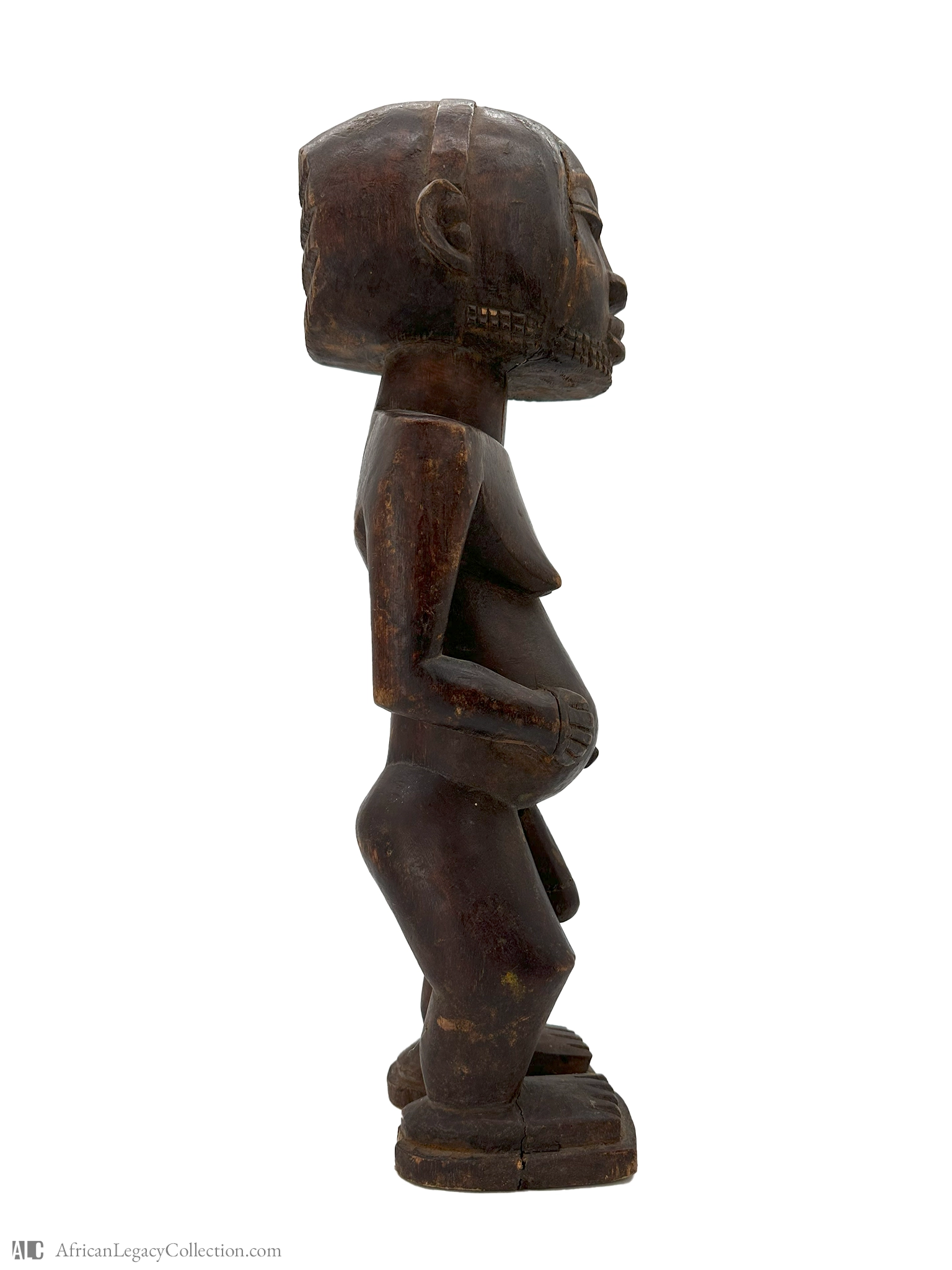 The piece is carved from hardwood, showing skillful craftsmanship. The detailed treatment of the head and body with incised patterns is characteristic of the 19th to early 20th century African artistry, serving both spiritual and cultural functions within the community.