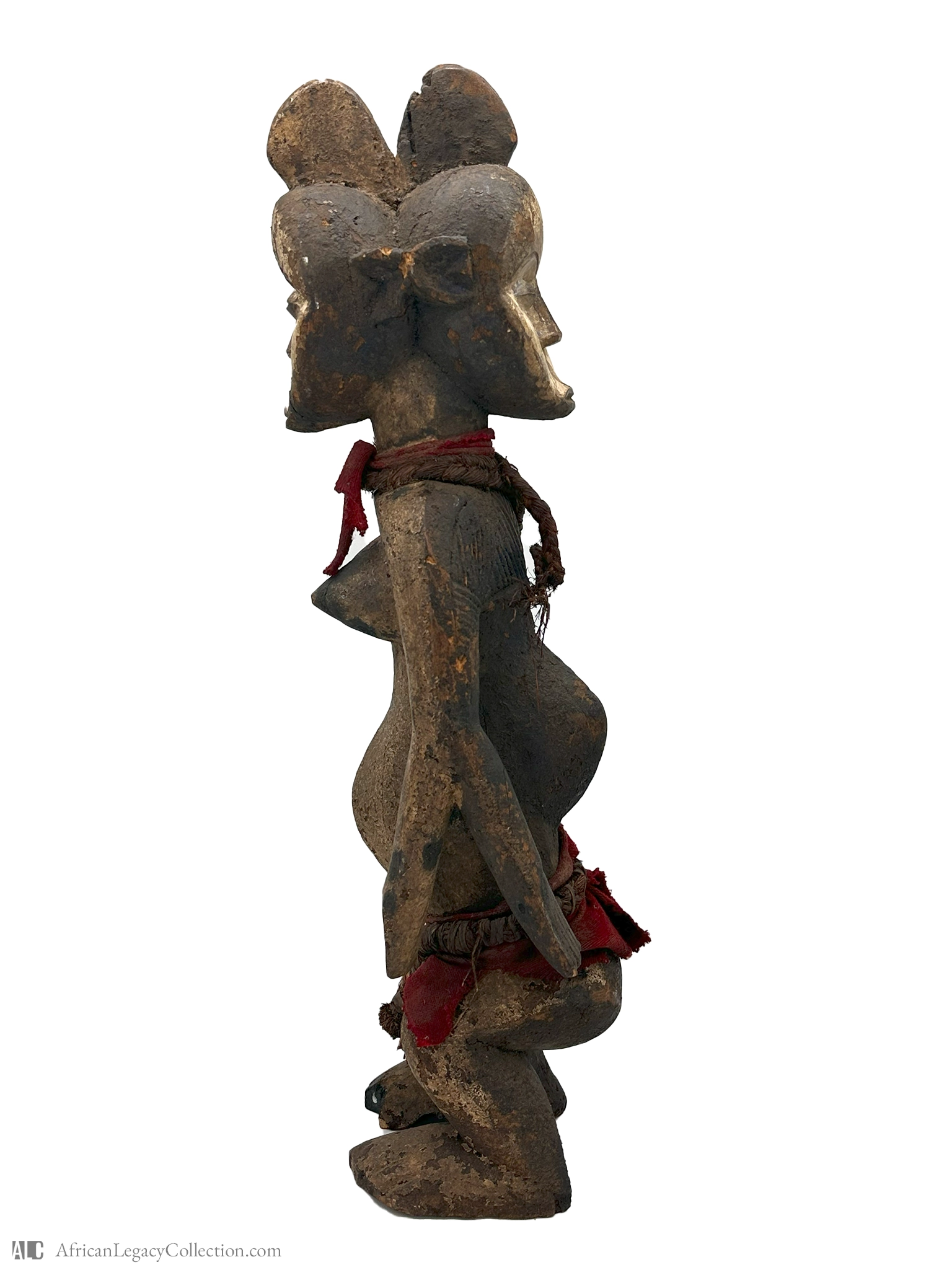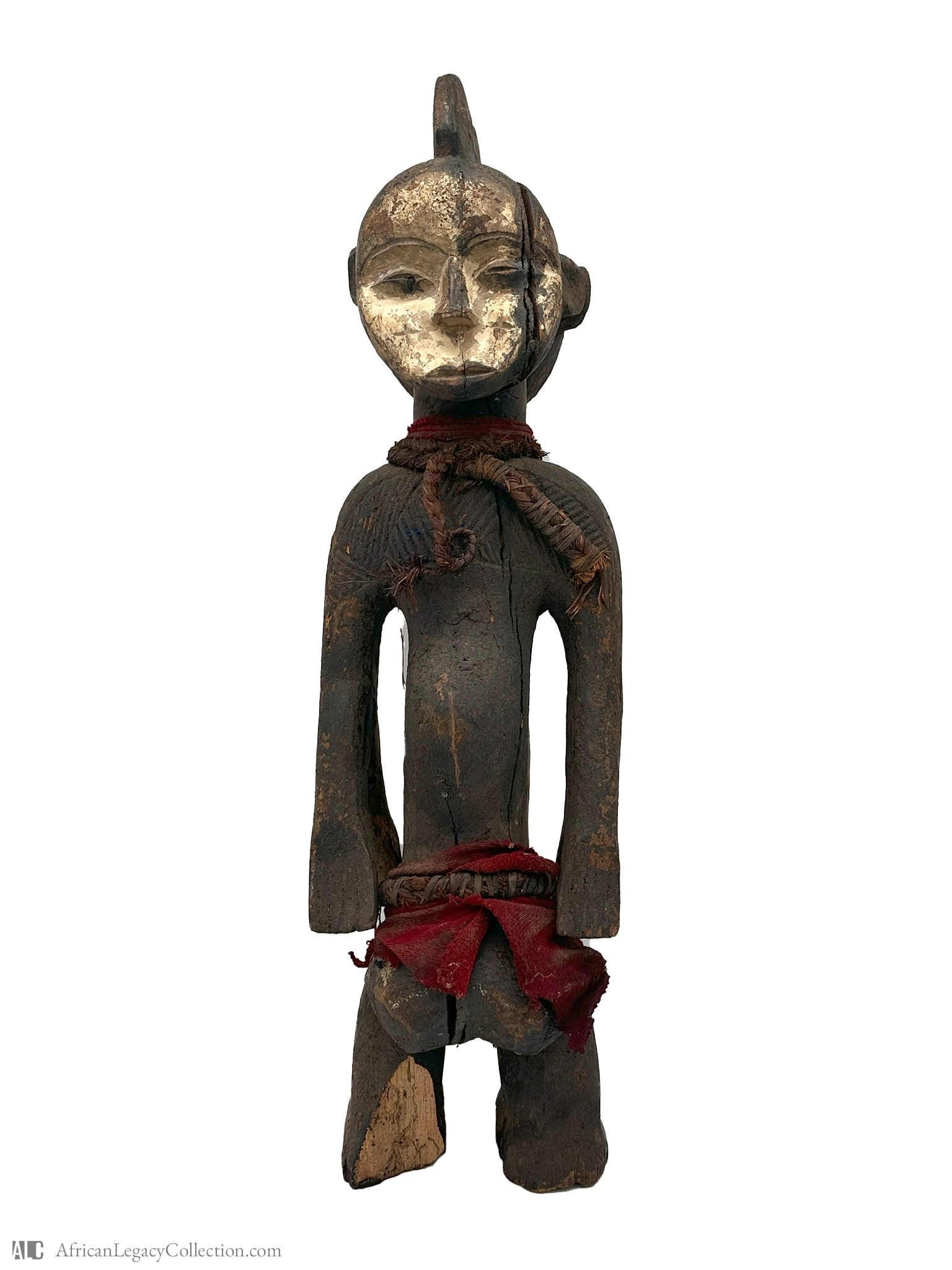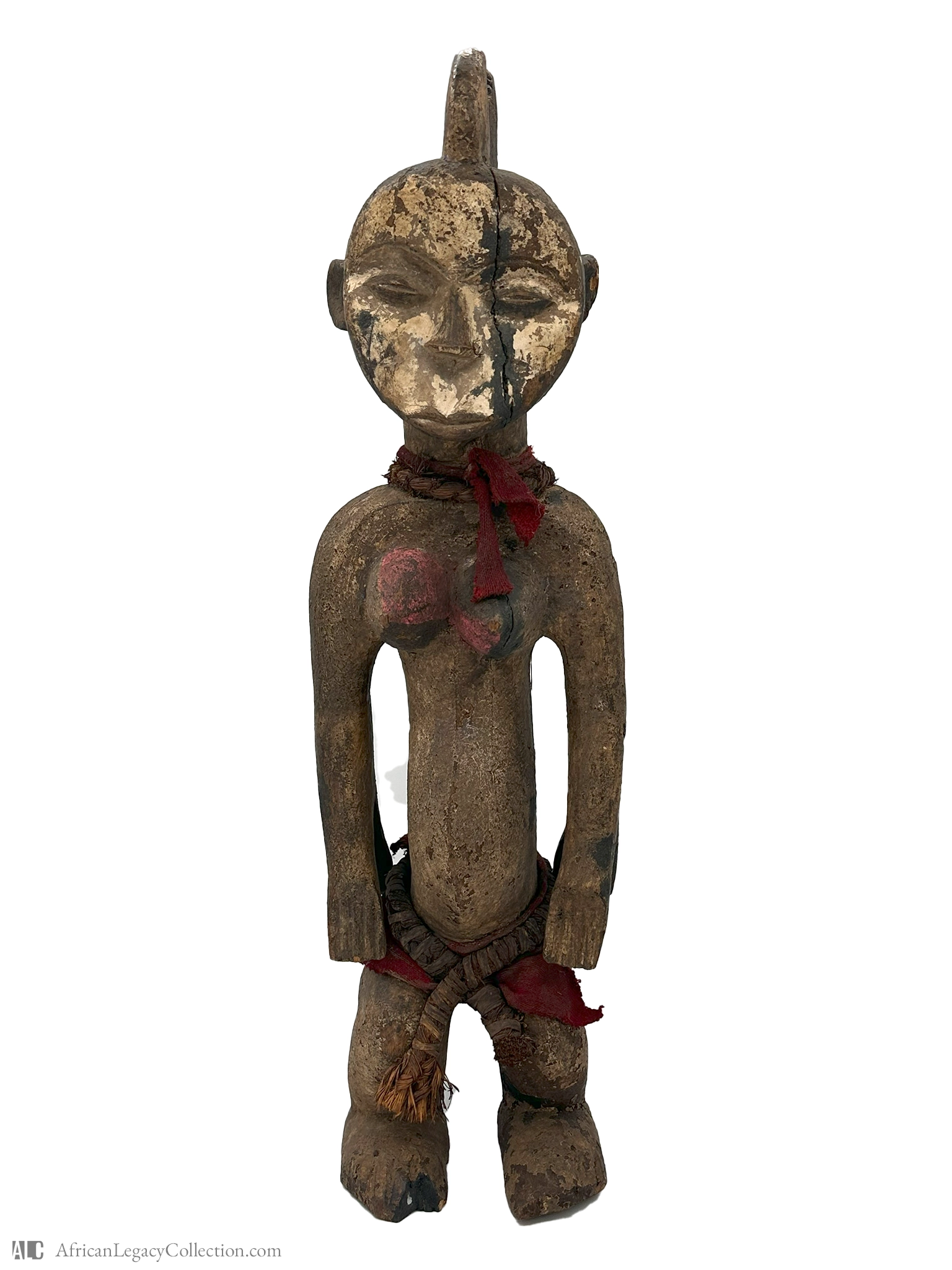 The figure is crafted primarily from wood, evident from the texture and carving style. The presence of worn patina indicates significant age and use, suggesting it might have been a part of long-standing cultural practices. The materials and craftsmanship provide insight into the historical context of the community, emphasizing the importance of ancestor veneration in their daily life.